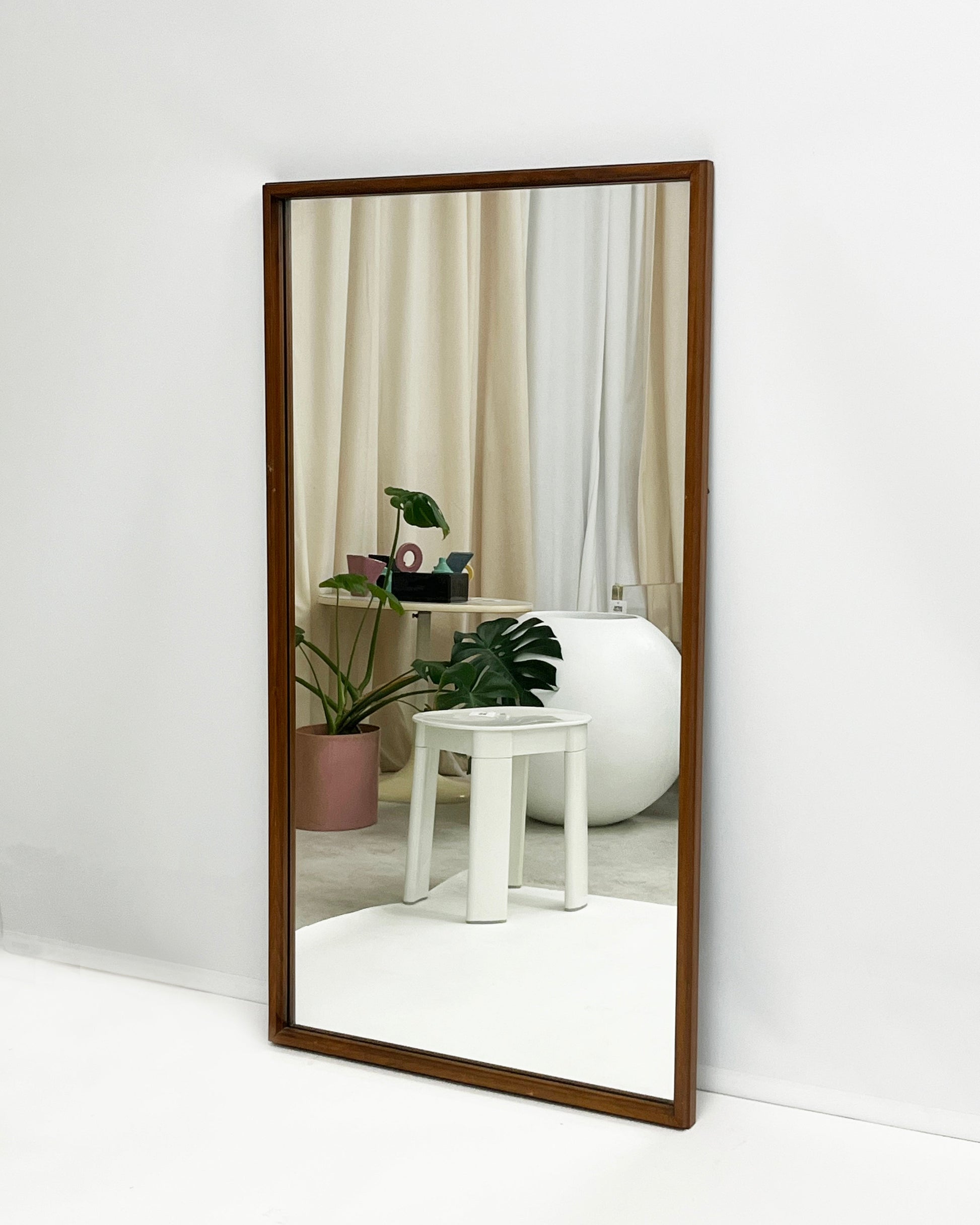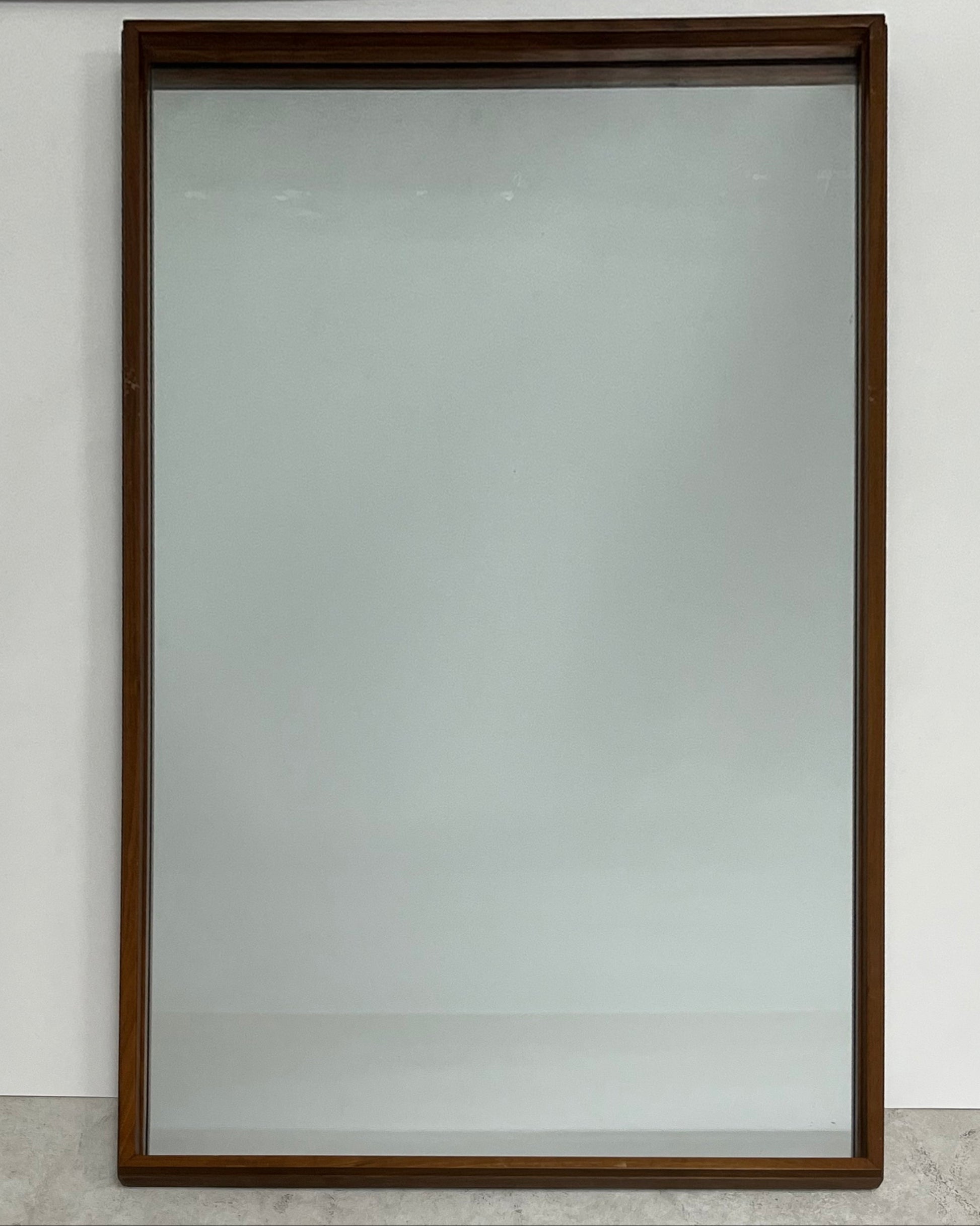 1950s classic rectangular walnut wood-framed mirror with a beveled edge. Mirror in excellent condition with minimal signs of age.