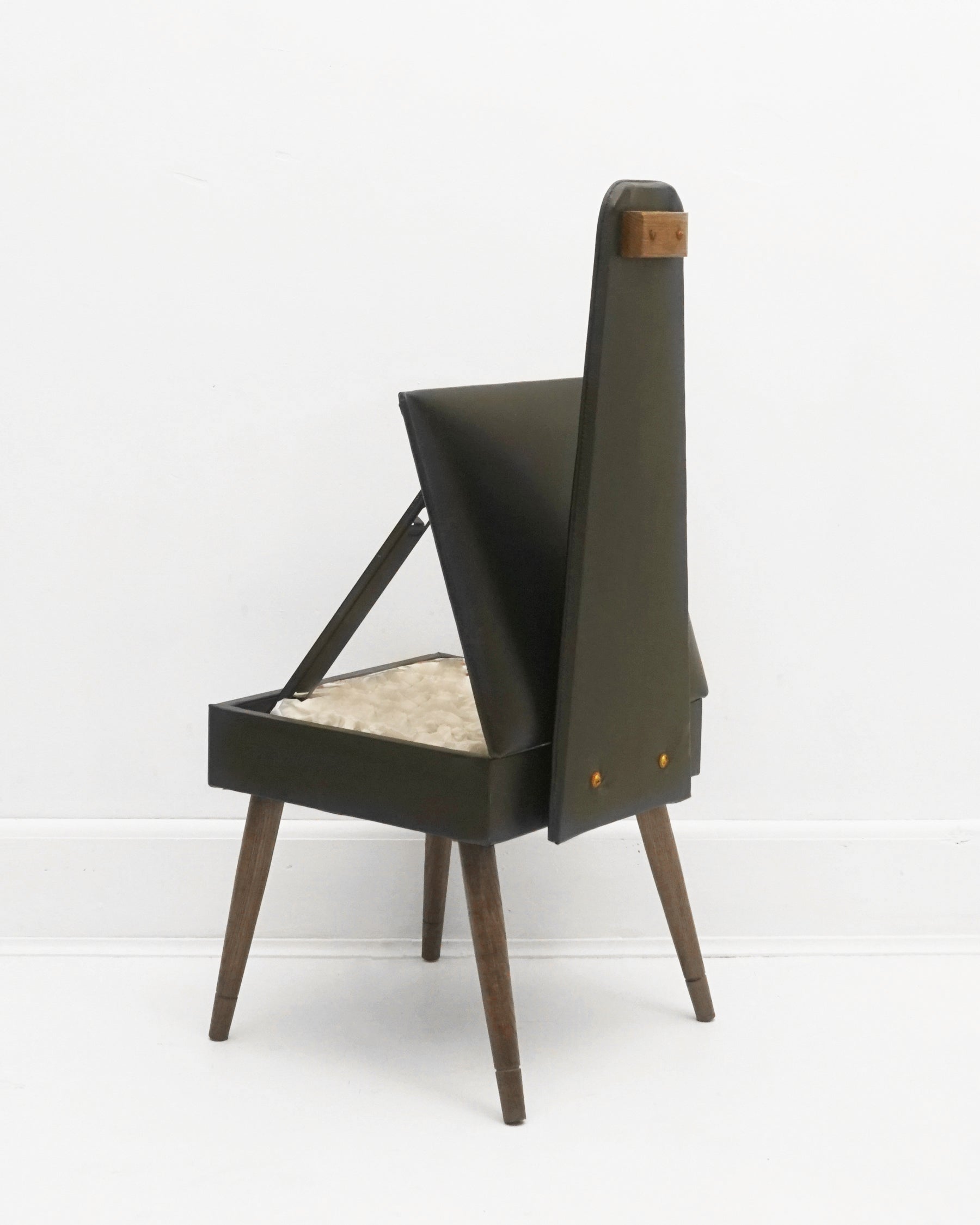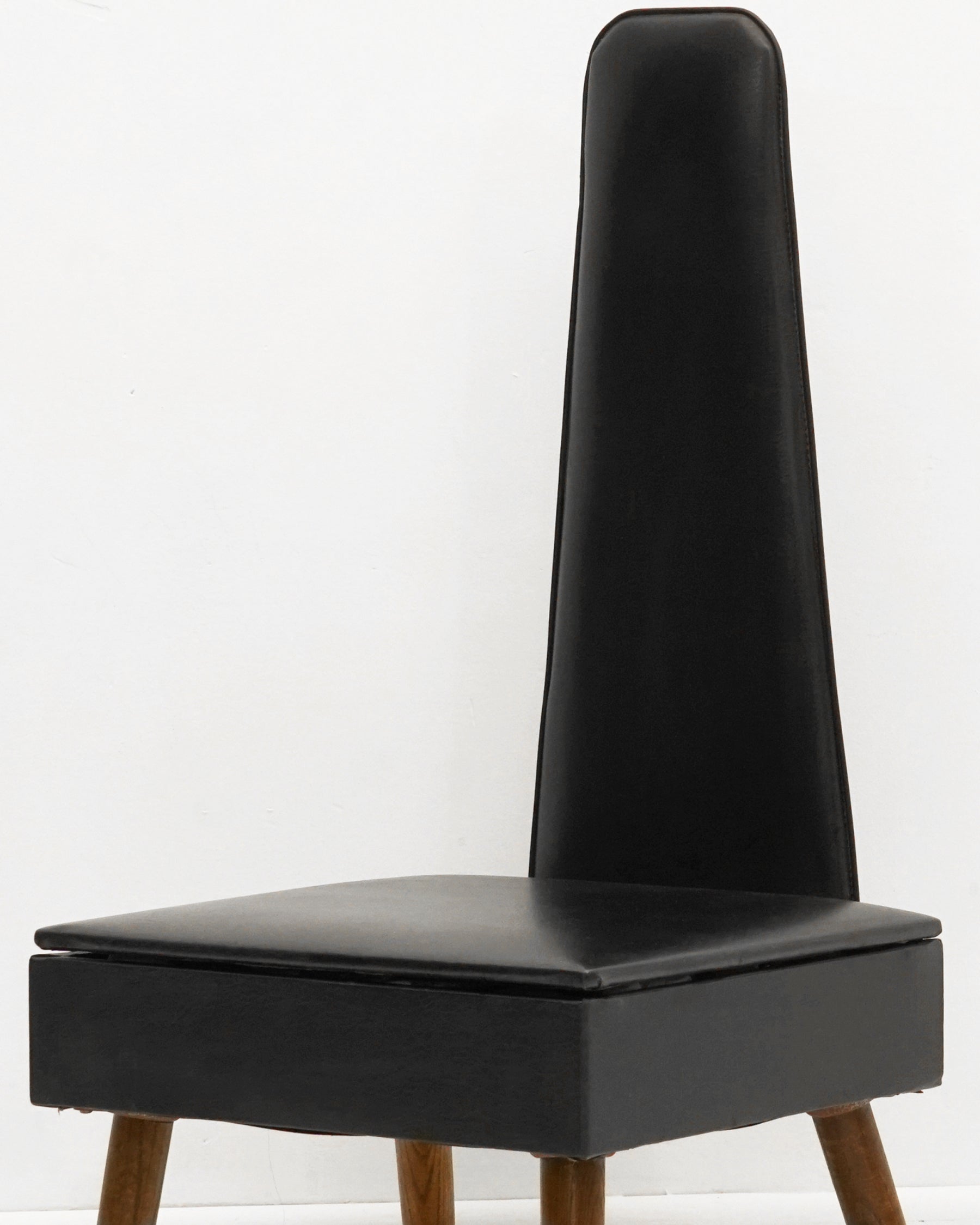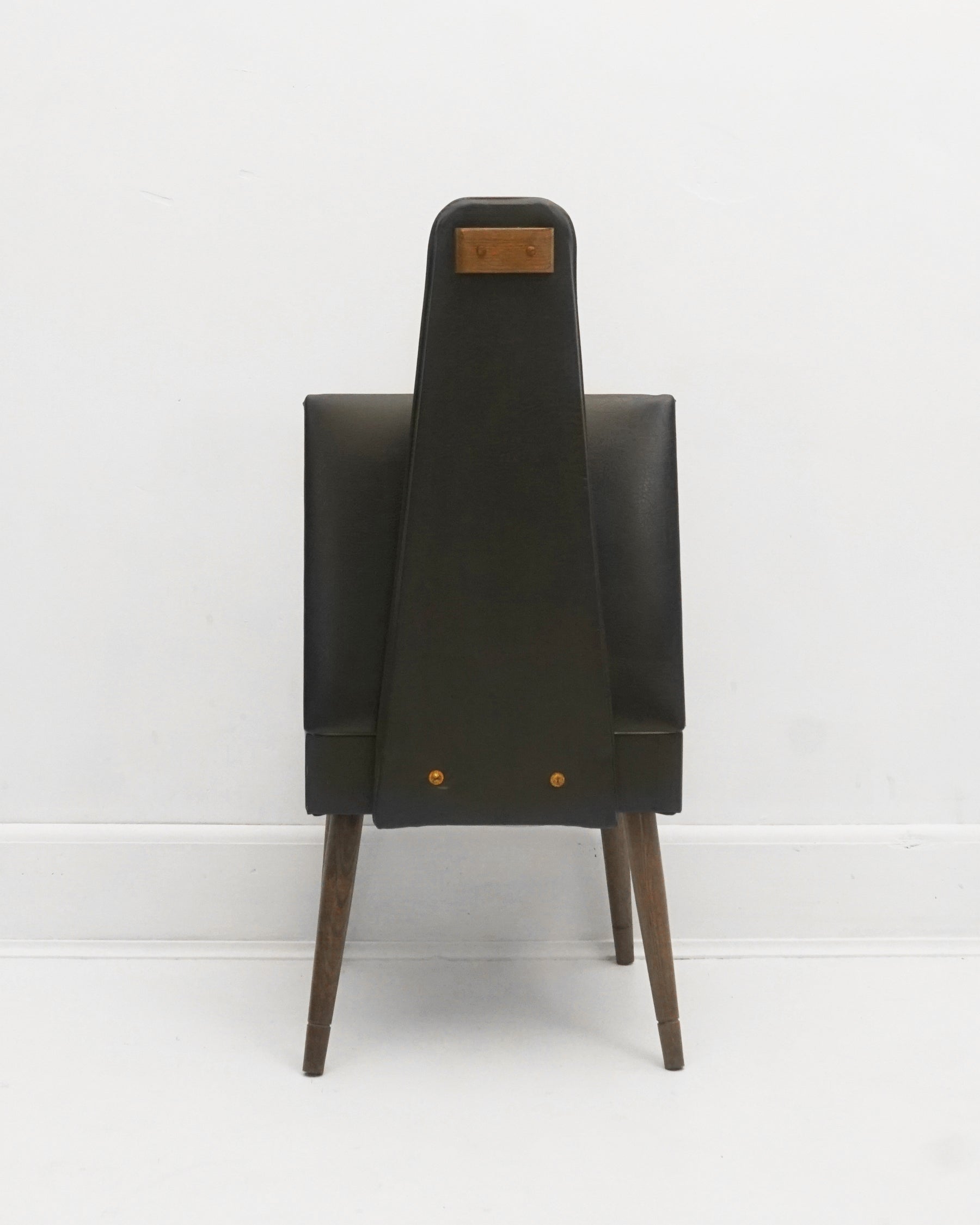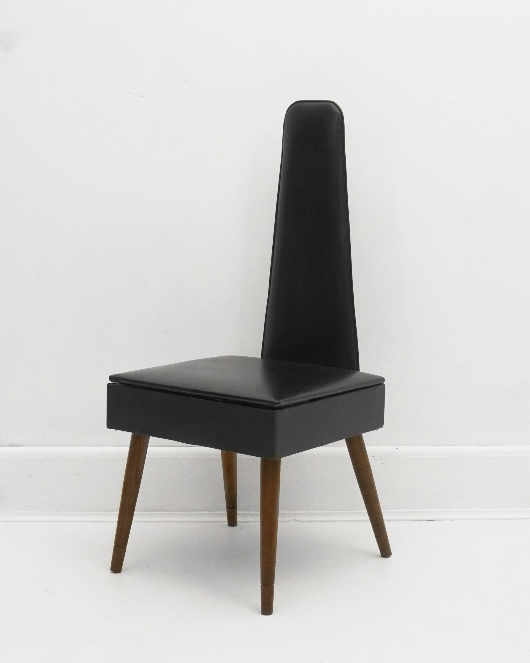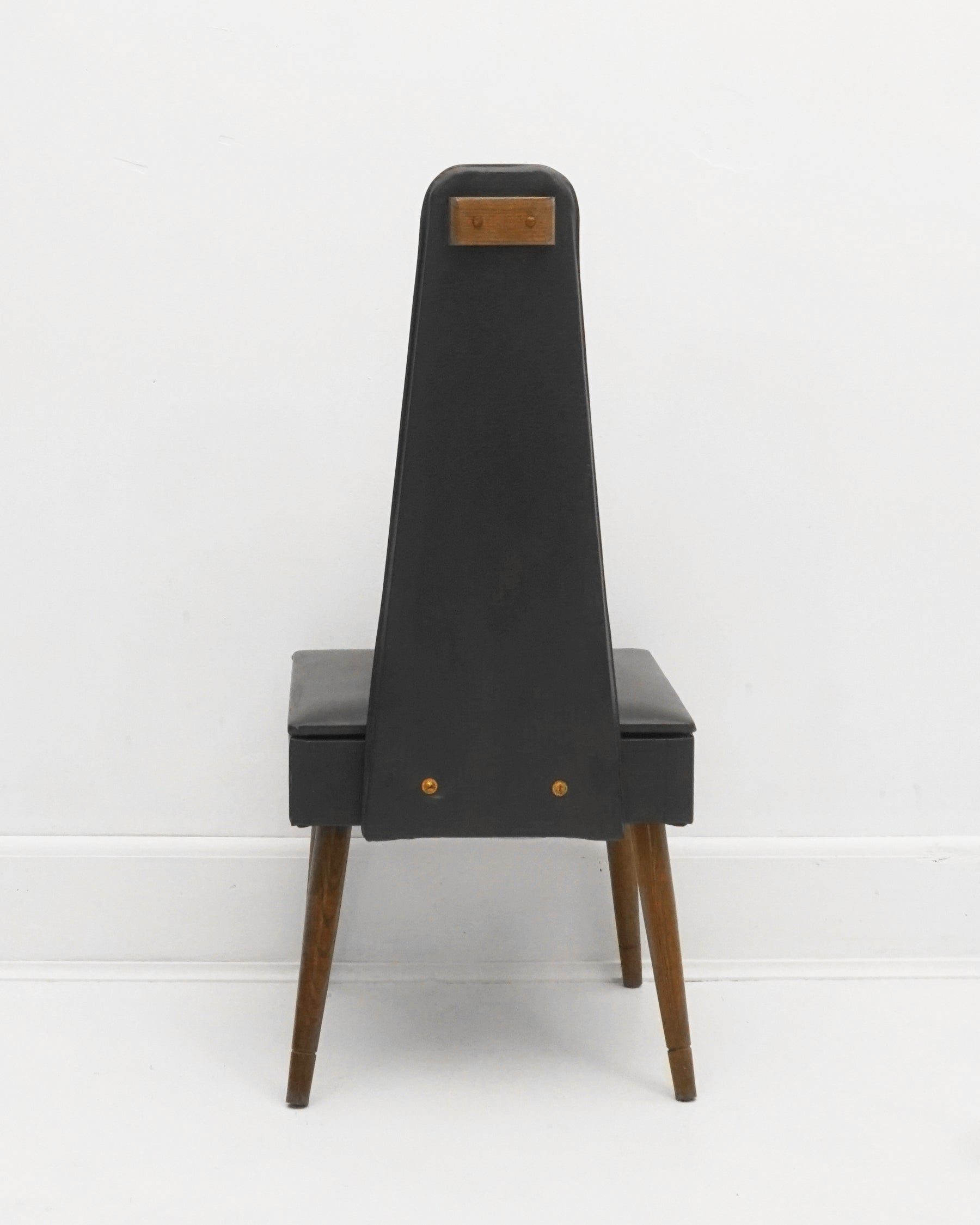 1960s black valet chair with seat storage. Vinyl is almost in perfect condition. The vinyl covered hinged seat opens to reveal a storage compartment. Wooden tapered legs. Great condition with very minor wear due to age and use. Originally designed for traveling salesmen to keep their suits fresh for the next days’ work. Missing hanger in bag of chair, so price reflects this.