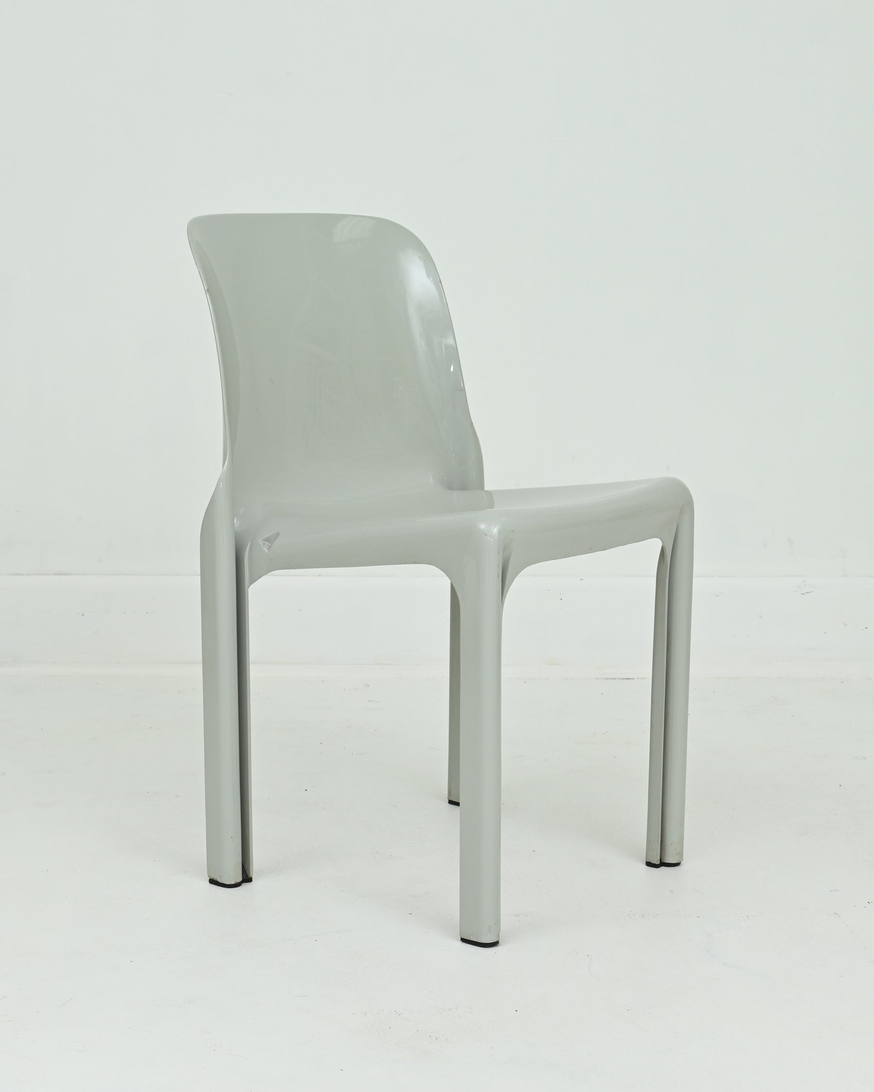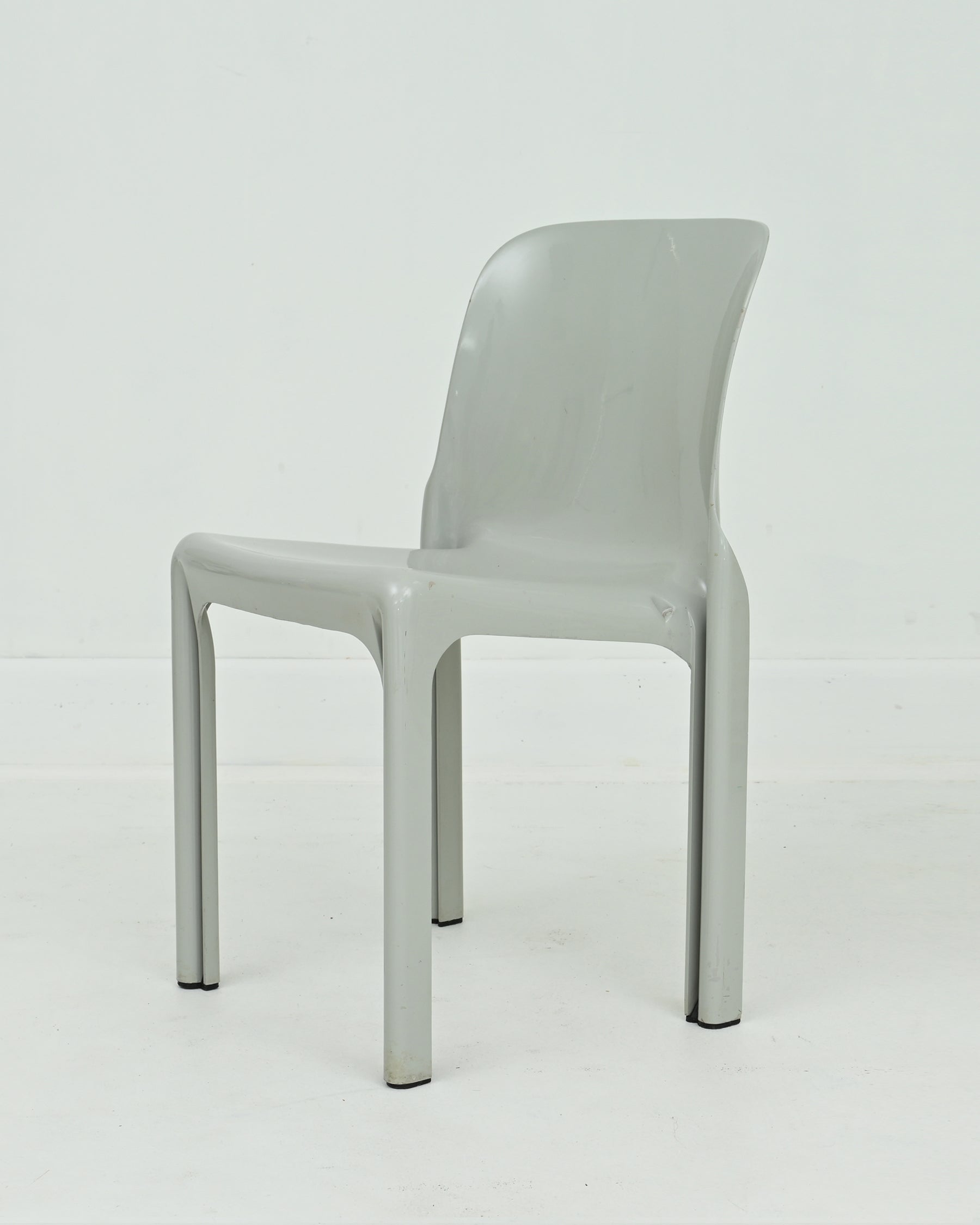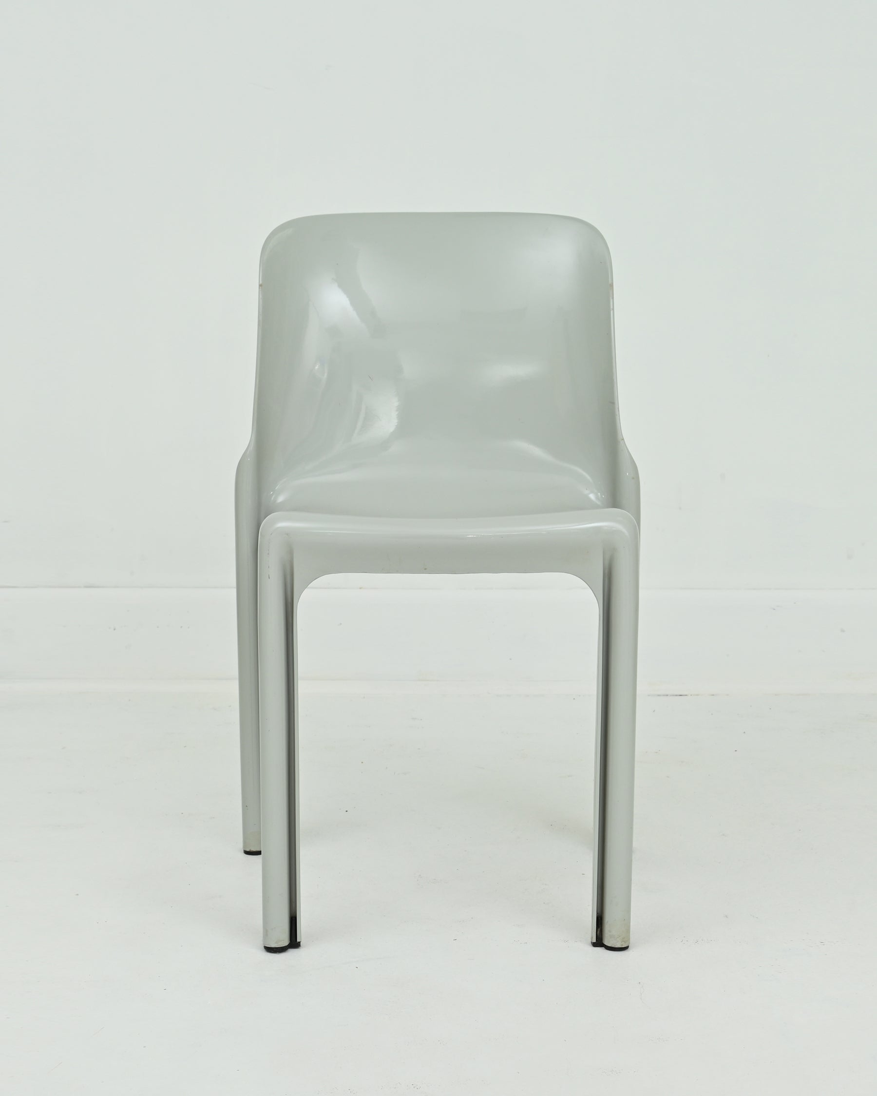 1960s grey Selene chair by Vico Magistretti for Artemide. These chairs were molded out of grey fiberglass-reinforced plastic as single pieces. Stackable and suitable for both indoor and outdoor use. Very good condition with some wear from age. Part of the permanent collection of the Museum of Modern Art in New York. Three available and sold individually.