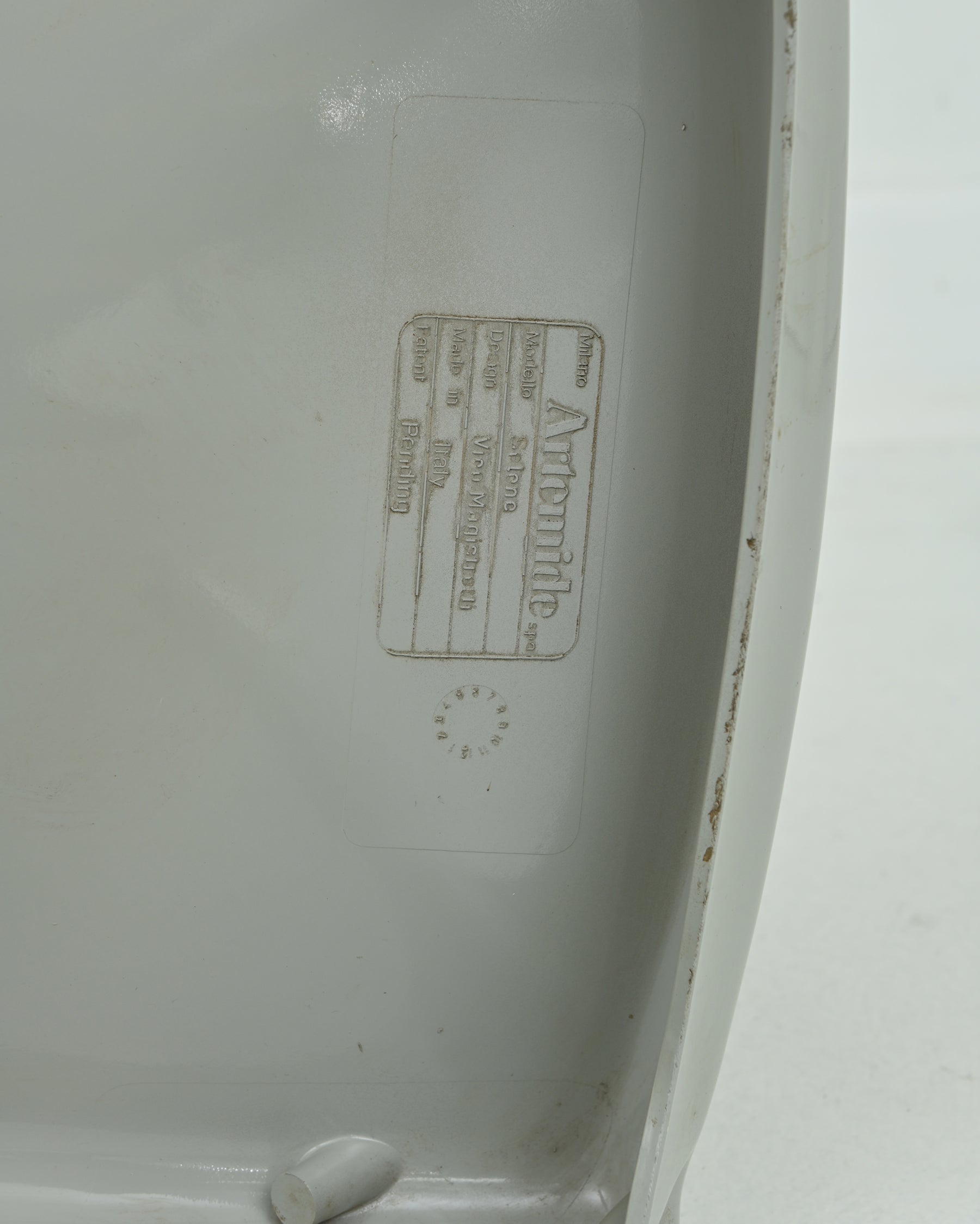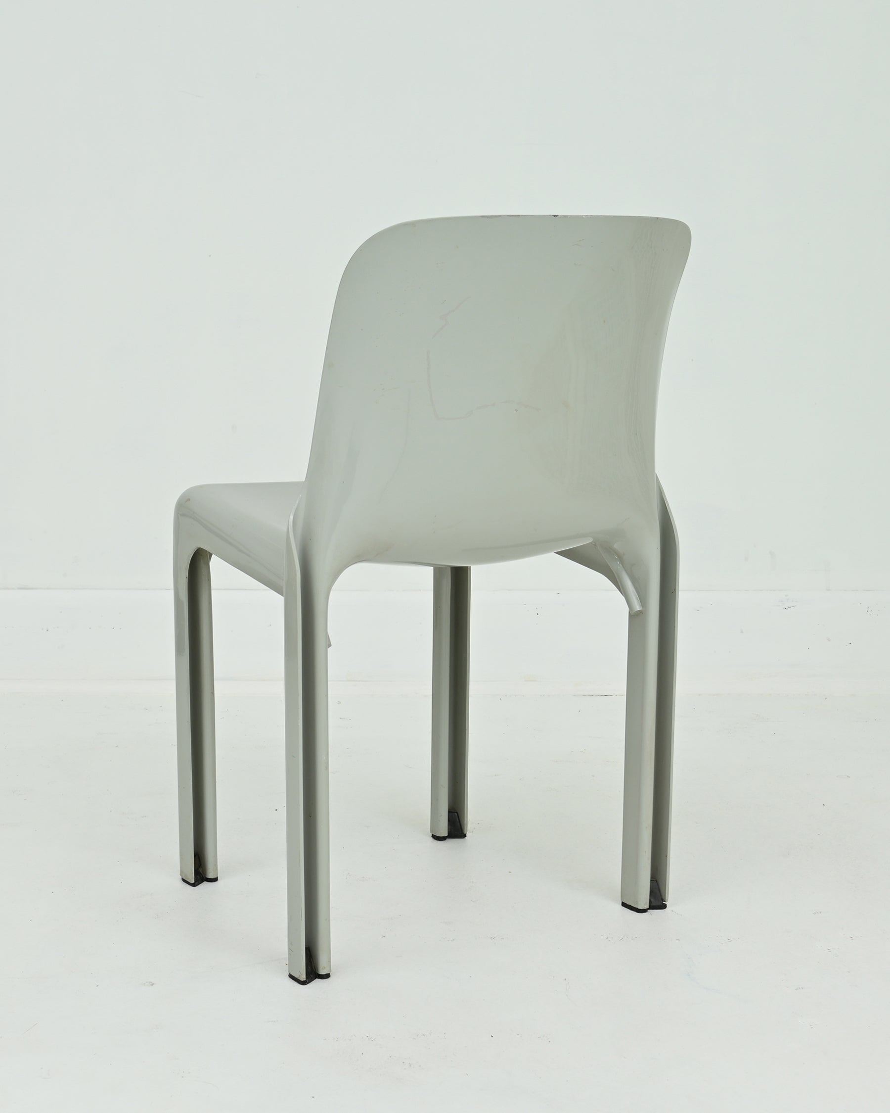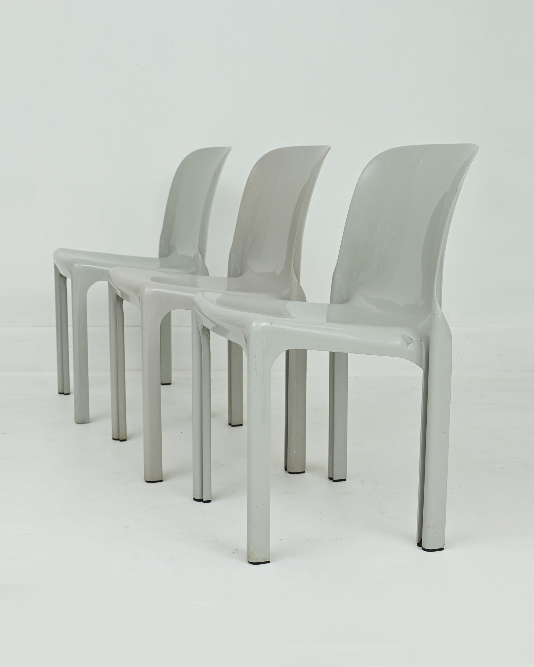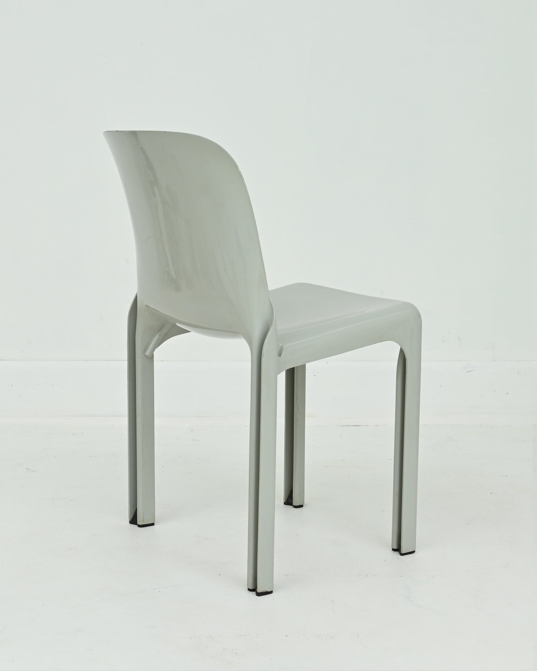 1960s grey Selene chair by Vico Magistretti for Artemide. These chairs were molded out of grey fiberglass-reinforced plastic as single pieces. Stackable and suitable for both indoor and outdoor use. Very good condition with some wear from age. Part of the permanent collection of the Museum of Modern Art in New York. Three available and sold individually.