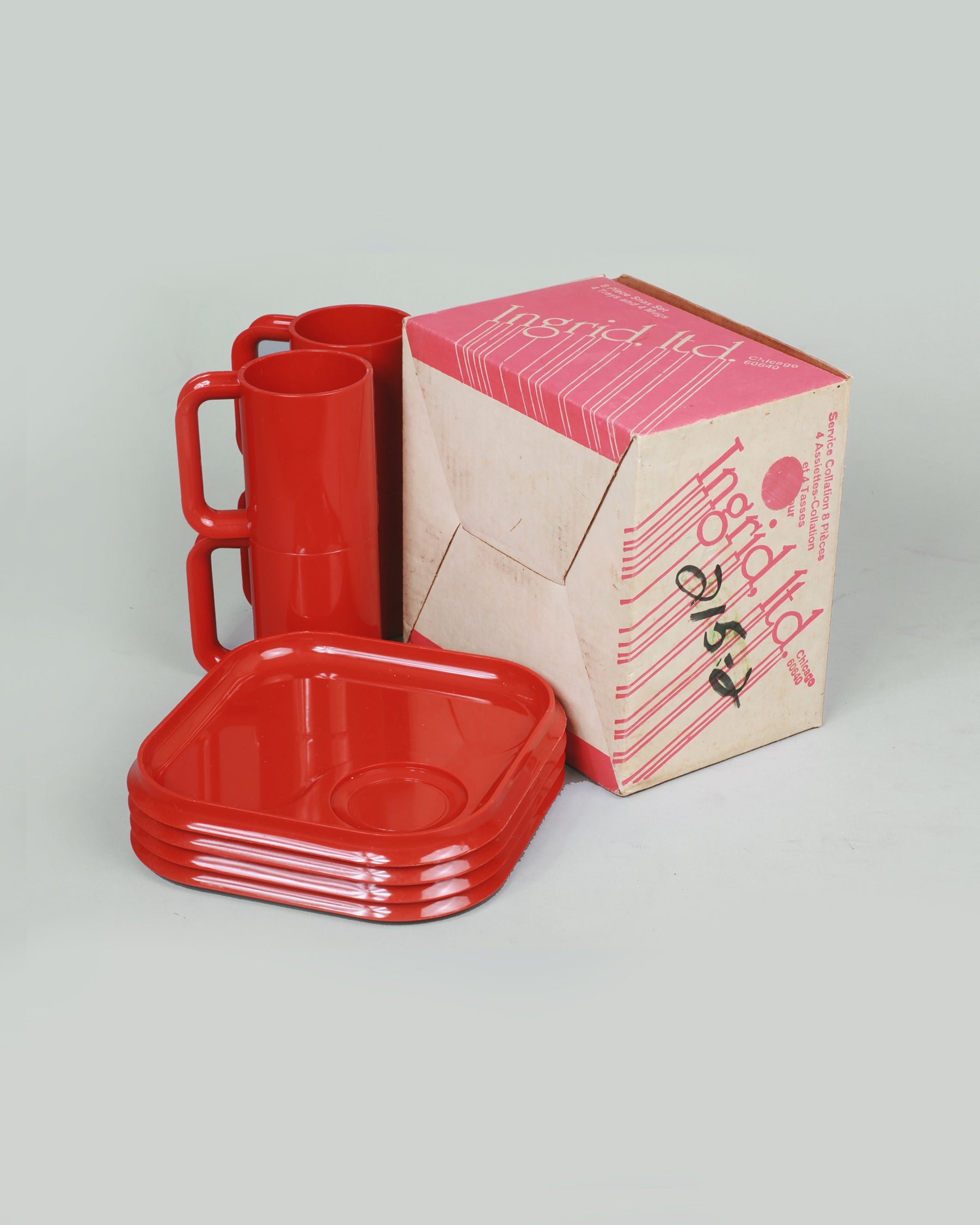 1960s Ingrid Limited set of four snack plates and four mugs. Gorgeous box design.