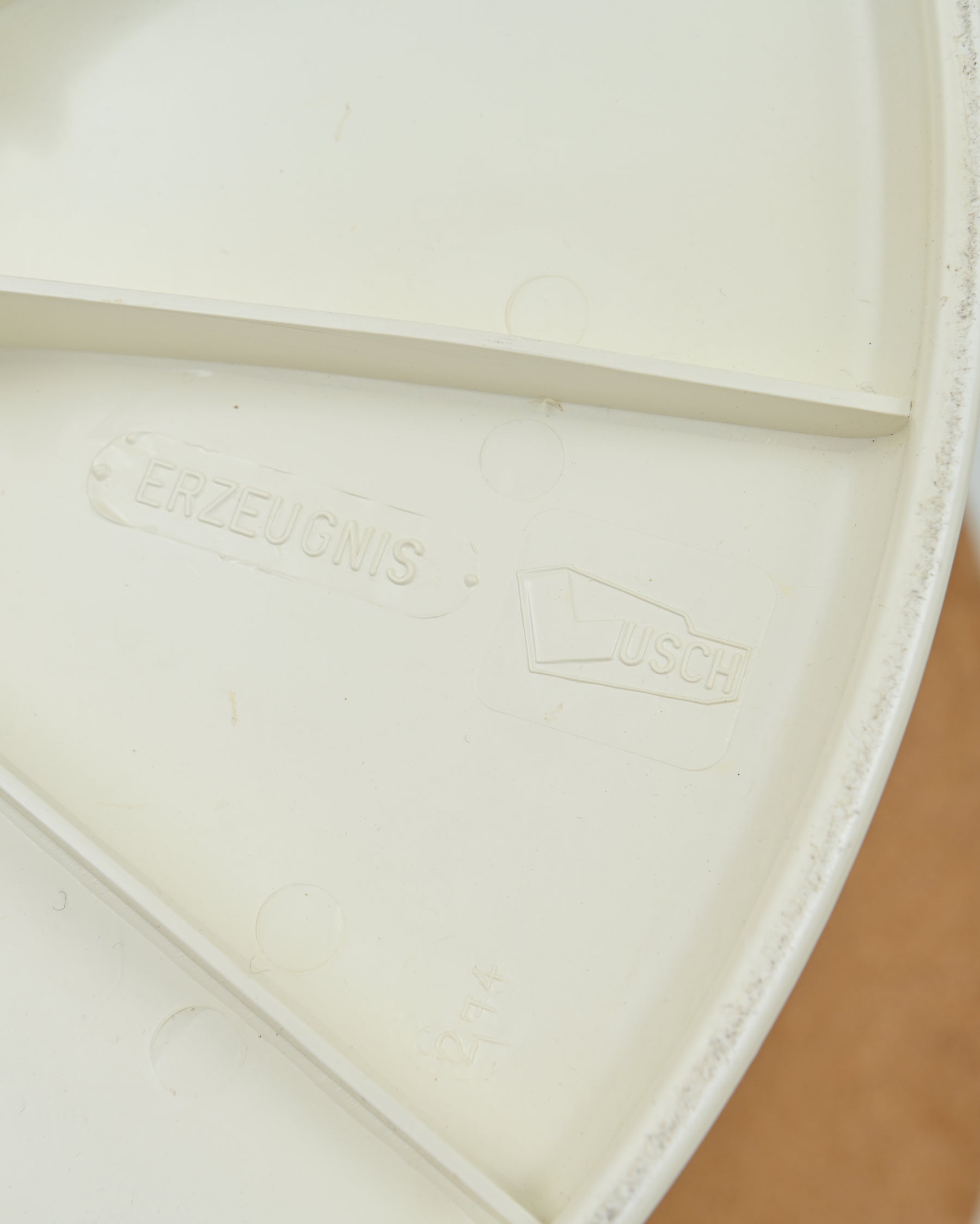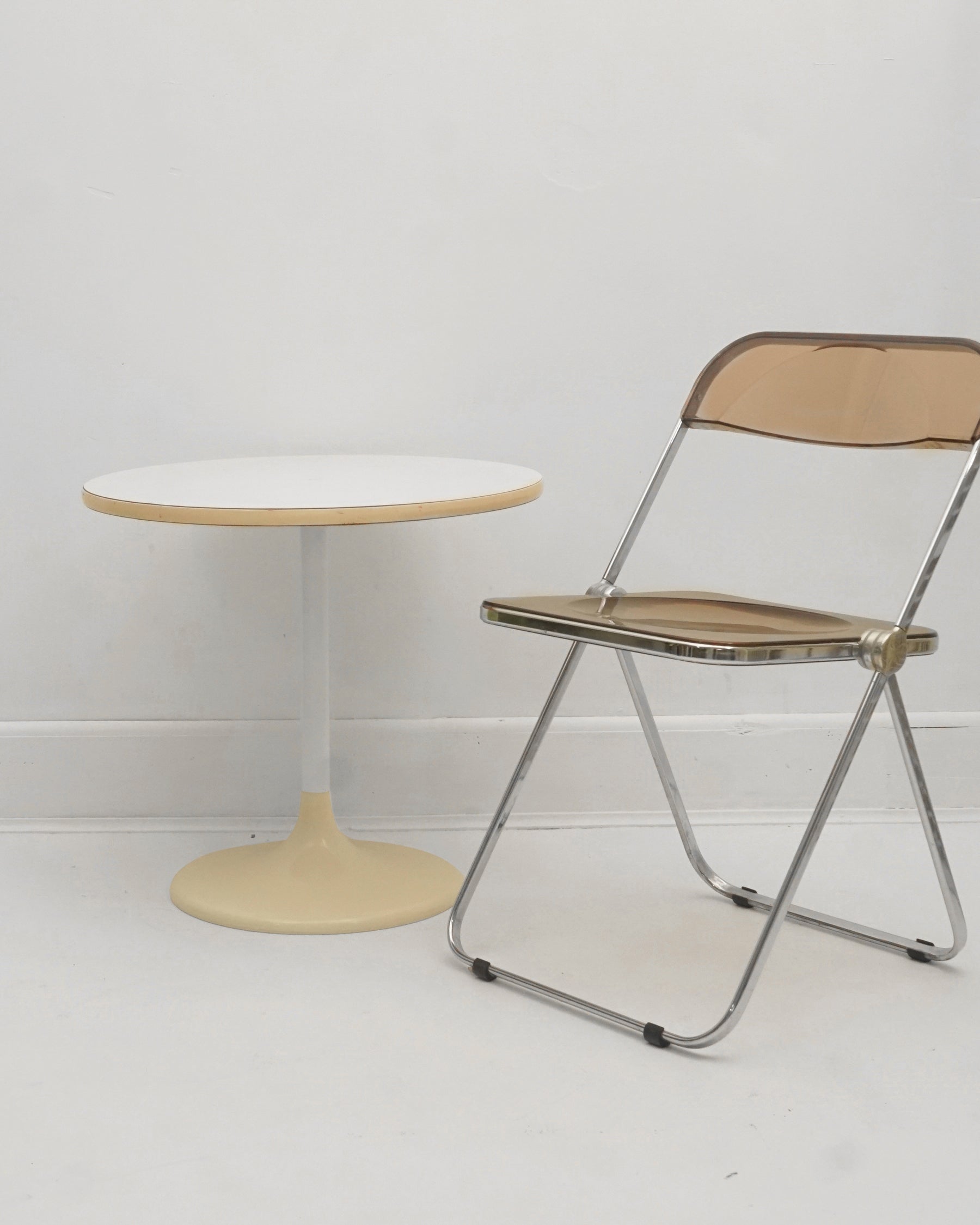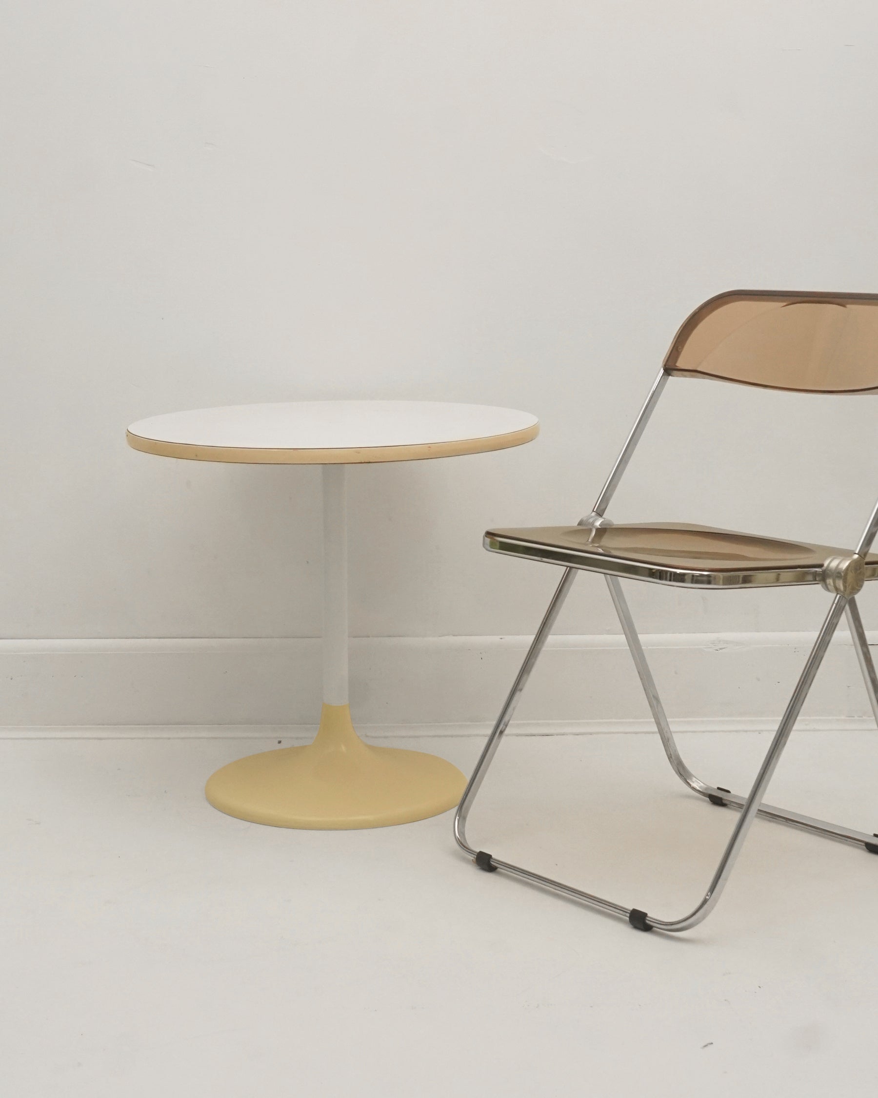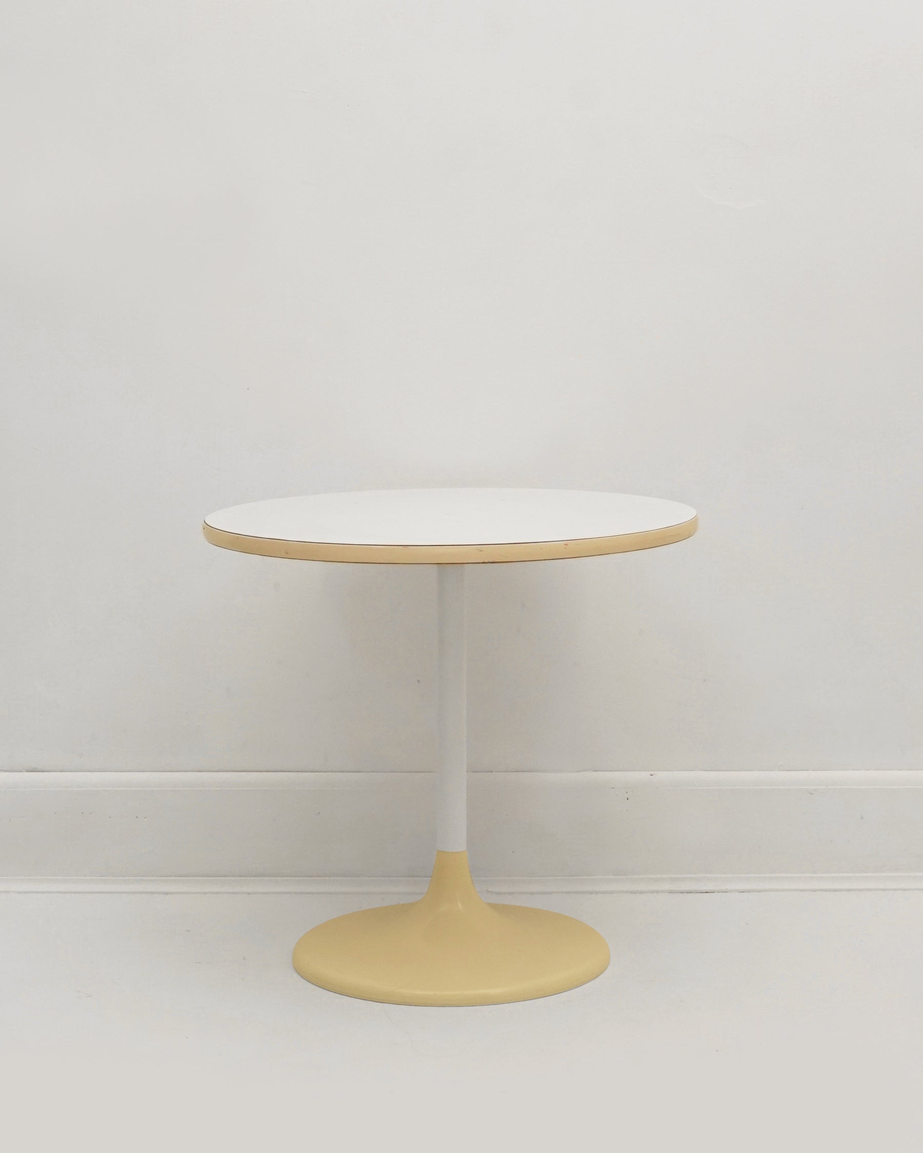 1960s cream tulip end or coffee table designed by Joe Colombo for Lusch Erzeugnis. Made in Germany. The table, given the name 'tulip' with reference to the table’s base shape, features a circular white laminated top, steel support, and a beige plastic base. Stamped by the manufacturer to base. In very good condition with some signs of use due to age.