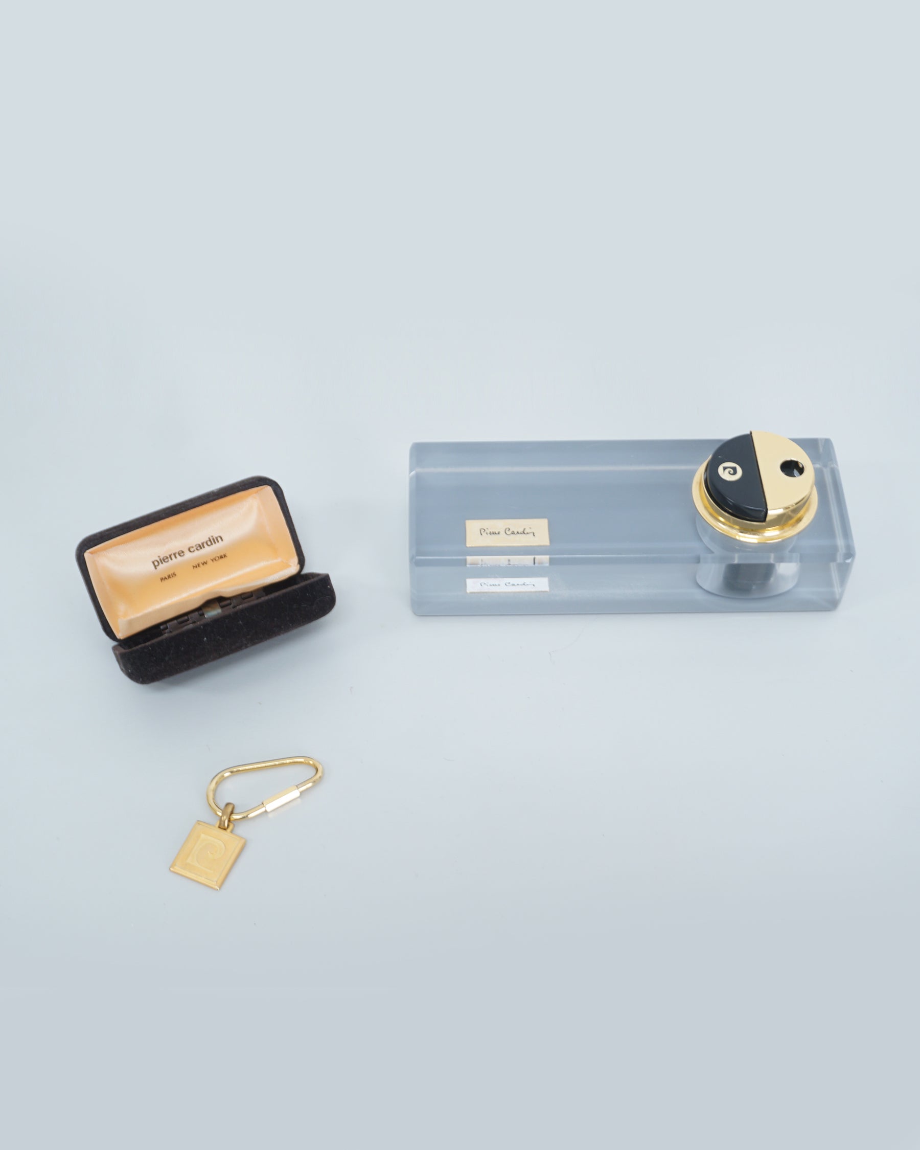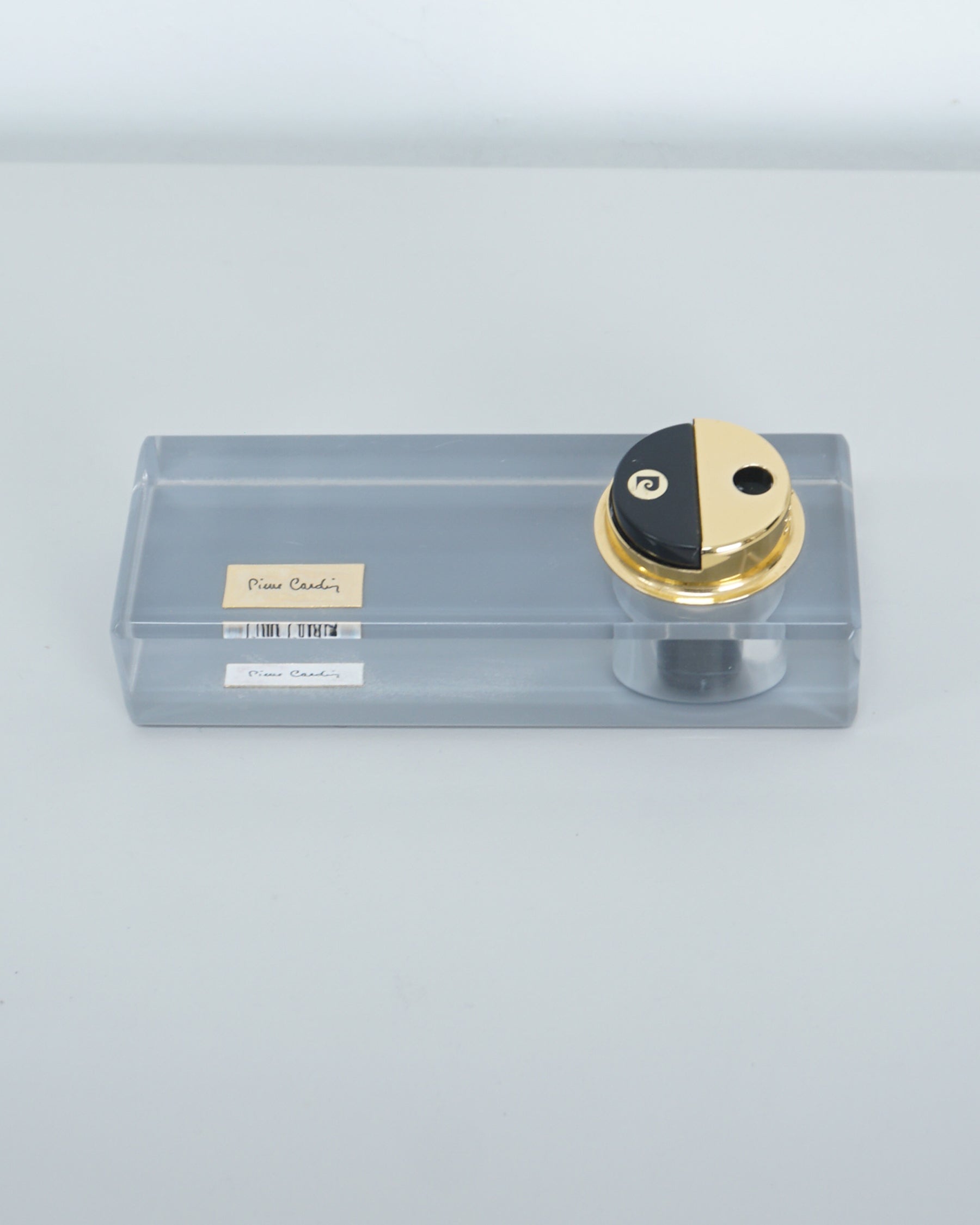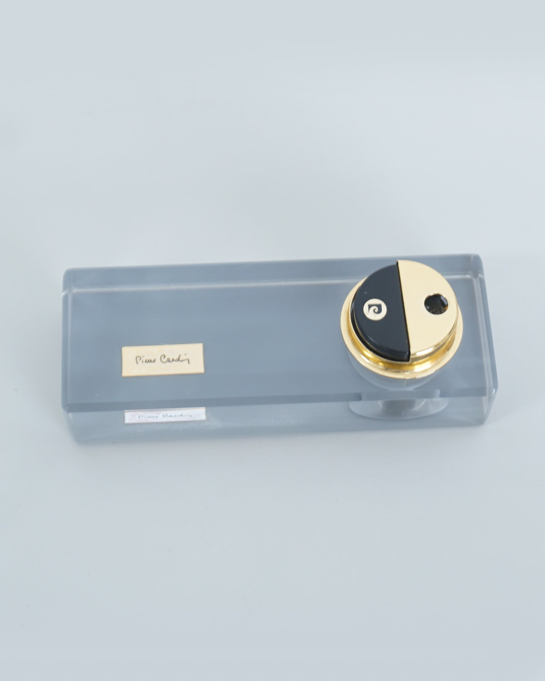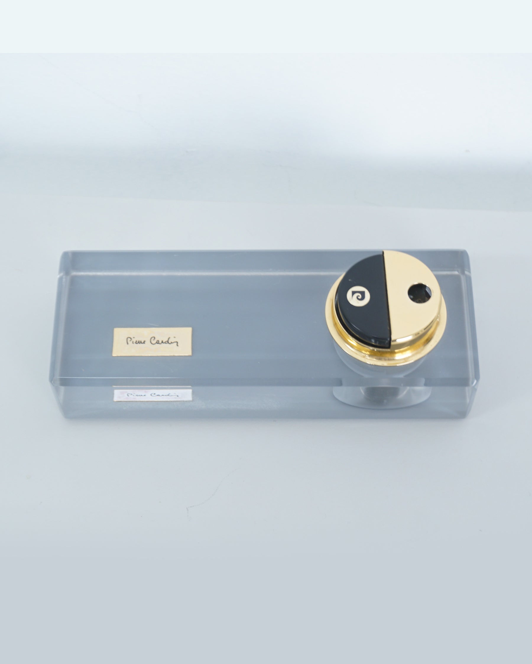 Rare acrylic and brass table lighter with laminate backing by Pierre Cardin. Signed piece.