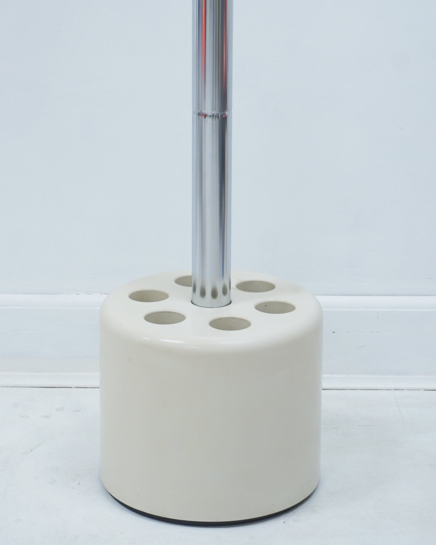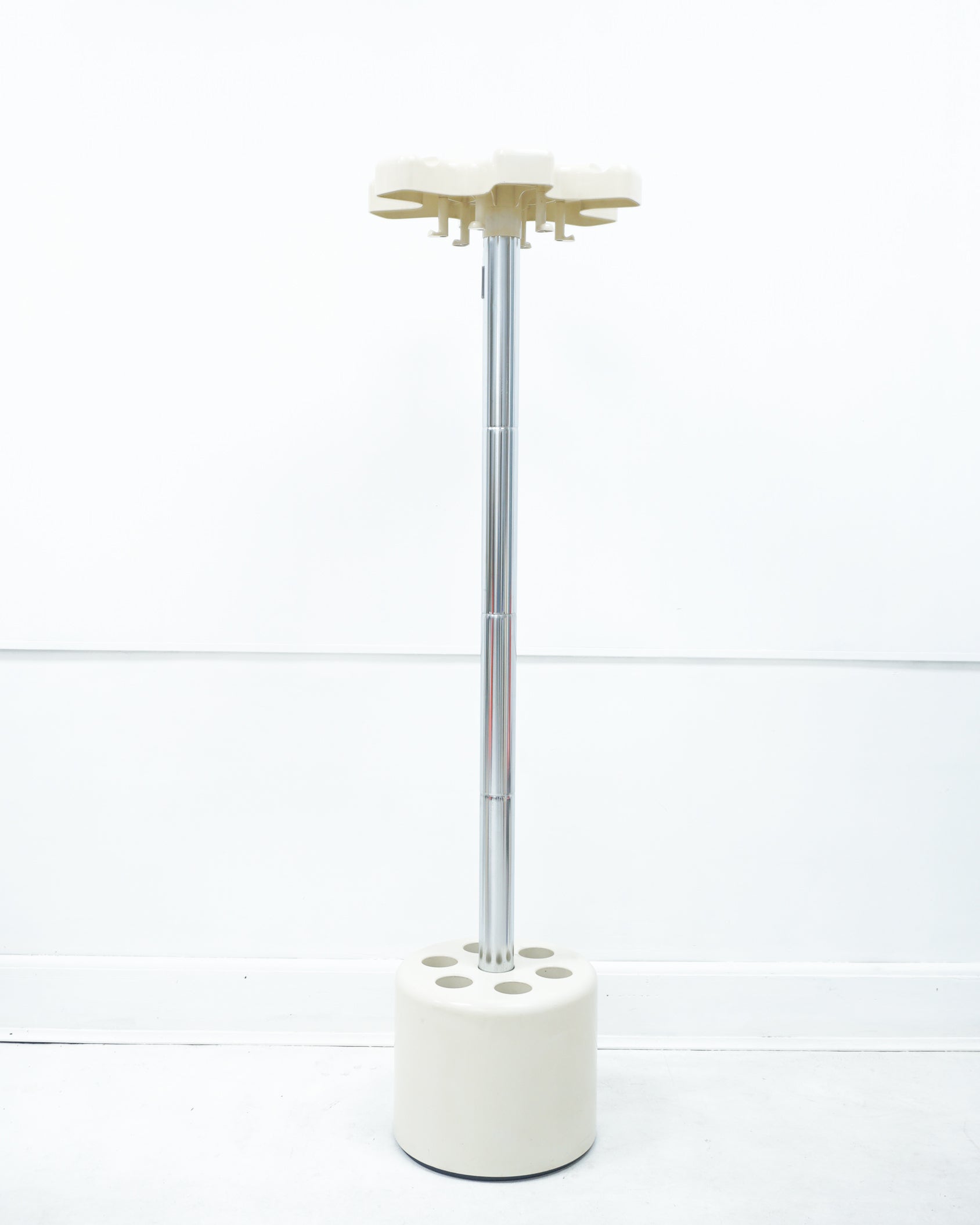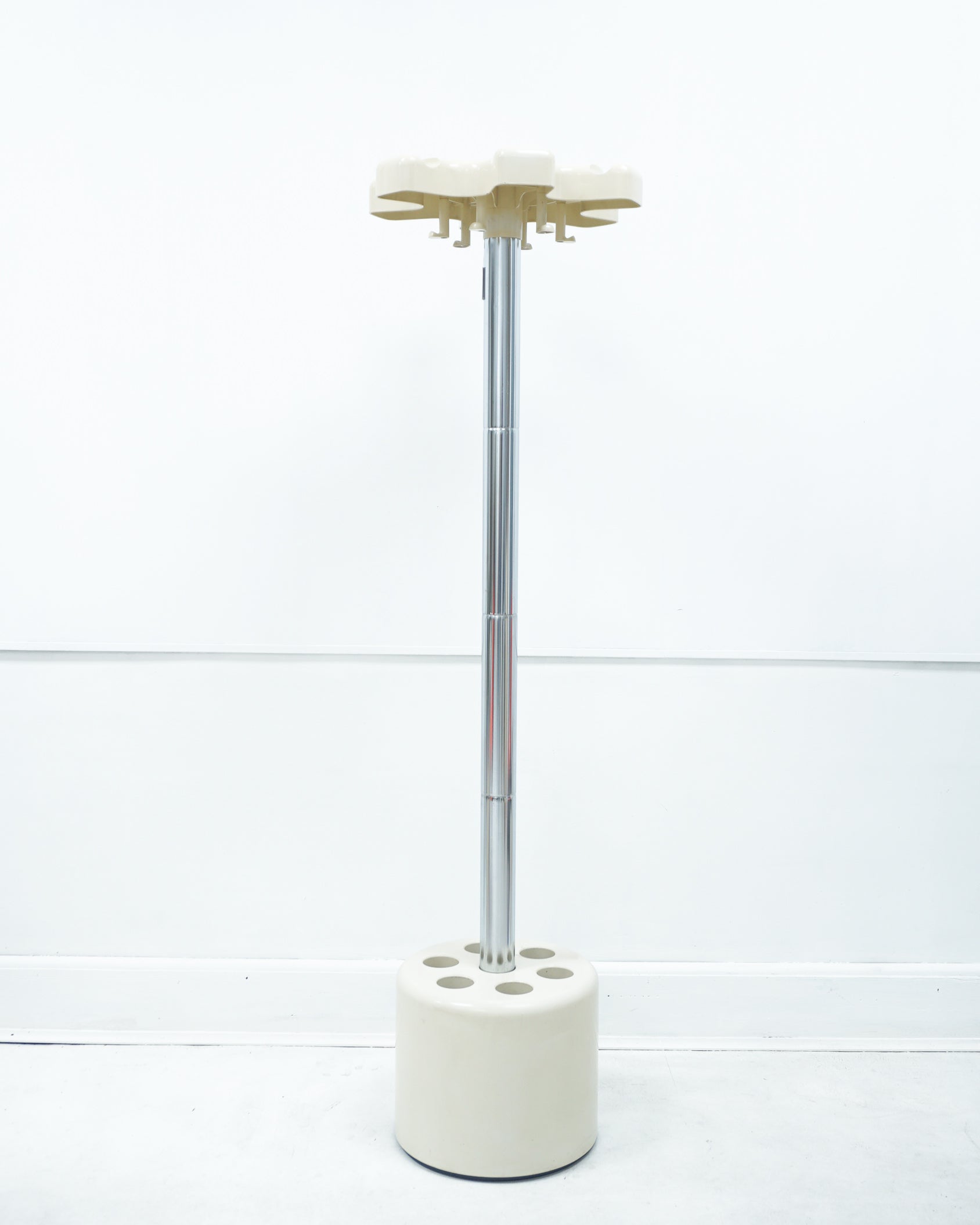 1960s Modular structure, the tube can be dismantled and adjusted in height. Cream ABS plastic and chrome. Six coat hooks. The bottom can be removed for cleaning. The base is heavy and serves as a 6-umbrella stand. Good condition with some signs of age.
