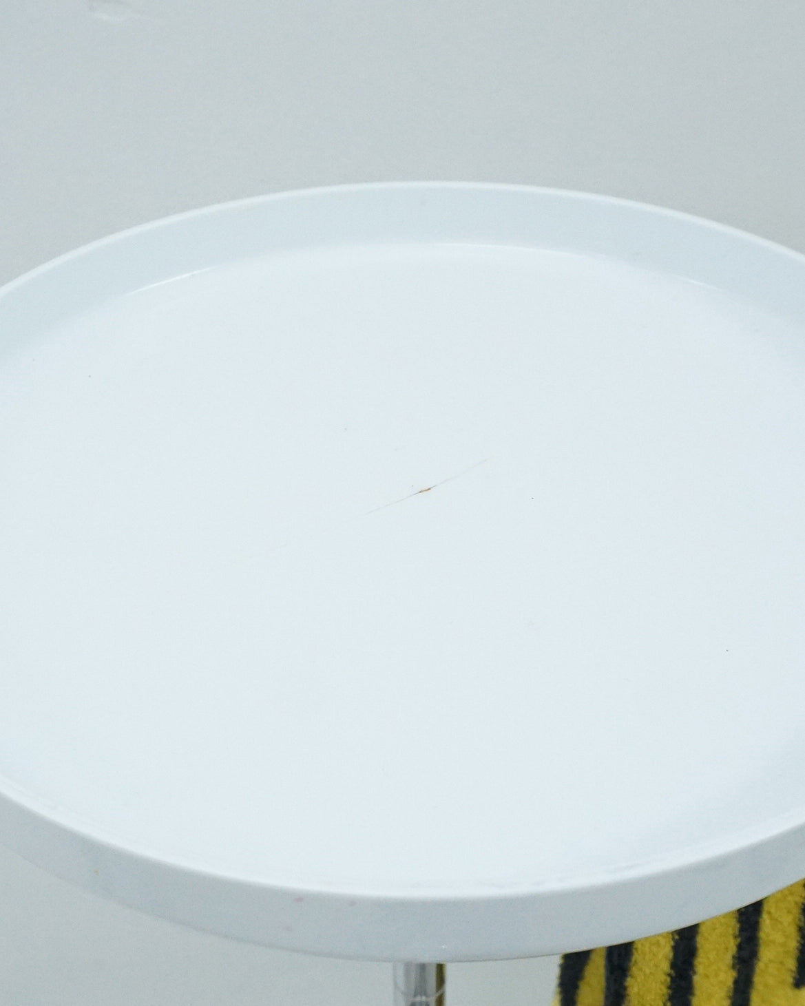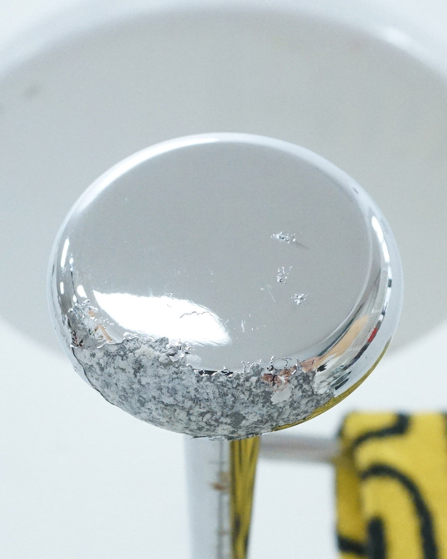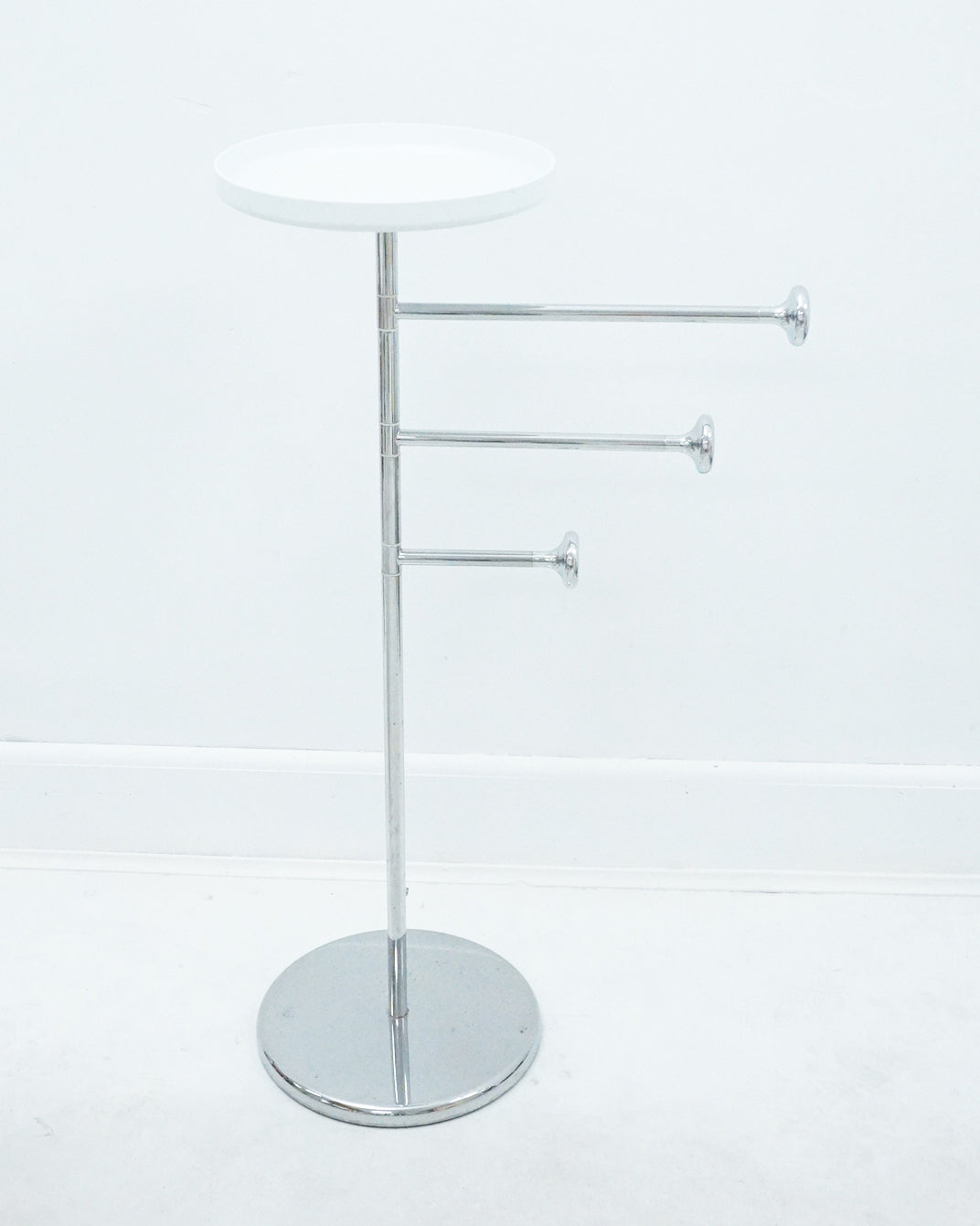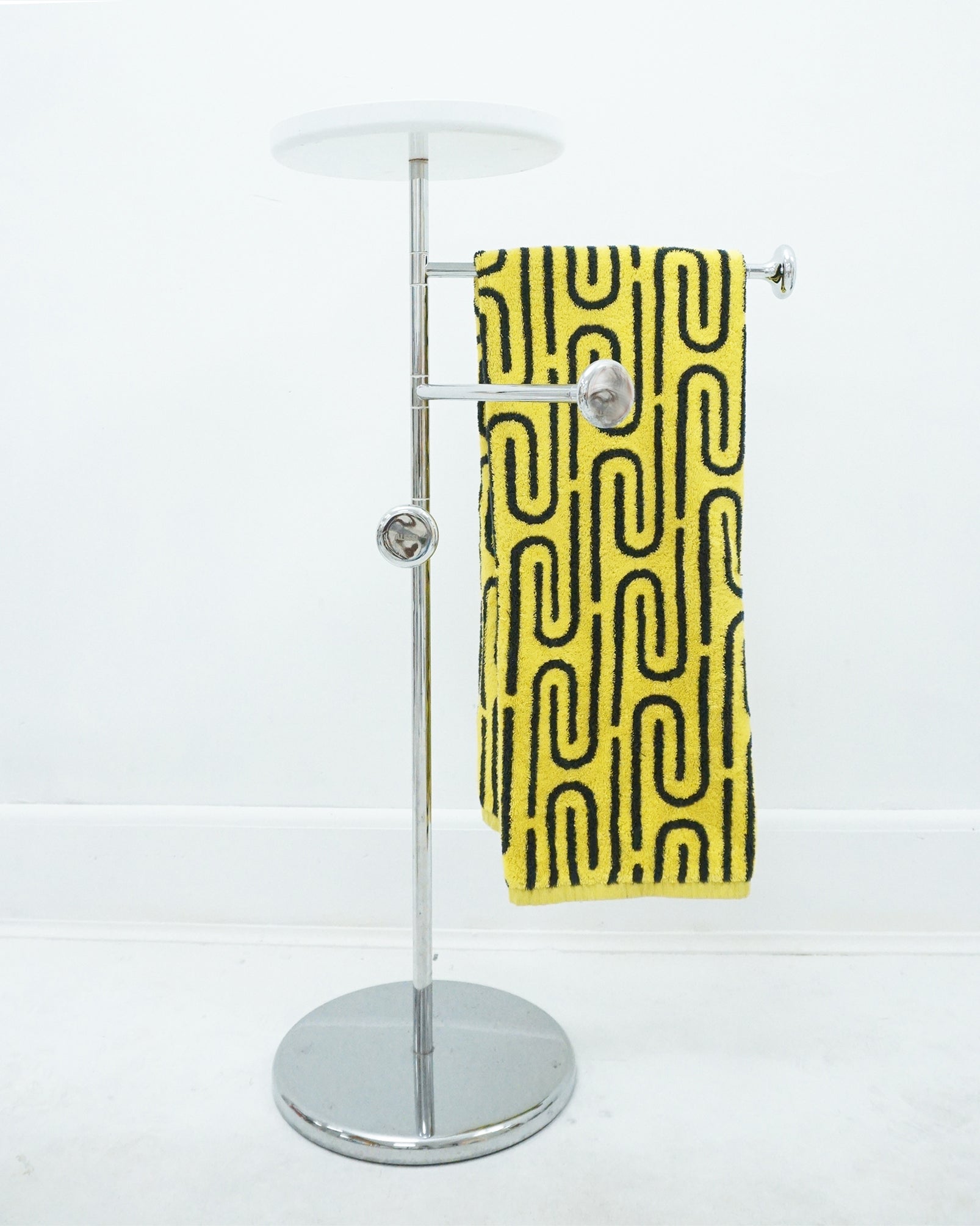 Rare towel rack by Alessi. Some imperfections to steel and hairline crack in plastic catch-all.