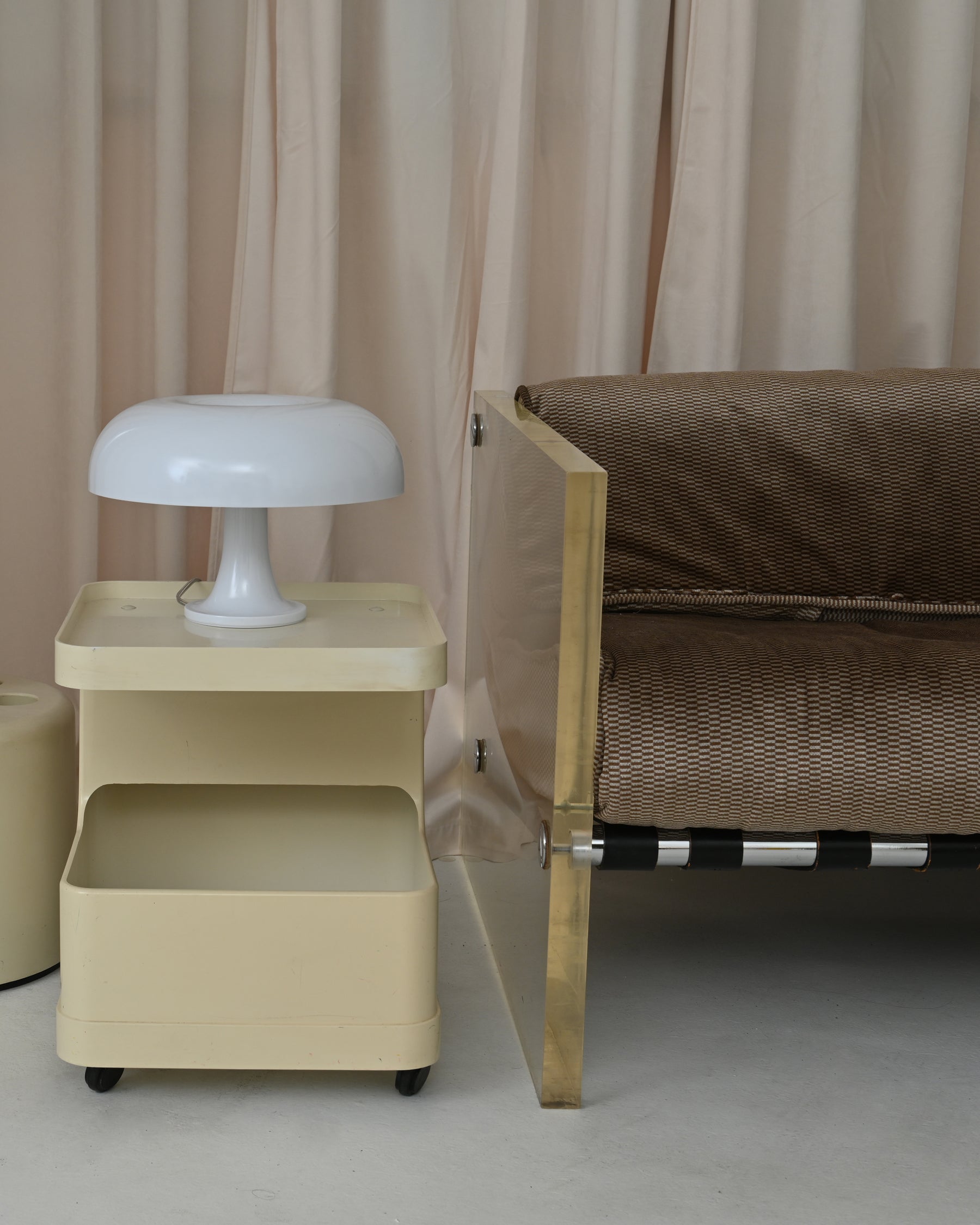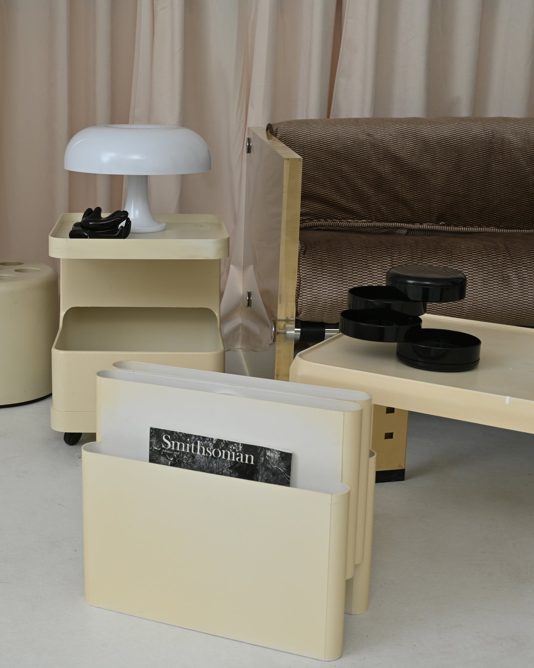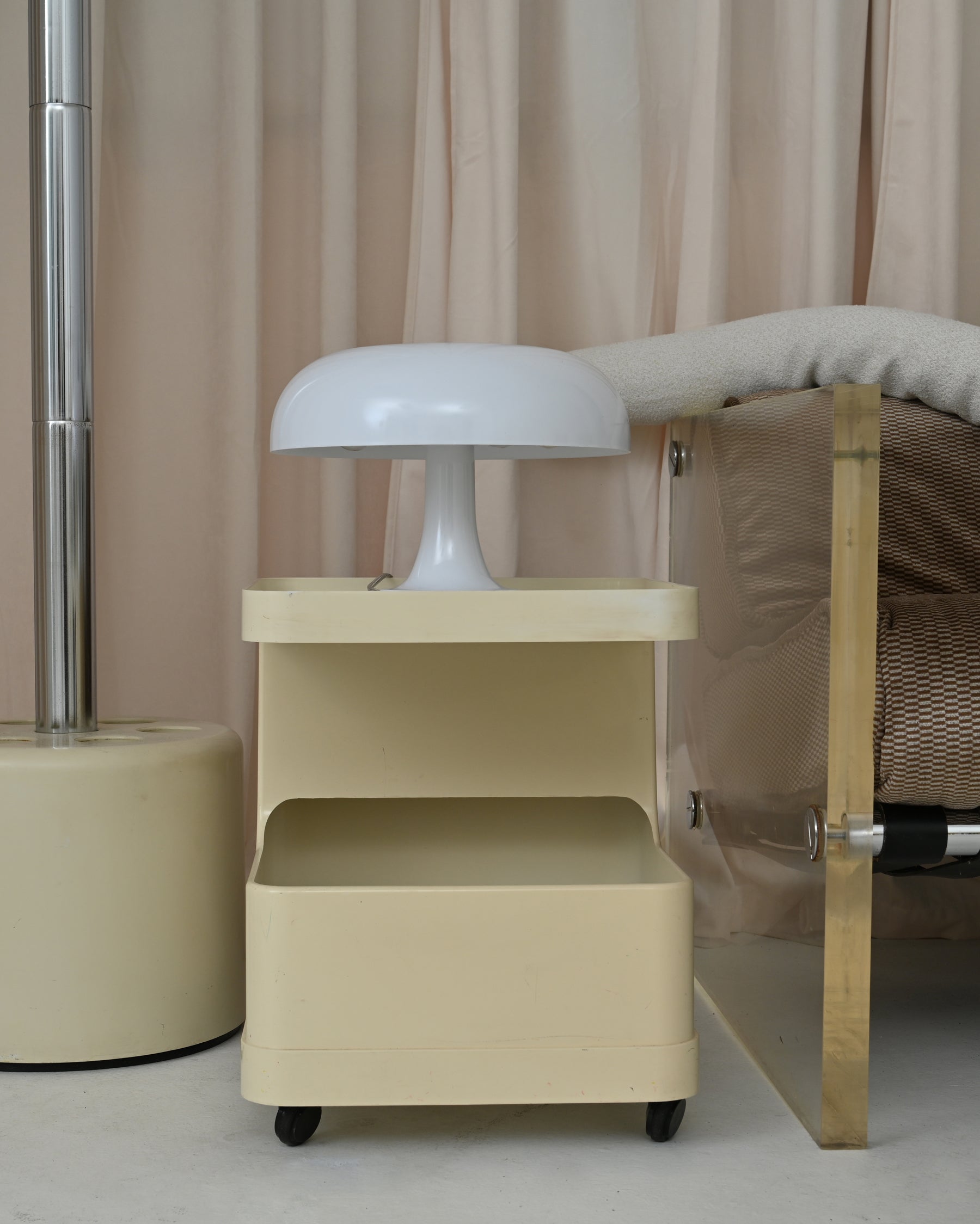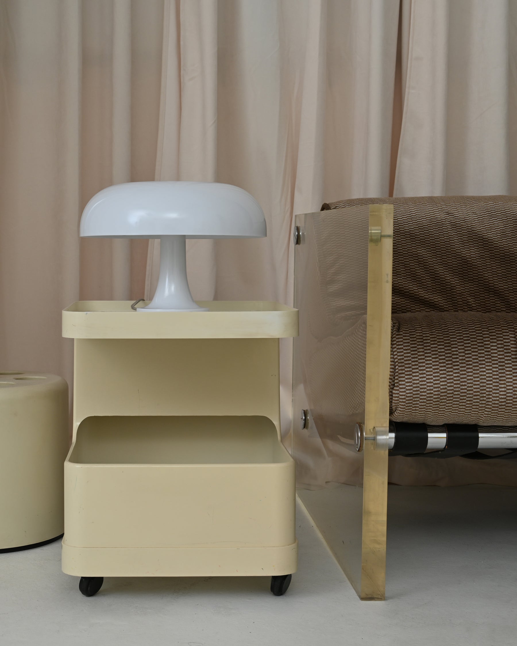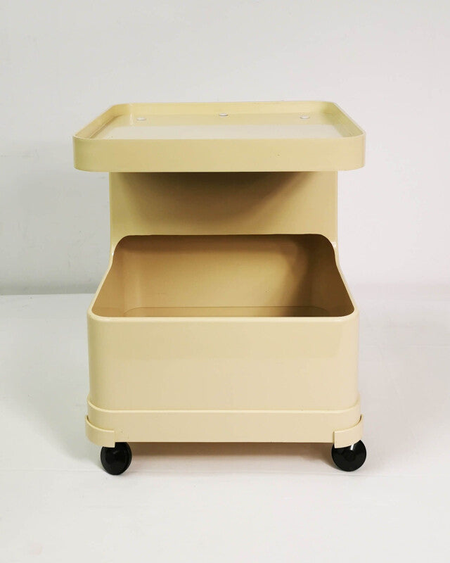 1970s Cream plastic bar trolley attributed to Marcello Siard for Game. Made in Italy. The bottom piece with wheels has been replaced, so no markings are present. Casters work well. In very good condition with minimal wear and signs of use.