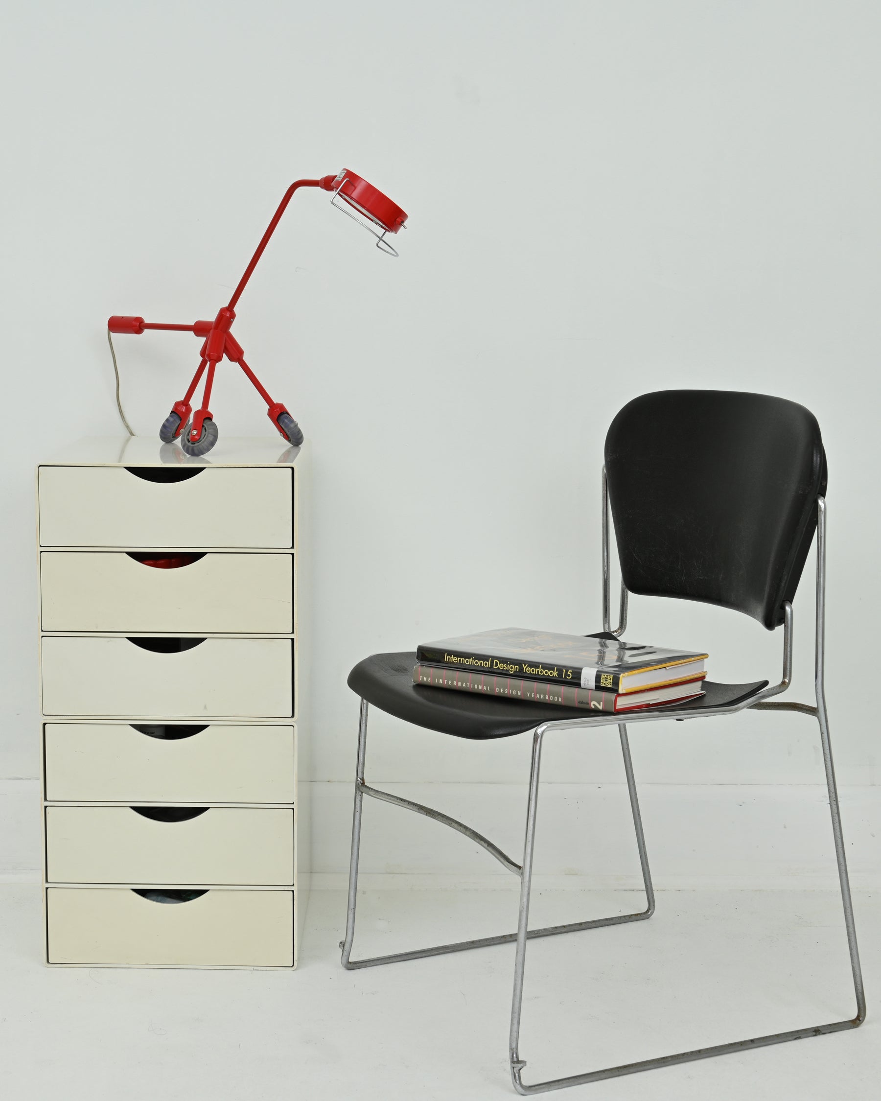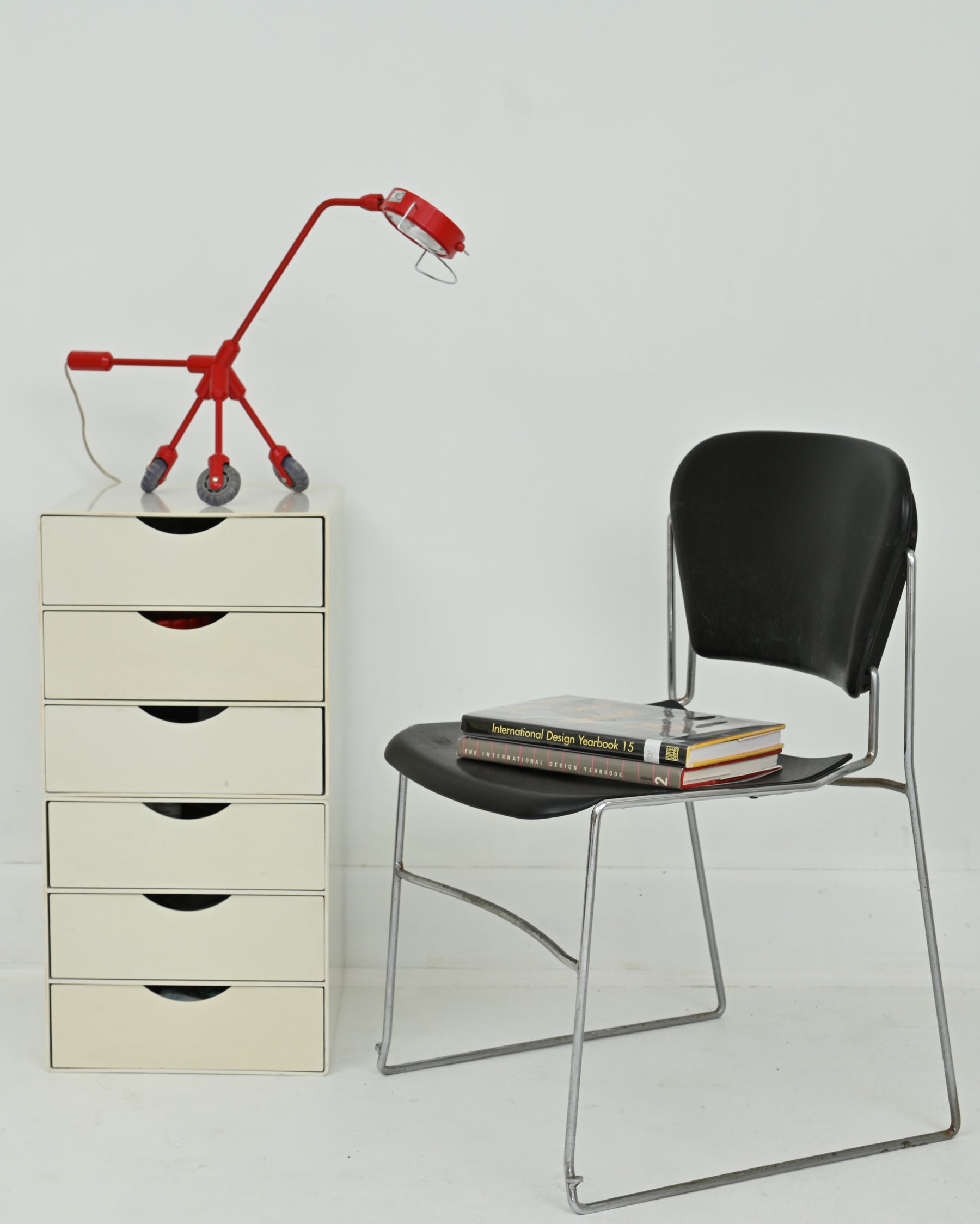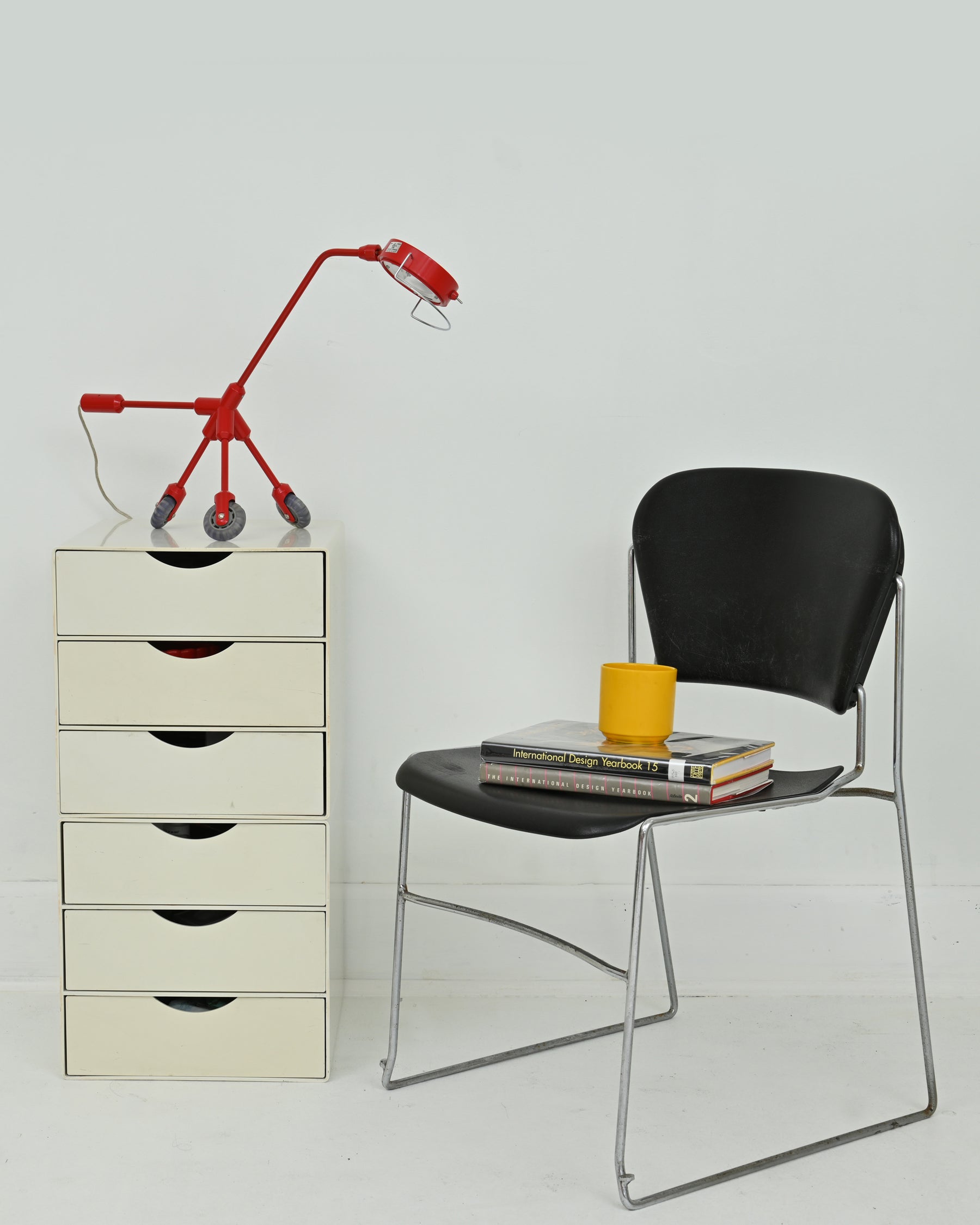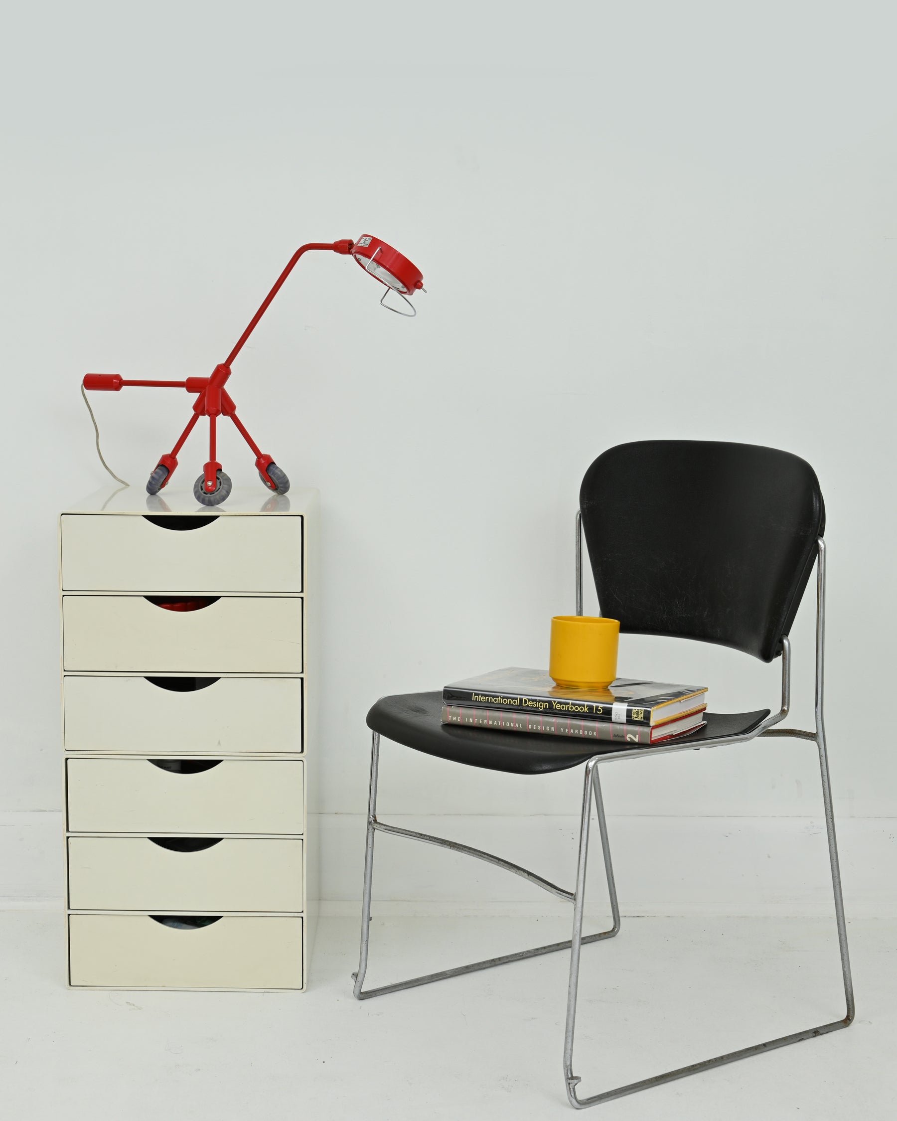 1970s Cream Plastic Three-Drawer Cubes. The drawers can be removed for vinyl storage. The front corners have a slight radius. Unmarked Palaset-style ABS plastic is in good condition with some discoloration. Two sets of three drawers available.