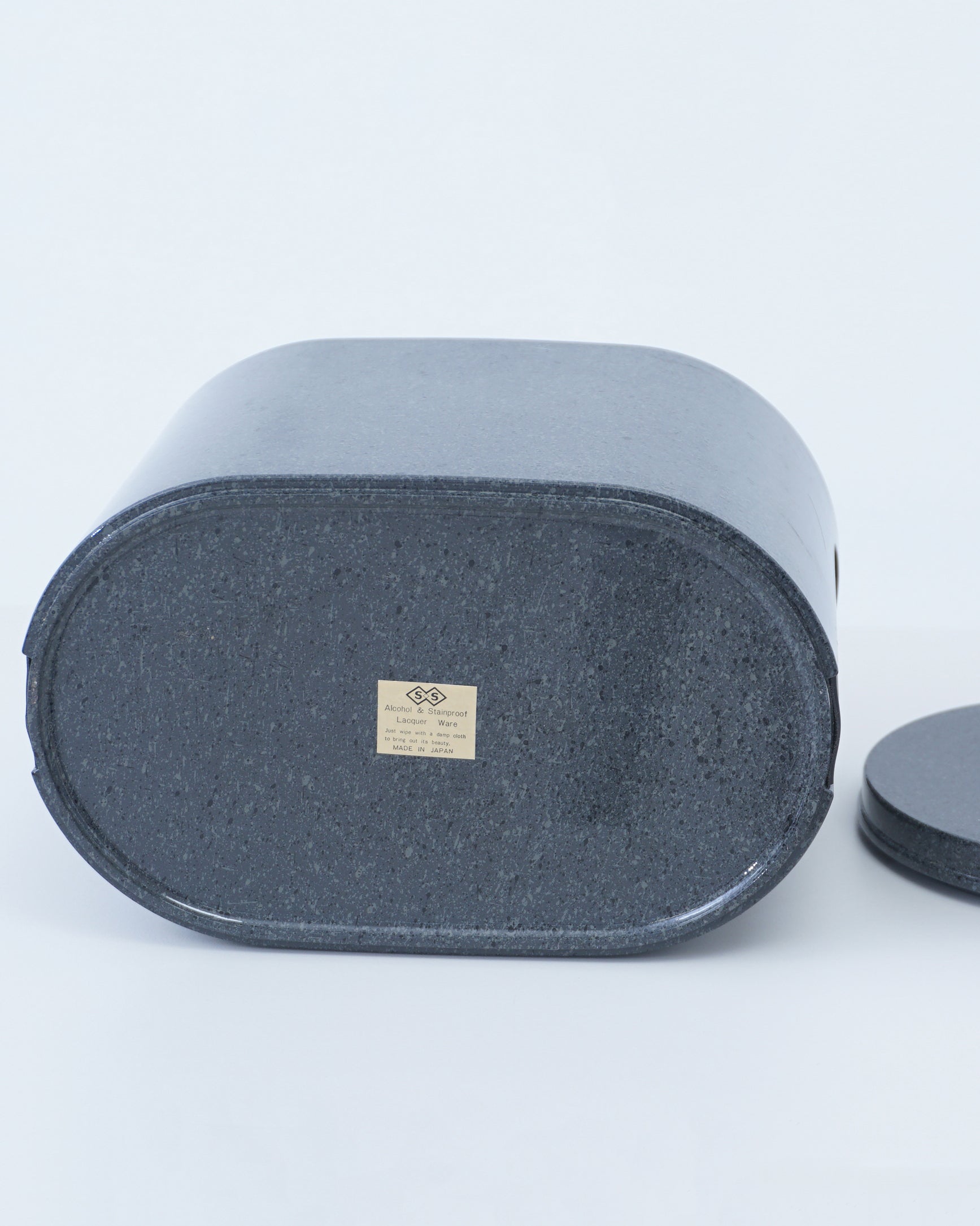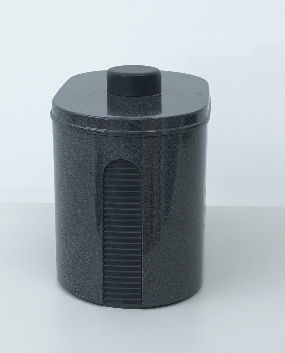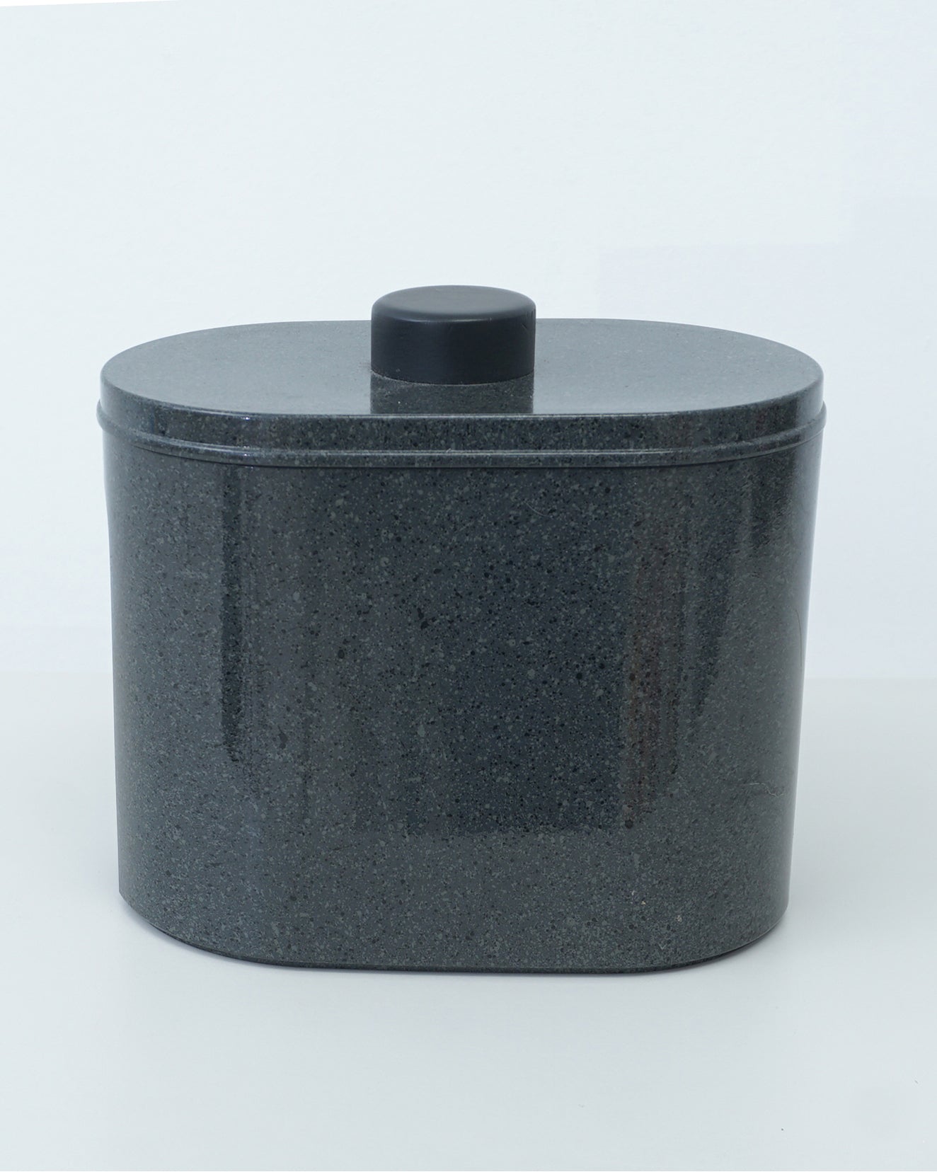 1970s Oblong Ice Bucket with a faux granite finish, Made in Japan. Unusual space-age shape. In great condition, with minor wear from use.