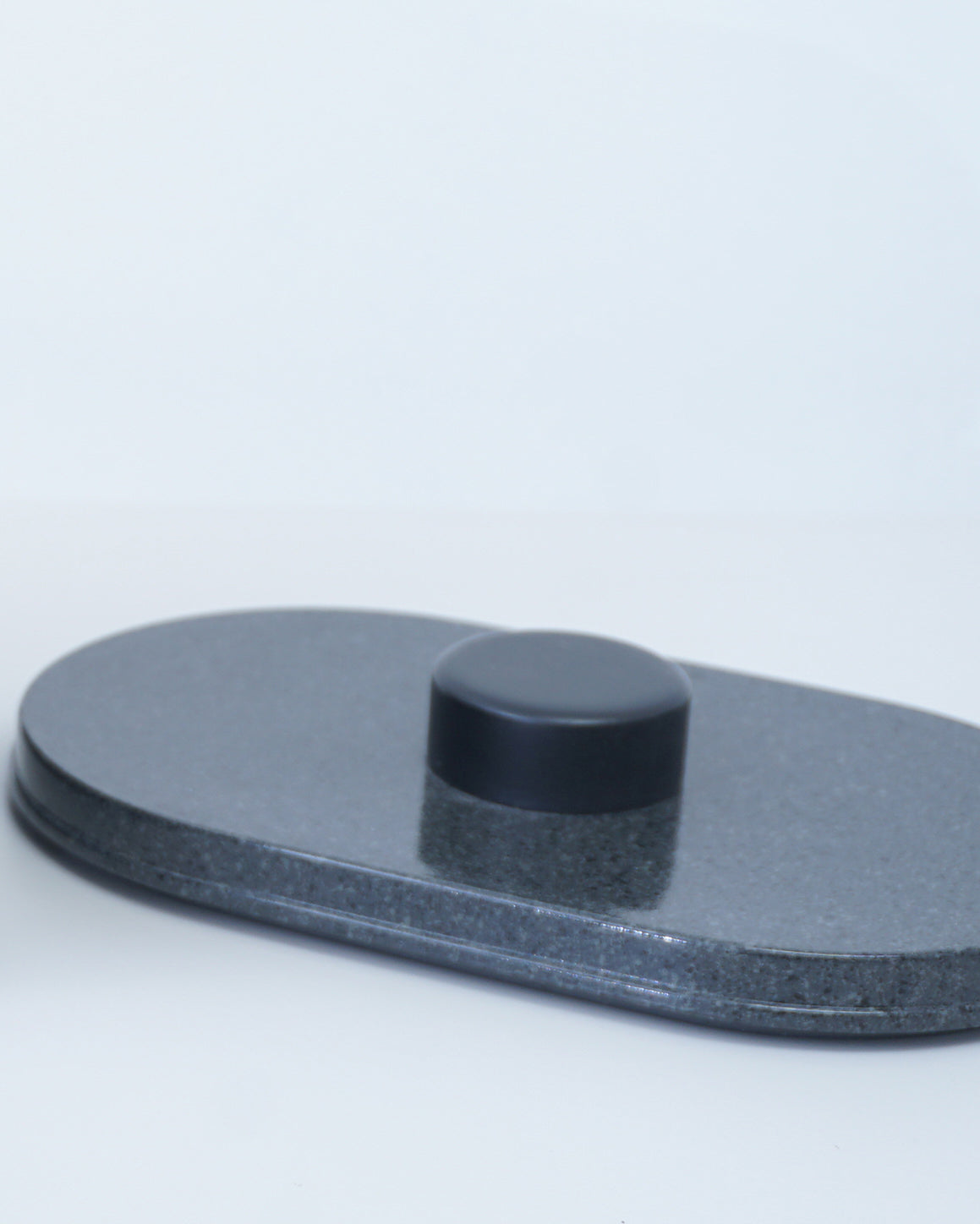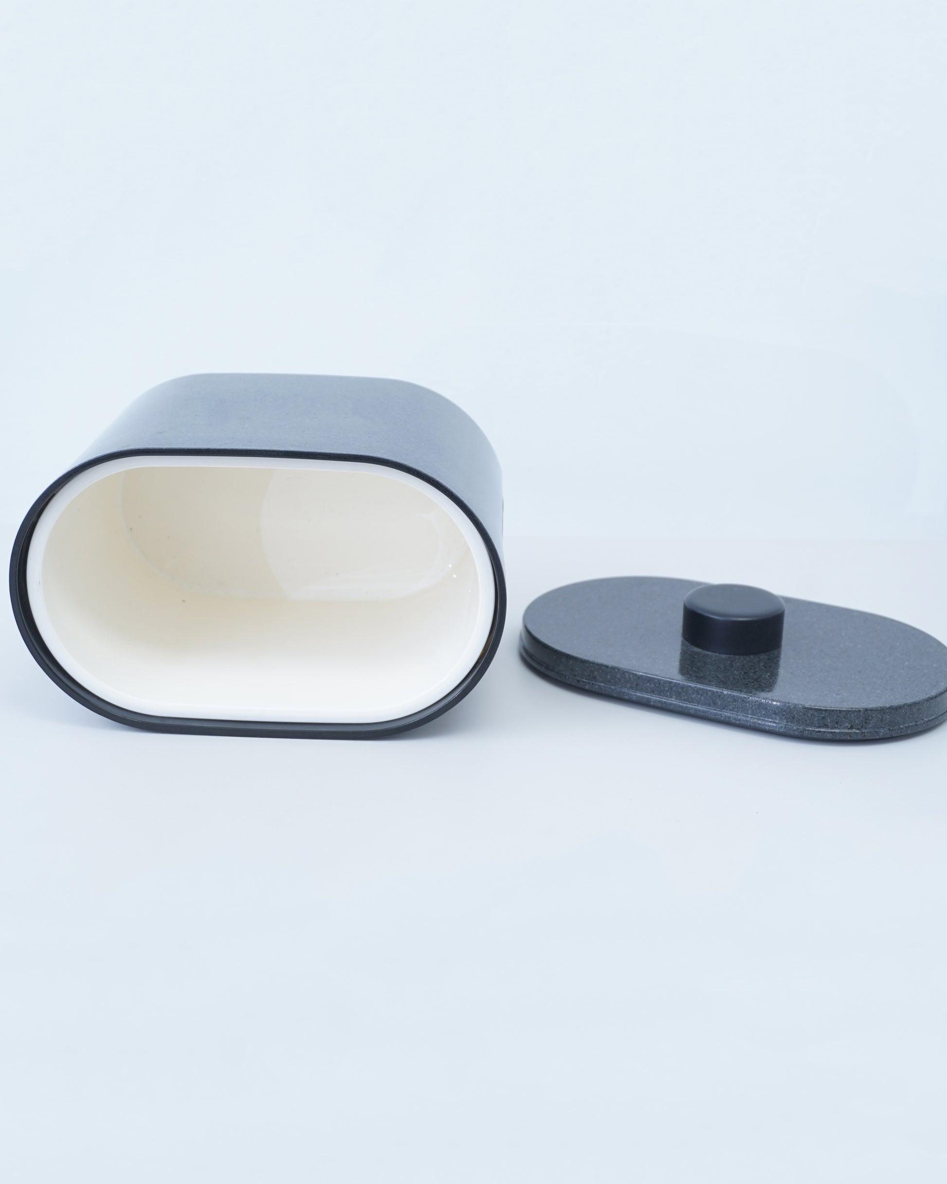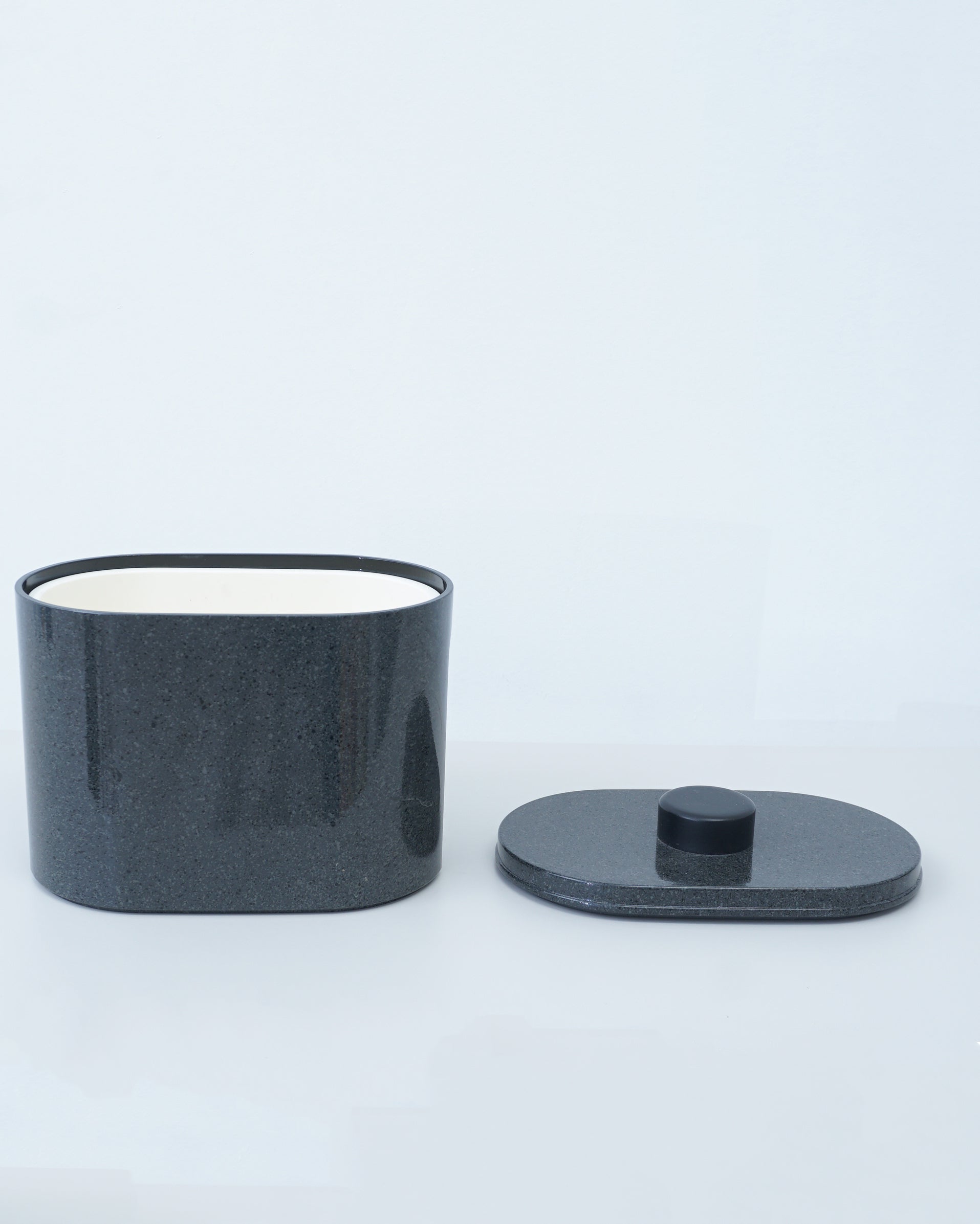 1970s Oblong Ice Bucket with a faux granite finish, Made in Japan. Unusual space-age shape. In great condition, with minor wear from use.
