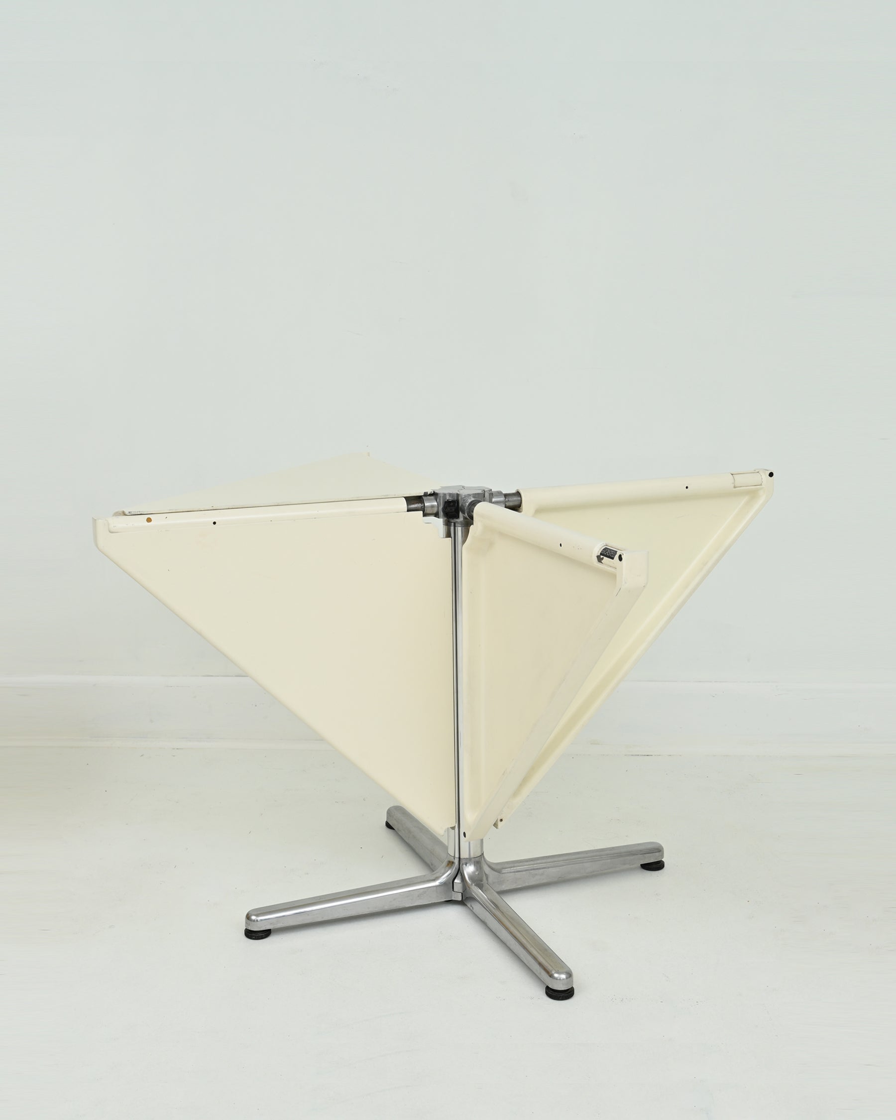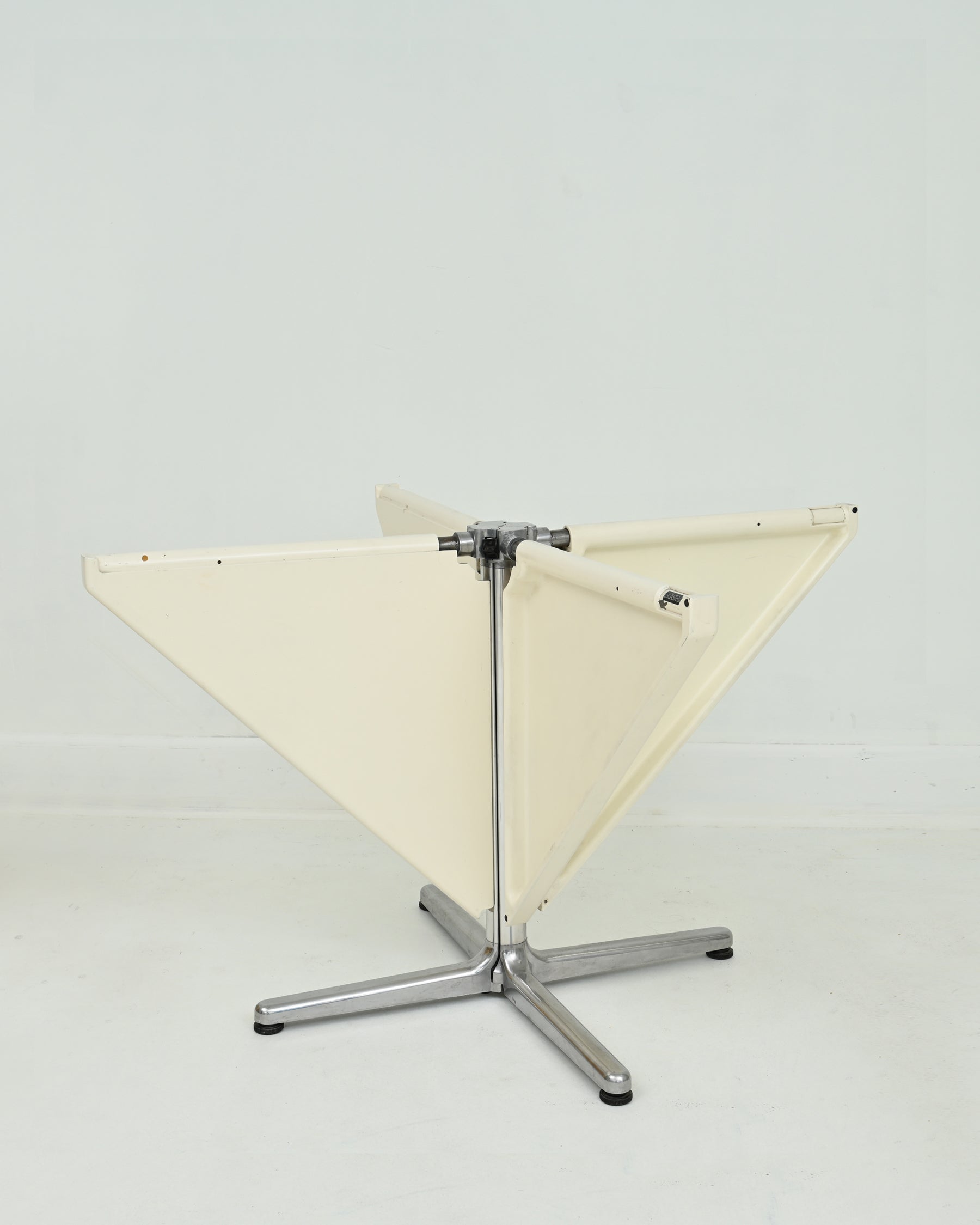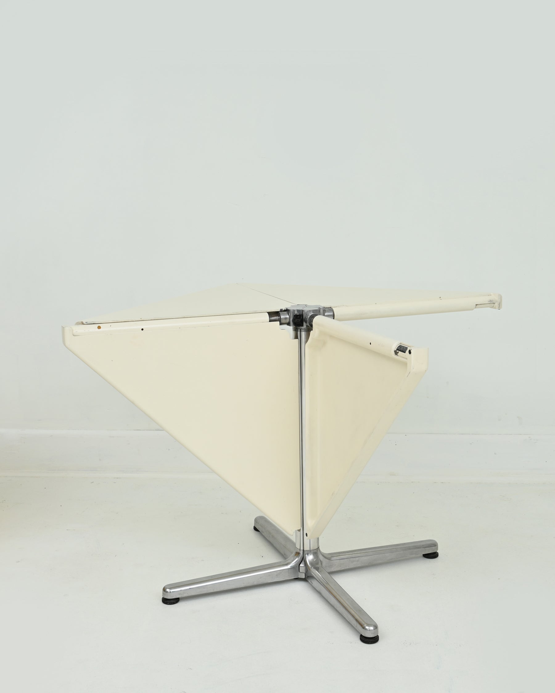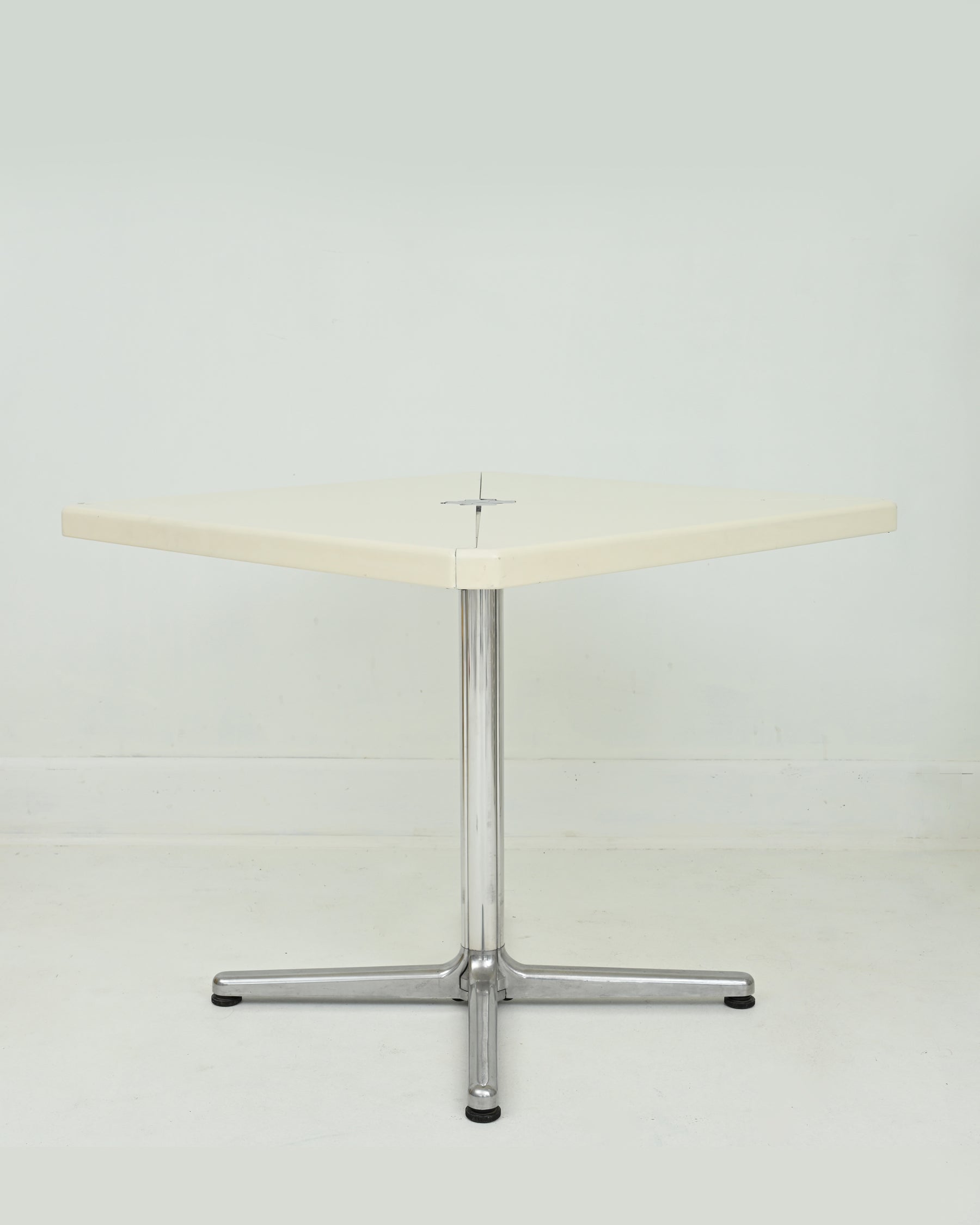 1970s die-cast aluminum, square top table in cream resin with foldable sectors rotating on a spring-loaded pin. By Giancarlo Piretti for Castelli. Made in Italy. Very rare original color (a light taupe) with inset chrome florette which is the folding mechanism. One of the most interesting engineering and design examples ever. Excellent original condition. Some scratches and hairline cracks to resin. Bearing manufacturer’s label.