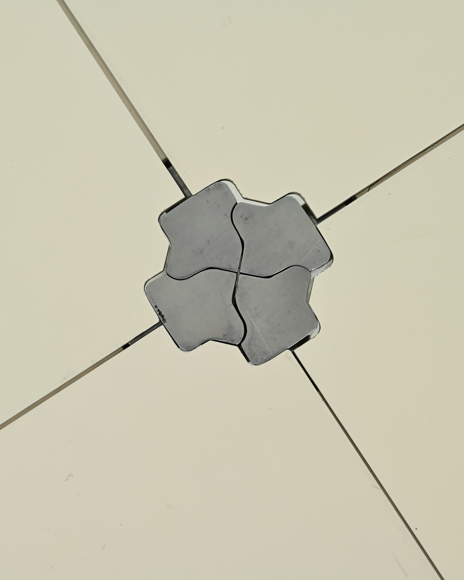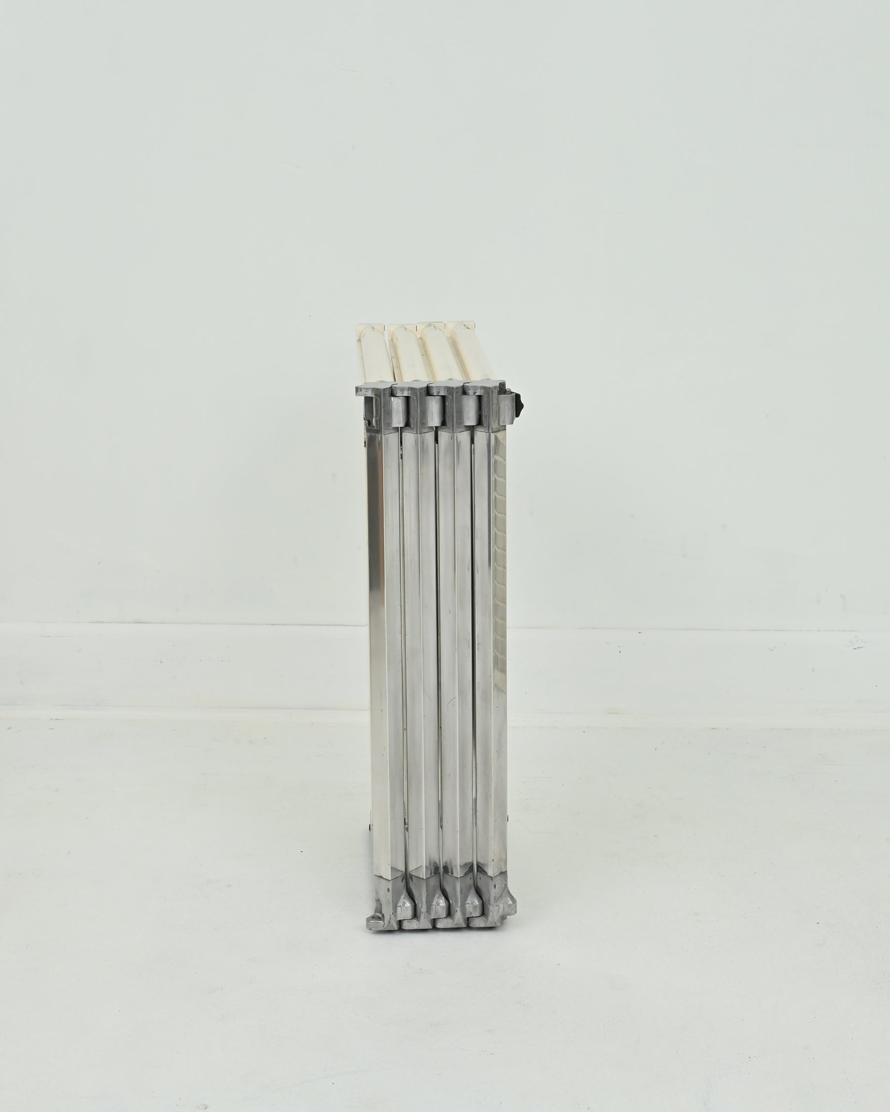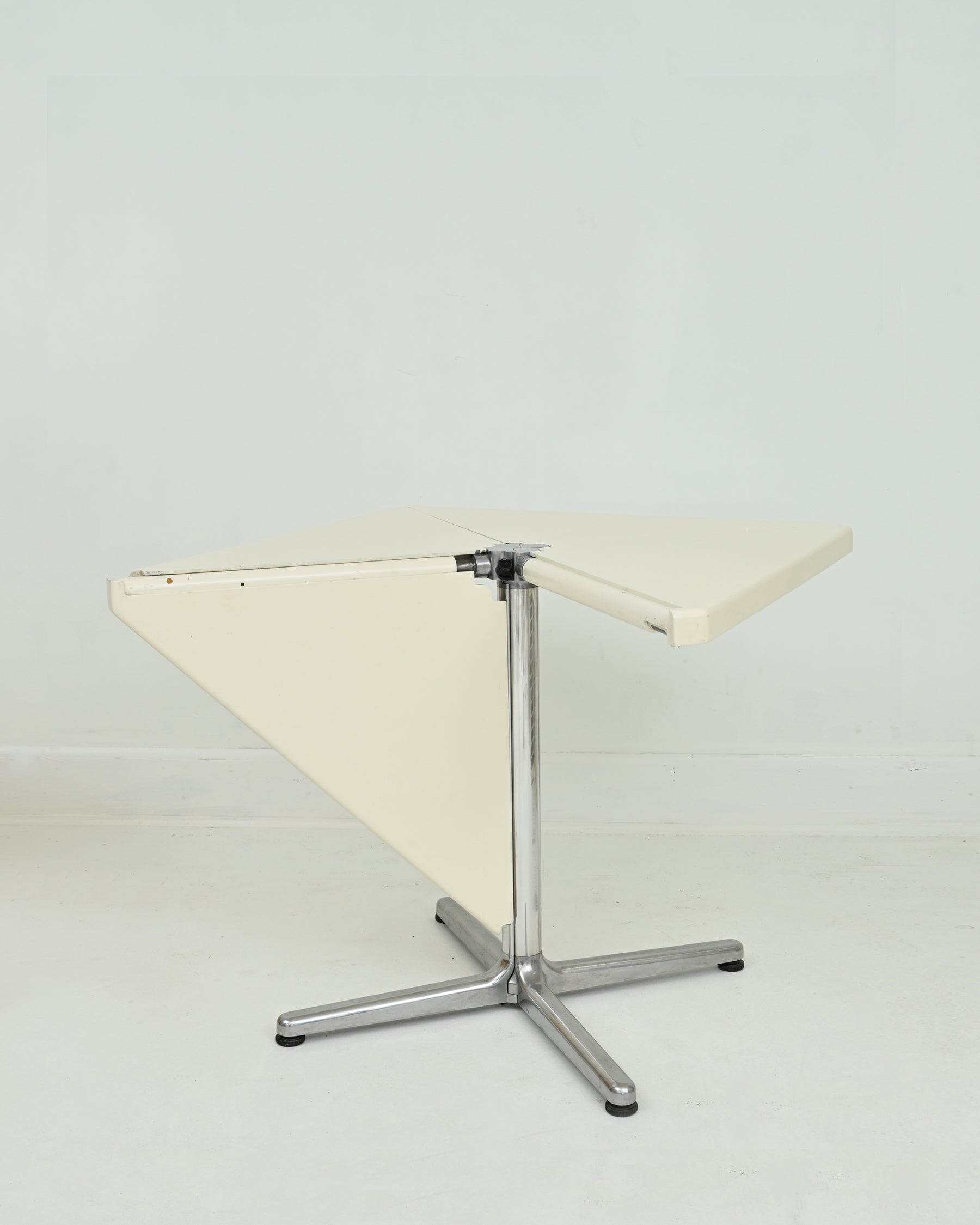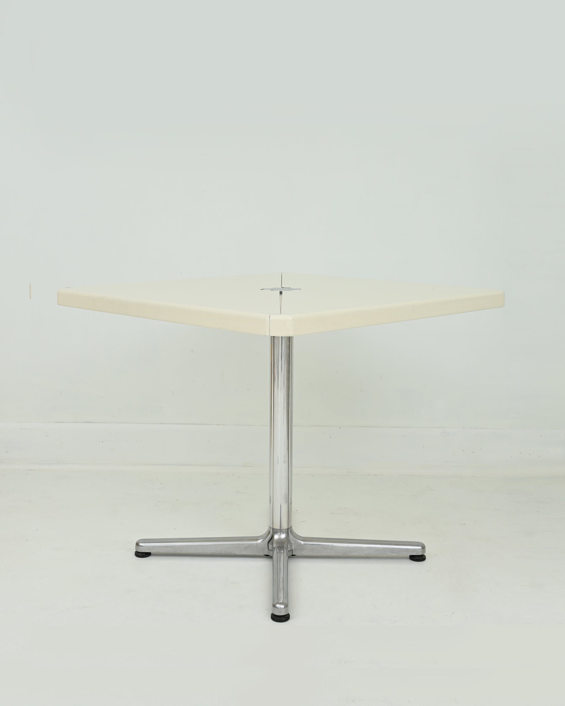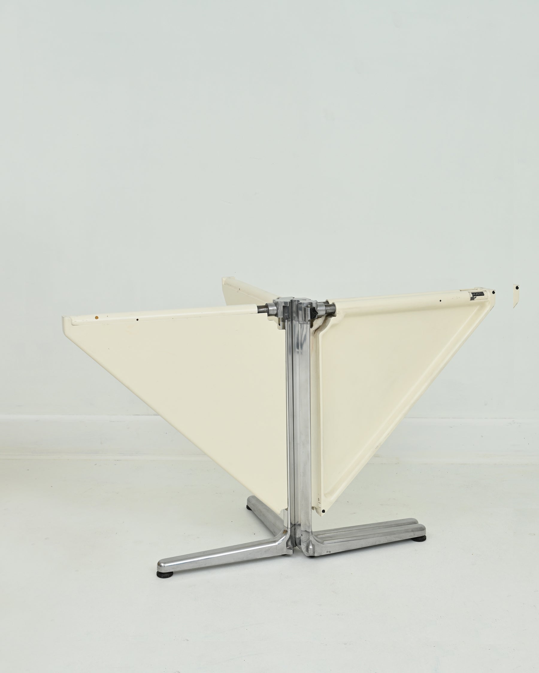 1970s die-cast aluminum, square top table in cream resin with foldable sectors rotating on a spring-loaded pin. By Giancarlo Piretti for Castelli. Made in Italy. Very rare original color (a light taupe) with inset chrome florette which is the folding mechanism. One of the most interesting engineering and design examples ever. Excellent original condition. Some scratches and hairline cracks to resin. Bearing manufacturer’s label.