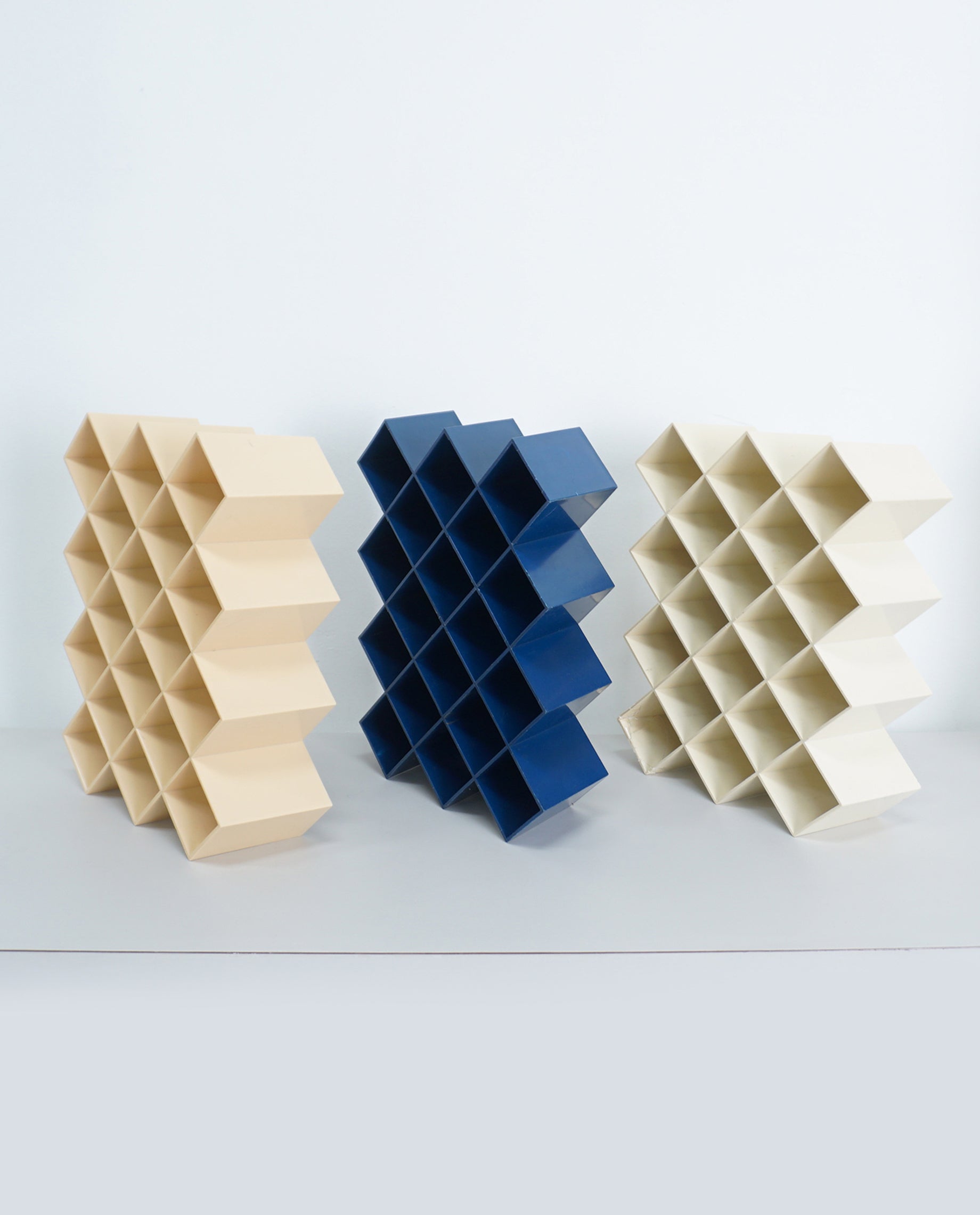 1970s multiuse plastic storage rack by Lubge Randel for Capco. In good condition. Manufacturer’s mark. Holes for hanging but stands and is modular also. Three colors, tan, blue, and white available. Sold separately.