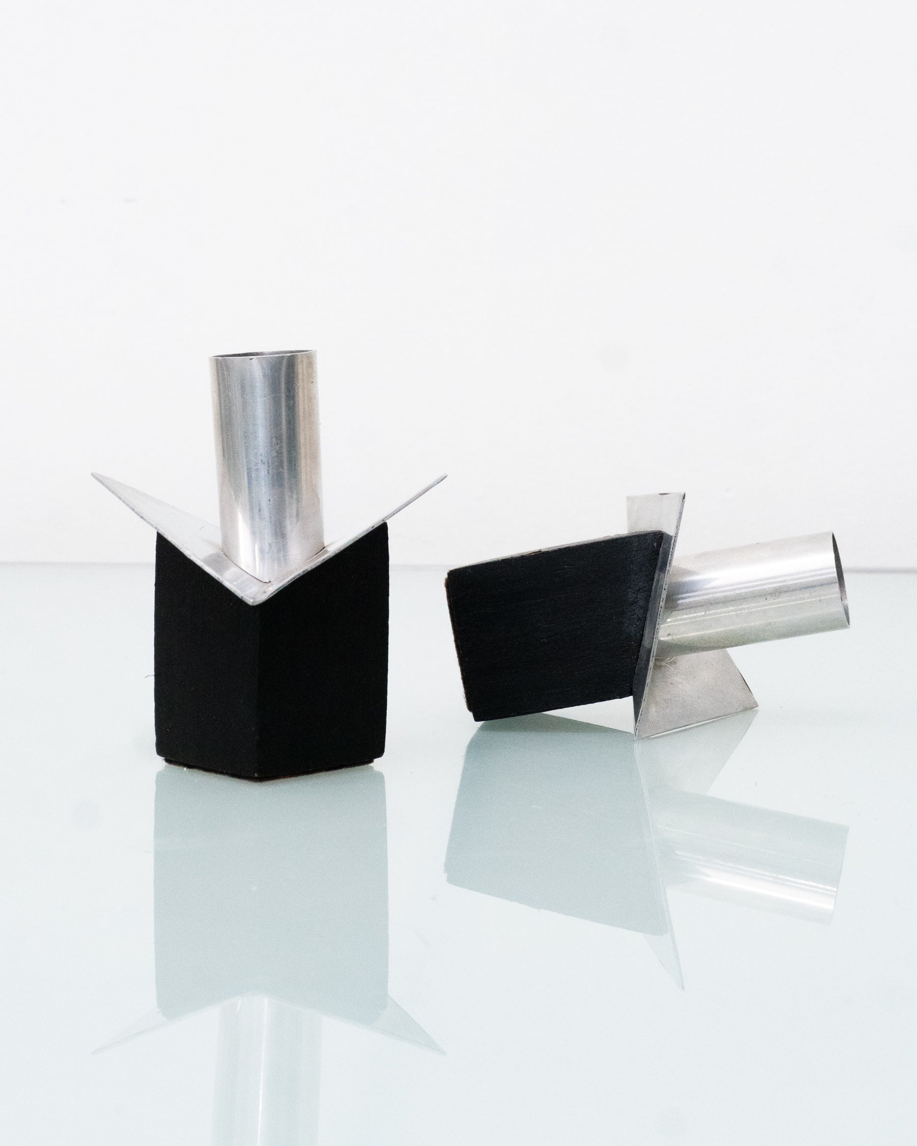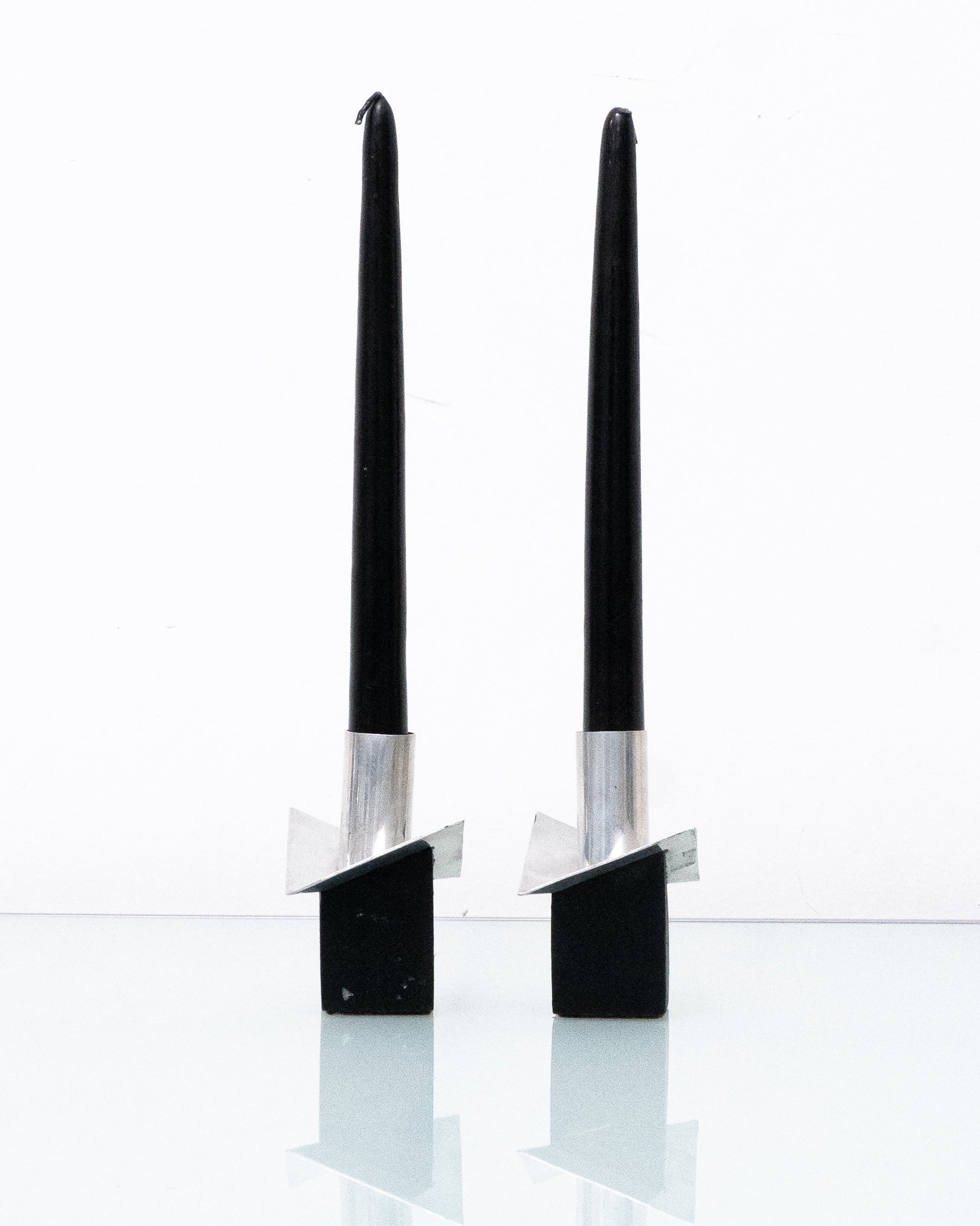 1970s Postmodern Aluminum and Ebony Wood Taper Candle Holders