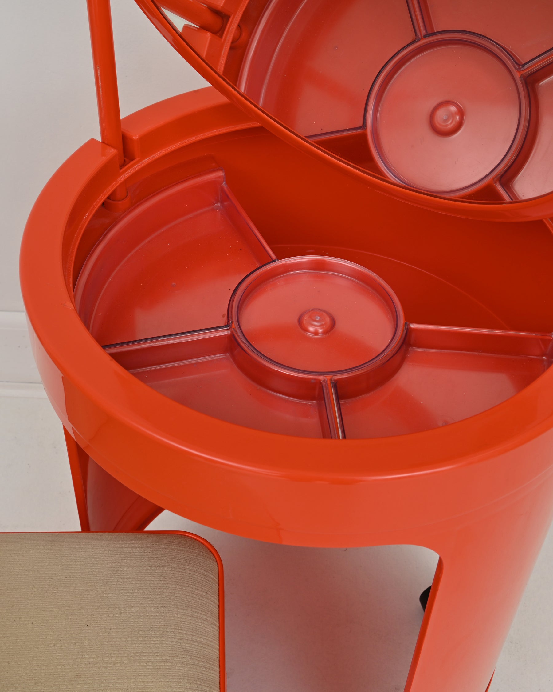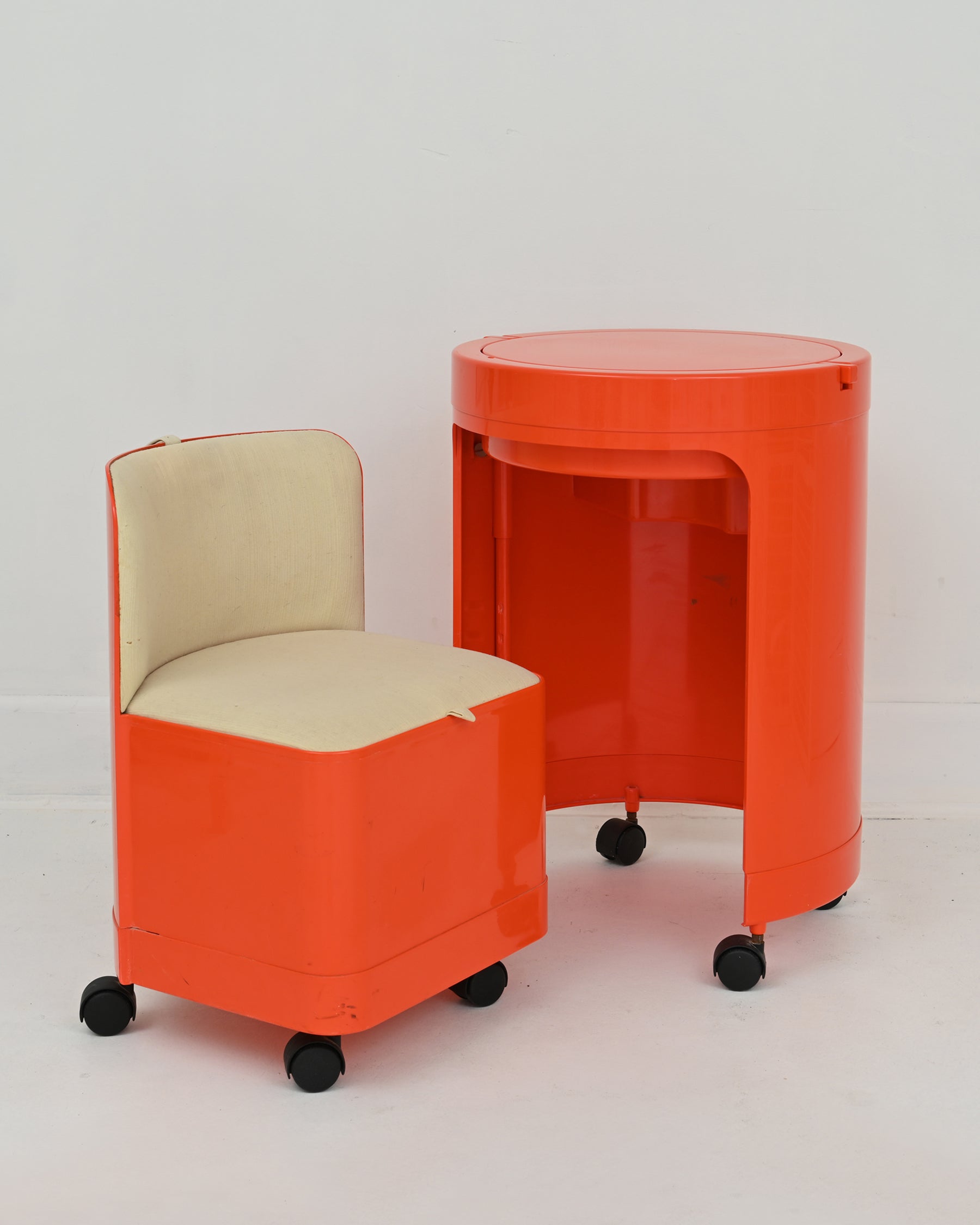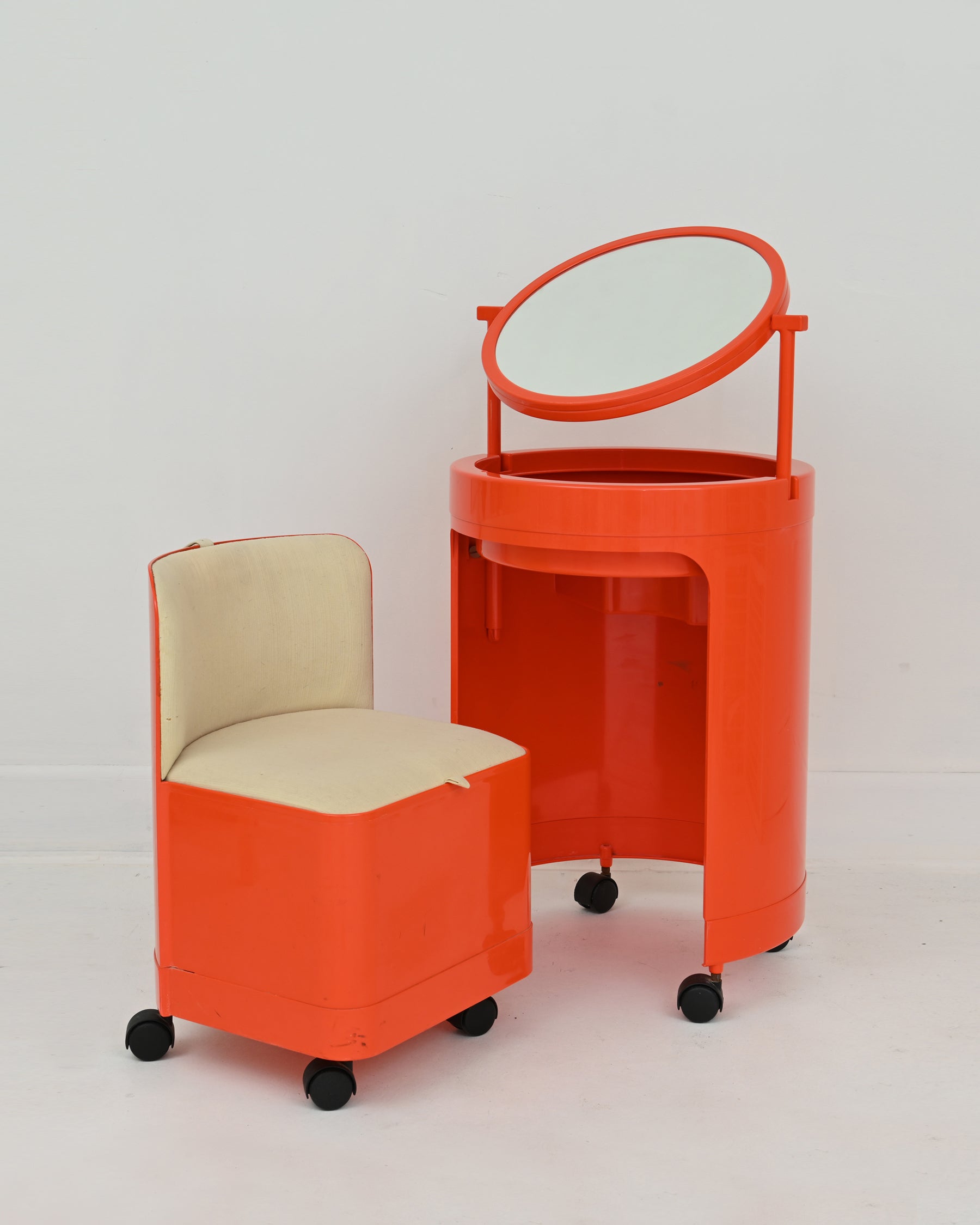 1970s rare atomic orange “Silvi” vanity mounted on wheels with pull-out chair and adjustable mirror. Plastic produced by the firm Studio Kastilia and constructed by Fanini Fain S.P.A. of Ascoli Piceno. Made in Italy. The chair fits perfectly inside to make a seamless compact cylindrical vanity. Close the mirror to create a tabletop. Pivot mirror to angle. Excellent condition. Some discoloration and small amount of warping on tabletop from age and use. Original upholstery has some wear from age. But otherwise in excellent condition. This item will be the cornerstone of any room with its metamorphic nature.