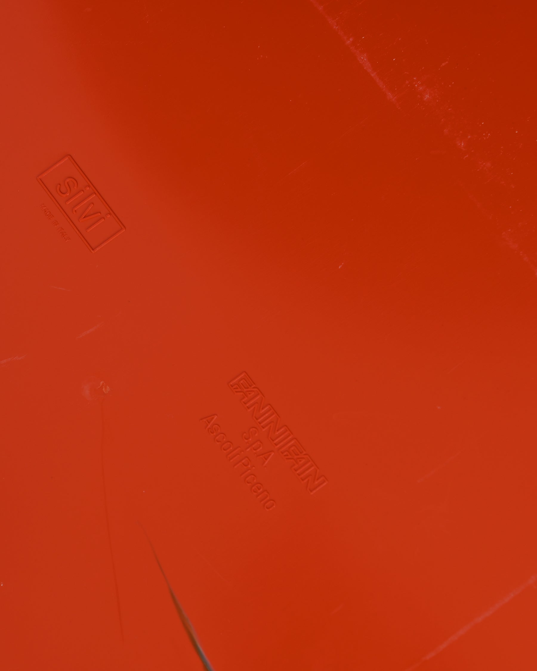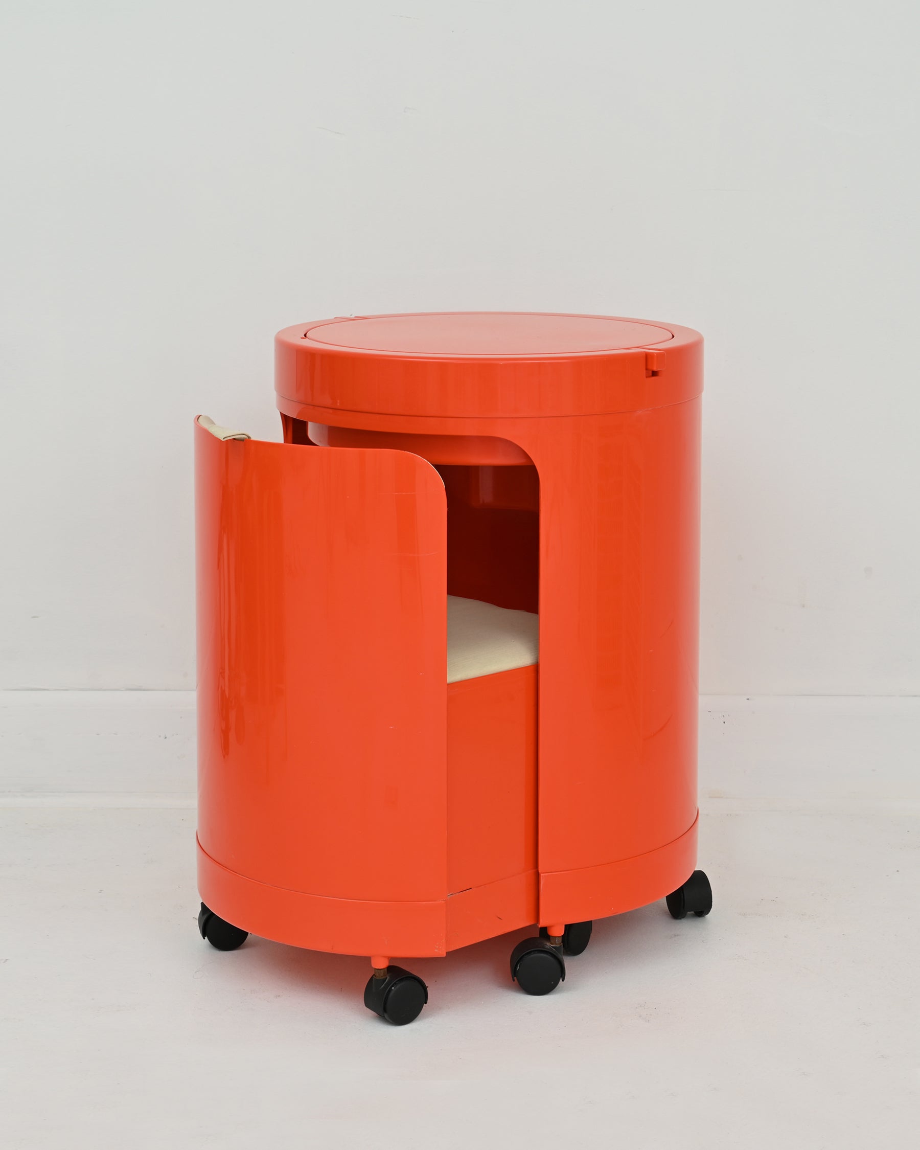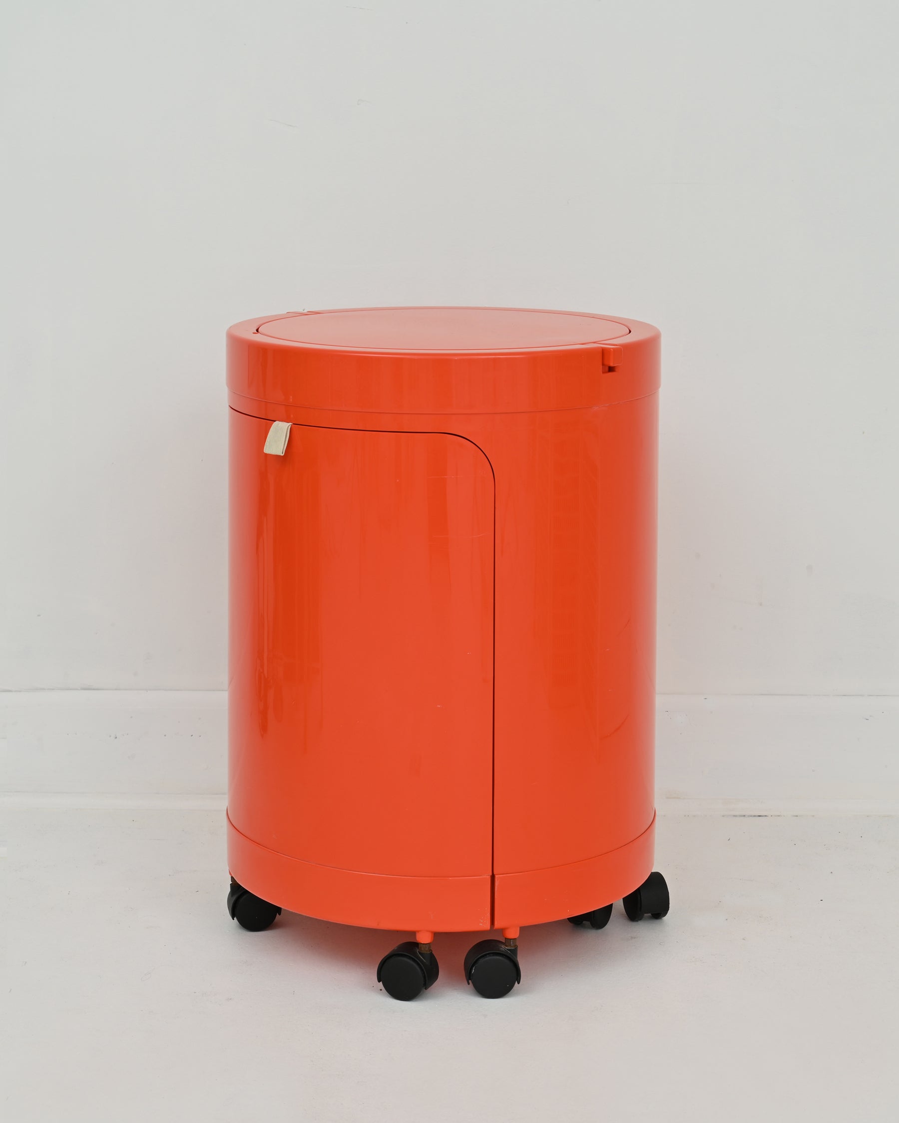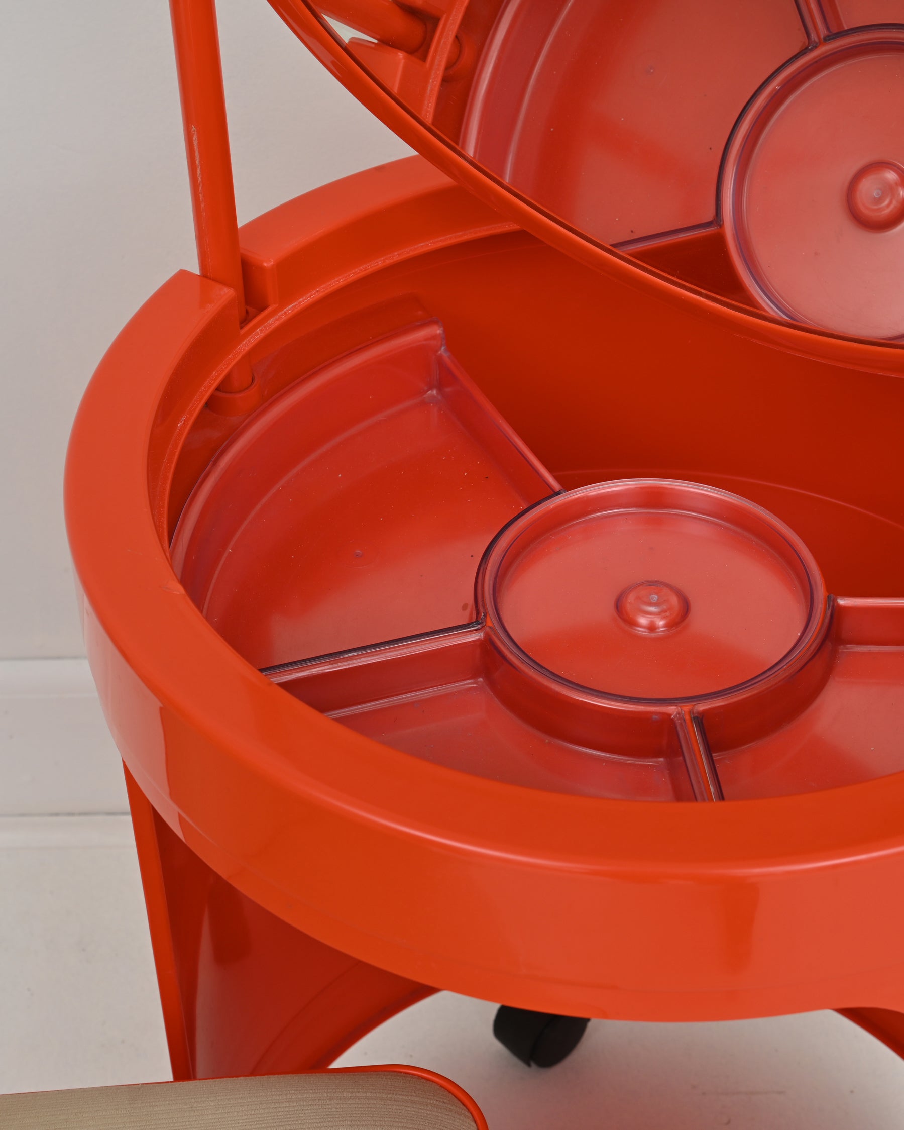 1970s rare atomic orange “Silvi” vanity mounted on wheels with pull-out chair and adjustable mirror. Plastic produced by the firm Studio Kastilia and constructed by Fanini Fain S.P.A. of Ascoli Piceno. Made in Italy. The chair fits perfectly inside to make a seamless compact cylindrical vanity. Close the mirror to create a tabletop. Pivot mirror to angle. Excellent condition. Some discoloration and small amount of warping on tabletop from age and use. Original upholstery has some wear from age. But otherwise in excellent condition. This item will be the cornerstone of any room with its metamorphic nature.