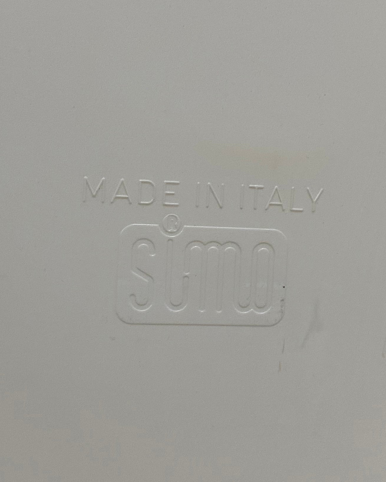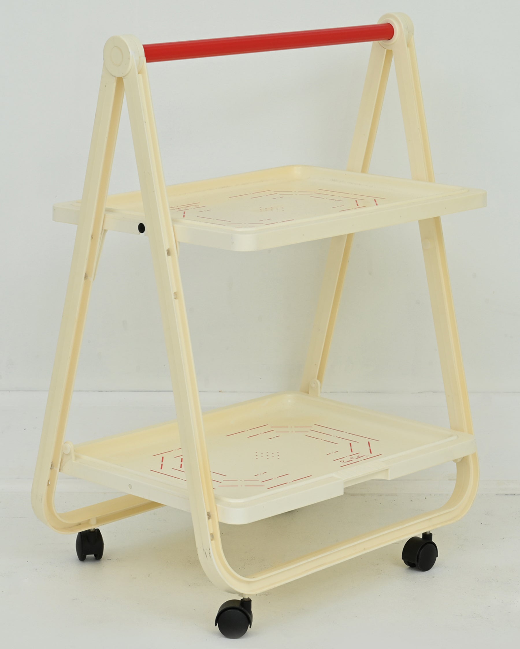 1970s exceedingly rare bar cart designed by Pierre Cardin for Simo. Pierre Cardin maker’s mark throughout. It is versatile, lightweight, yet has a strong plastic construction. Some discoloration spots due to age. Rolls easily but does not fold up and has been secured open.
