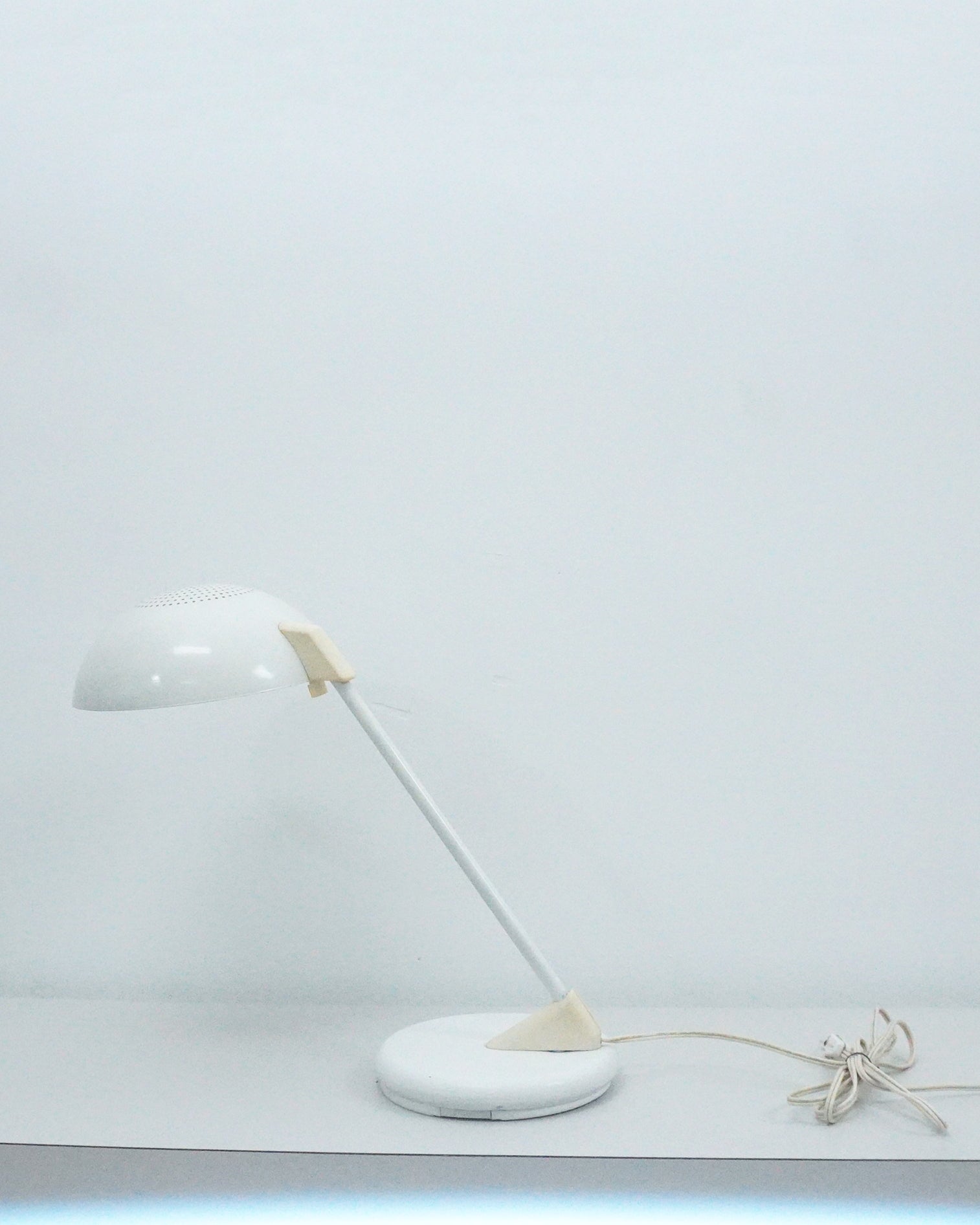 Vintage table lamp made of a white metal frame and shade in pilastro style. Some minor wear to metal and plastic.