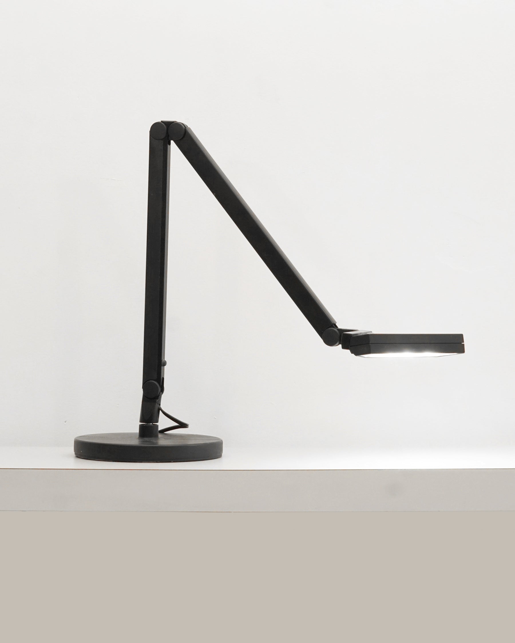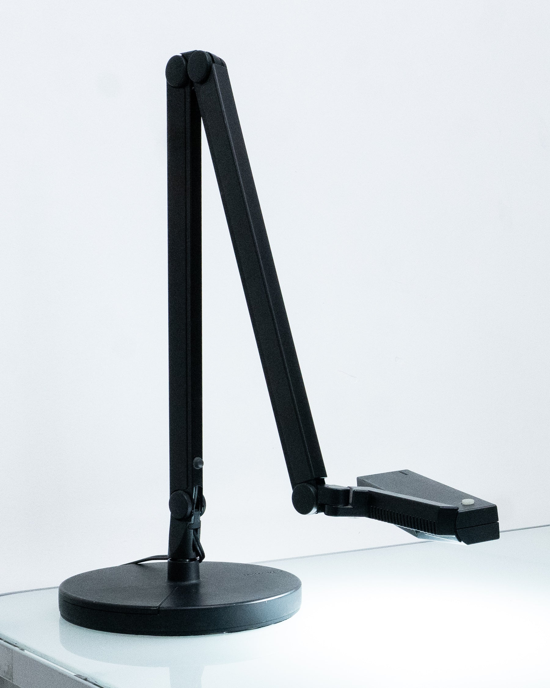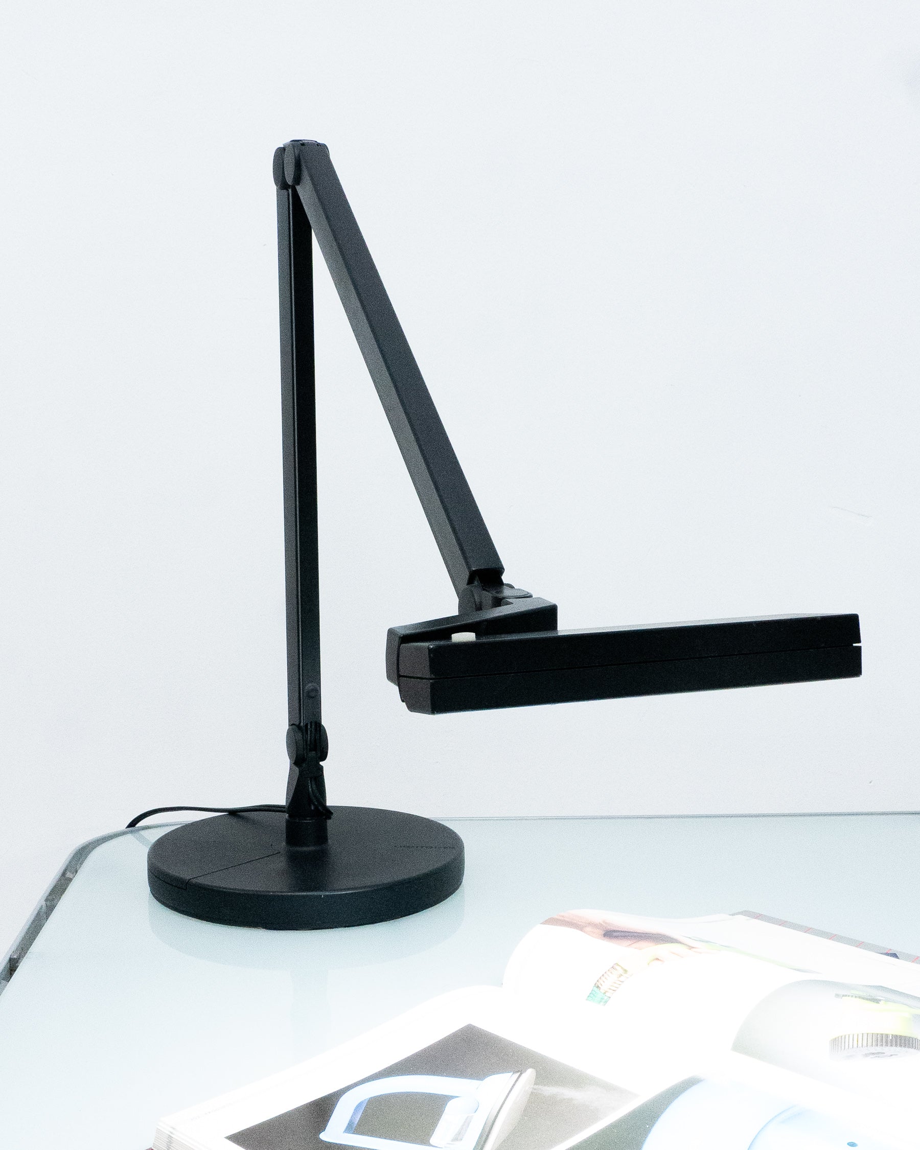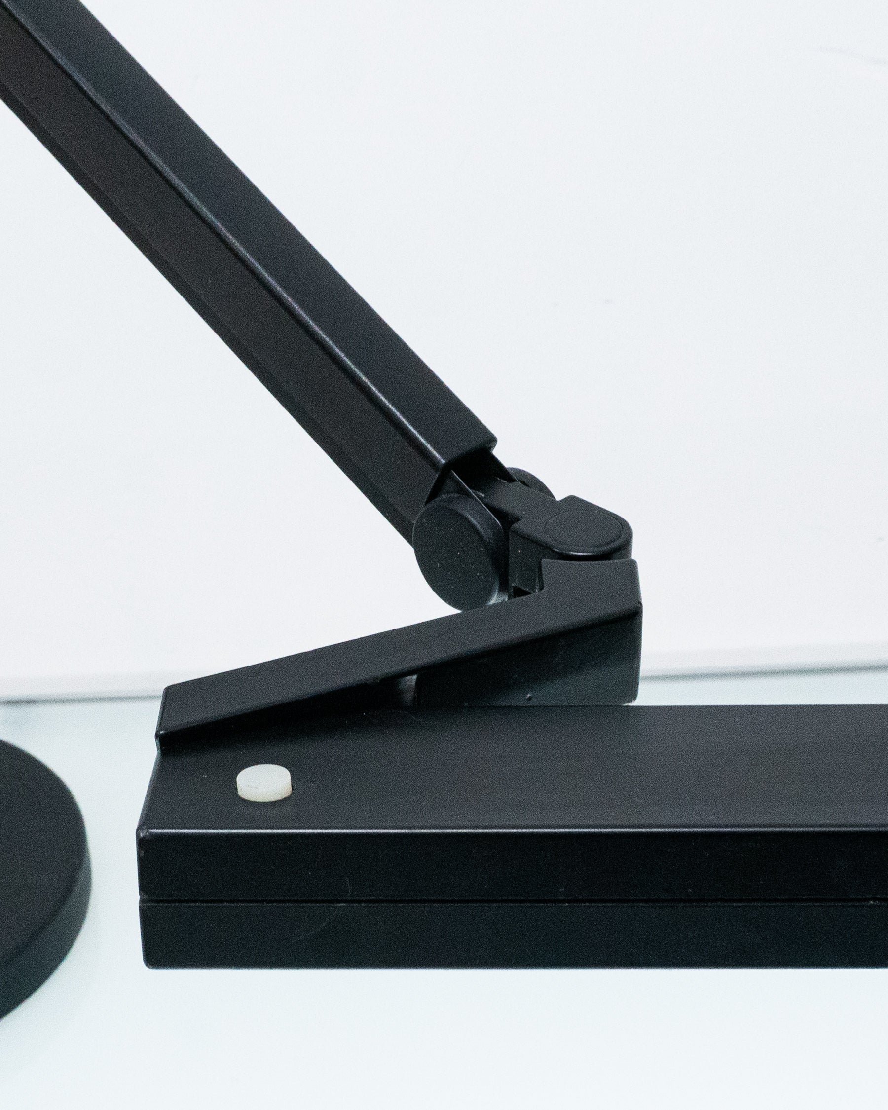 1980s black Lightolier desk lamp. Extremely heavy base. Tension arm makes the lamp adjustable to many configurations.
