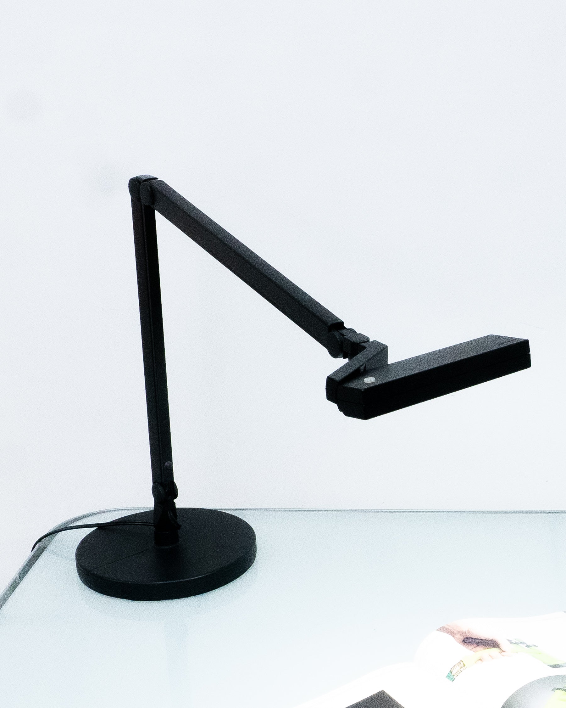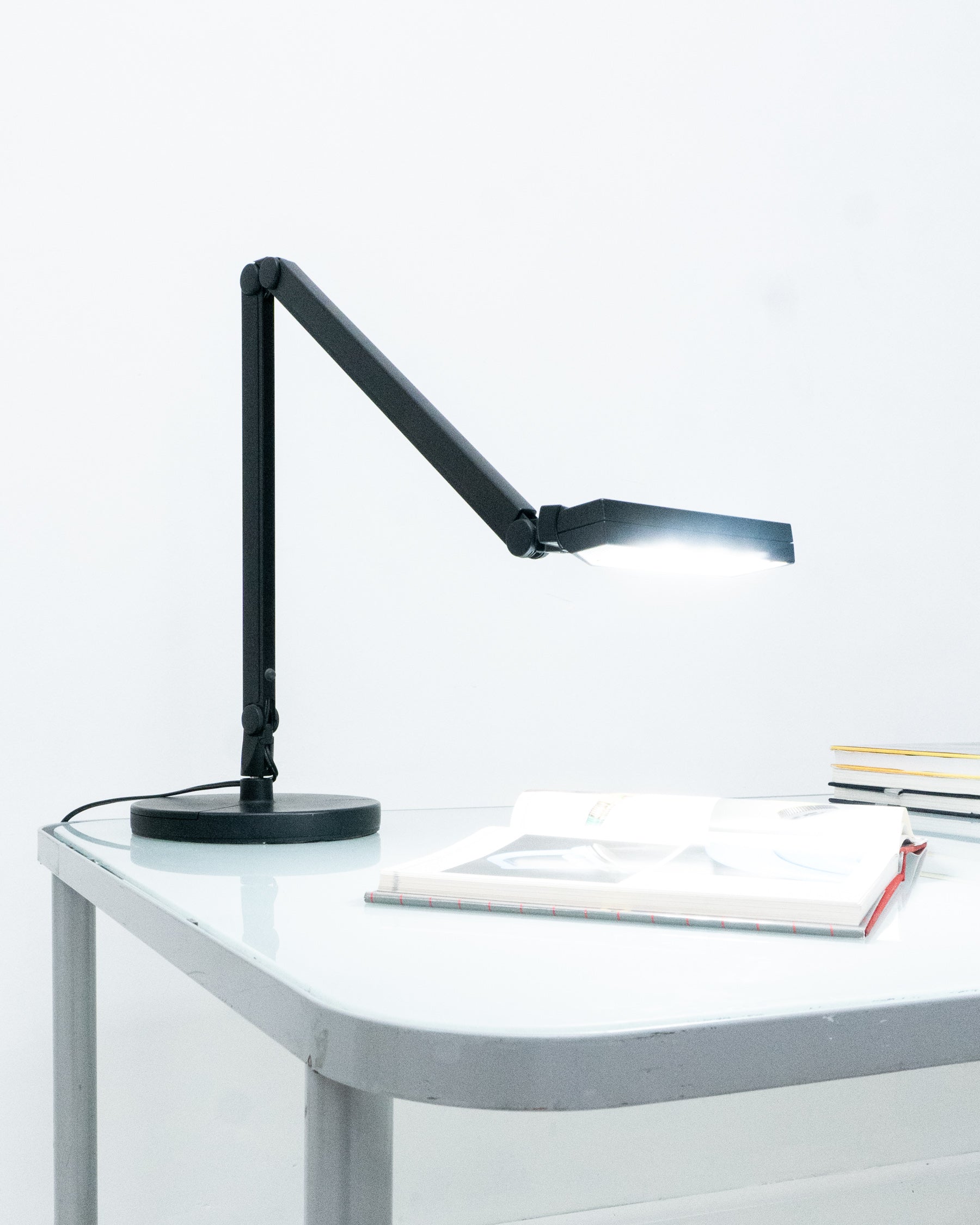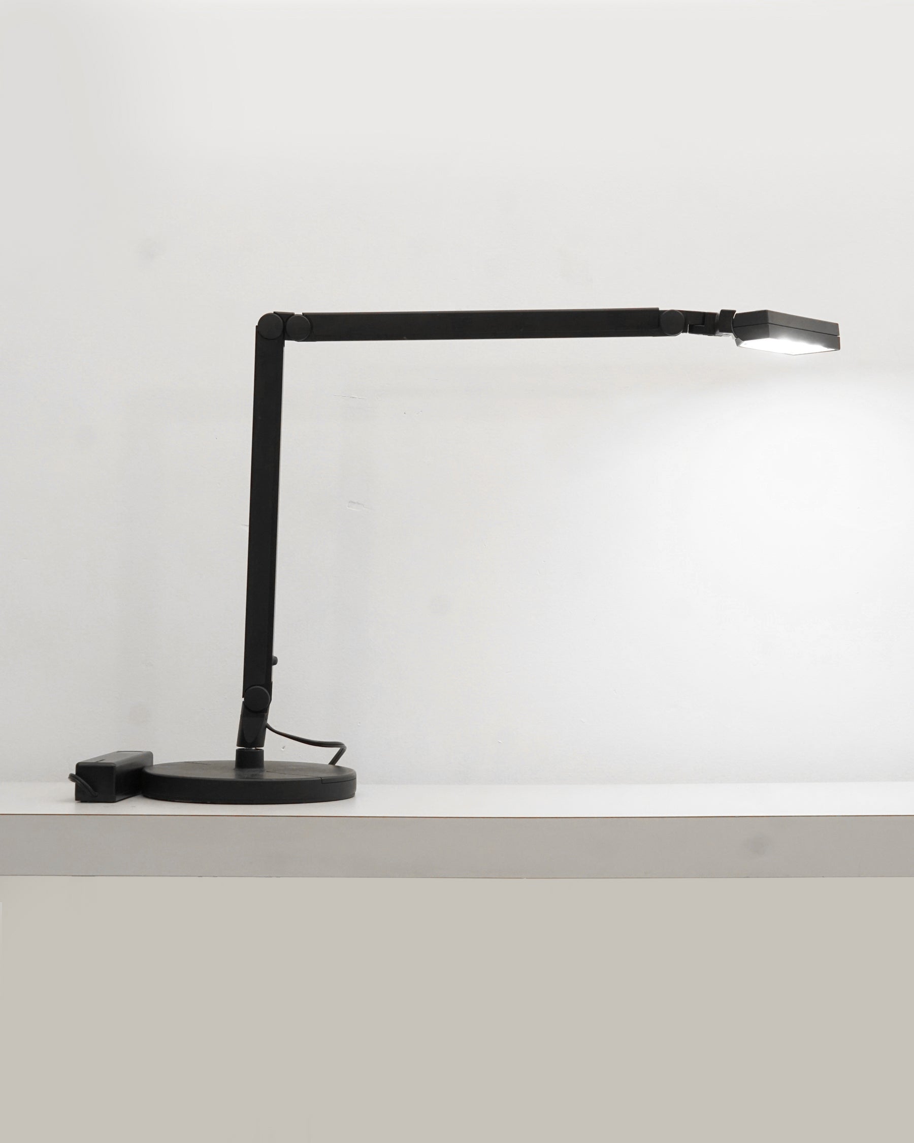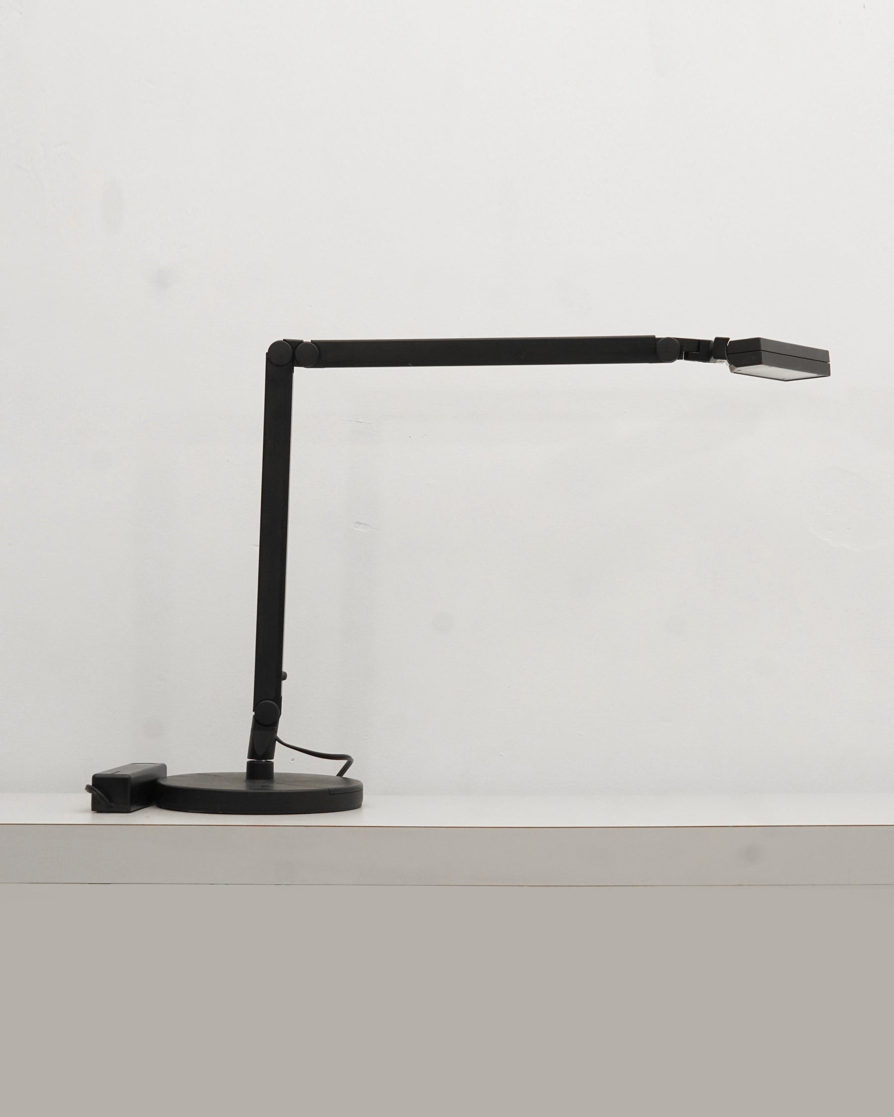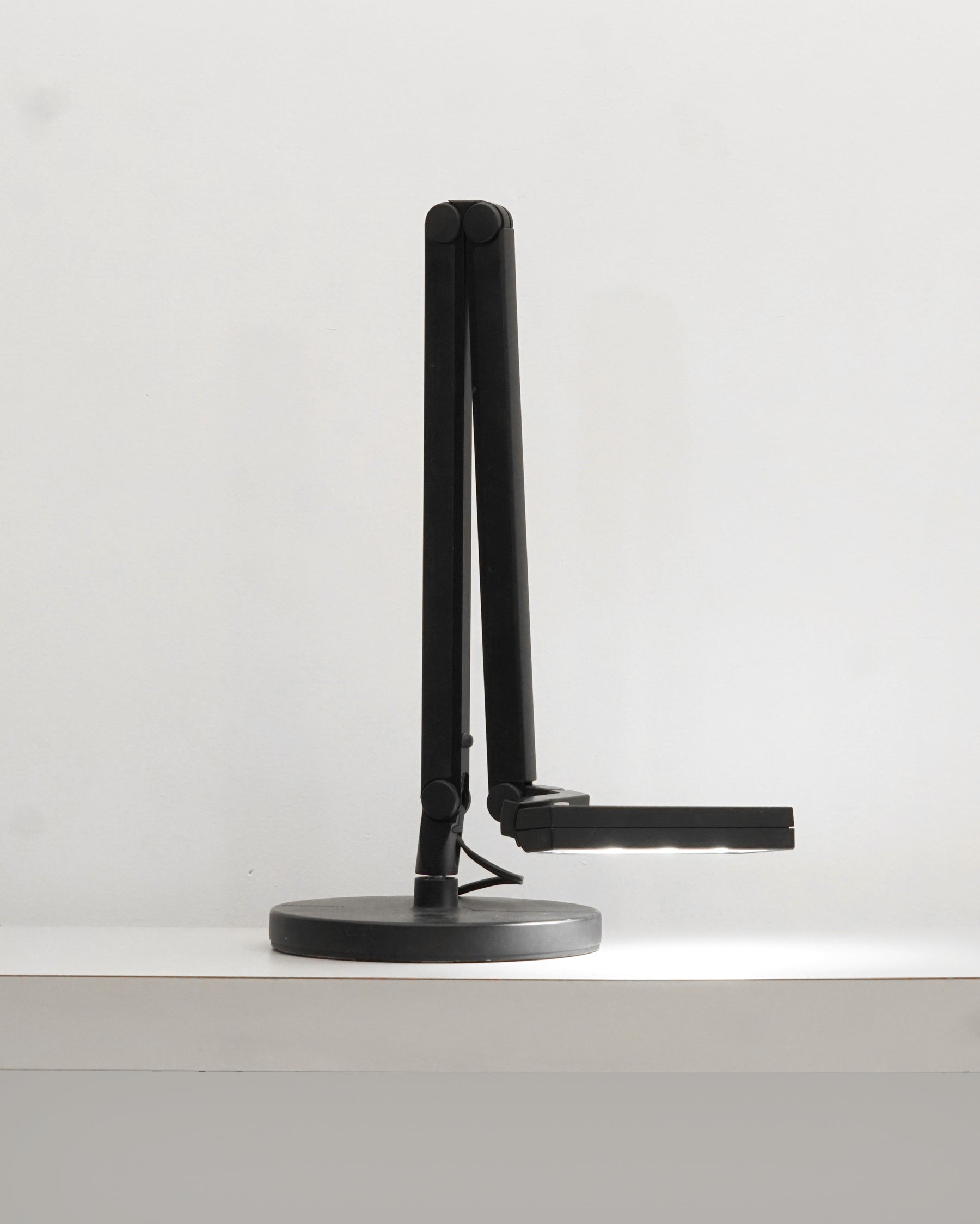 1980s black Lightolier desk lamp. Extremely heavy base. Tension arm makes the lamp adjustable to many configurations.