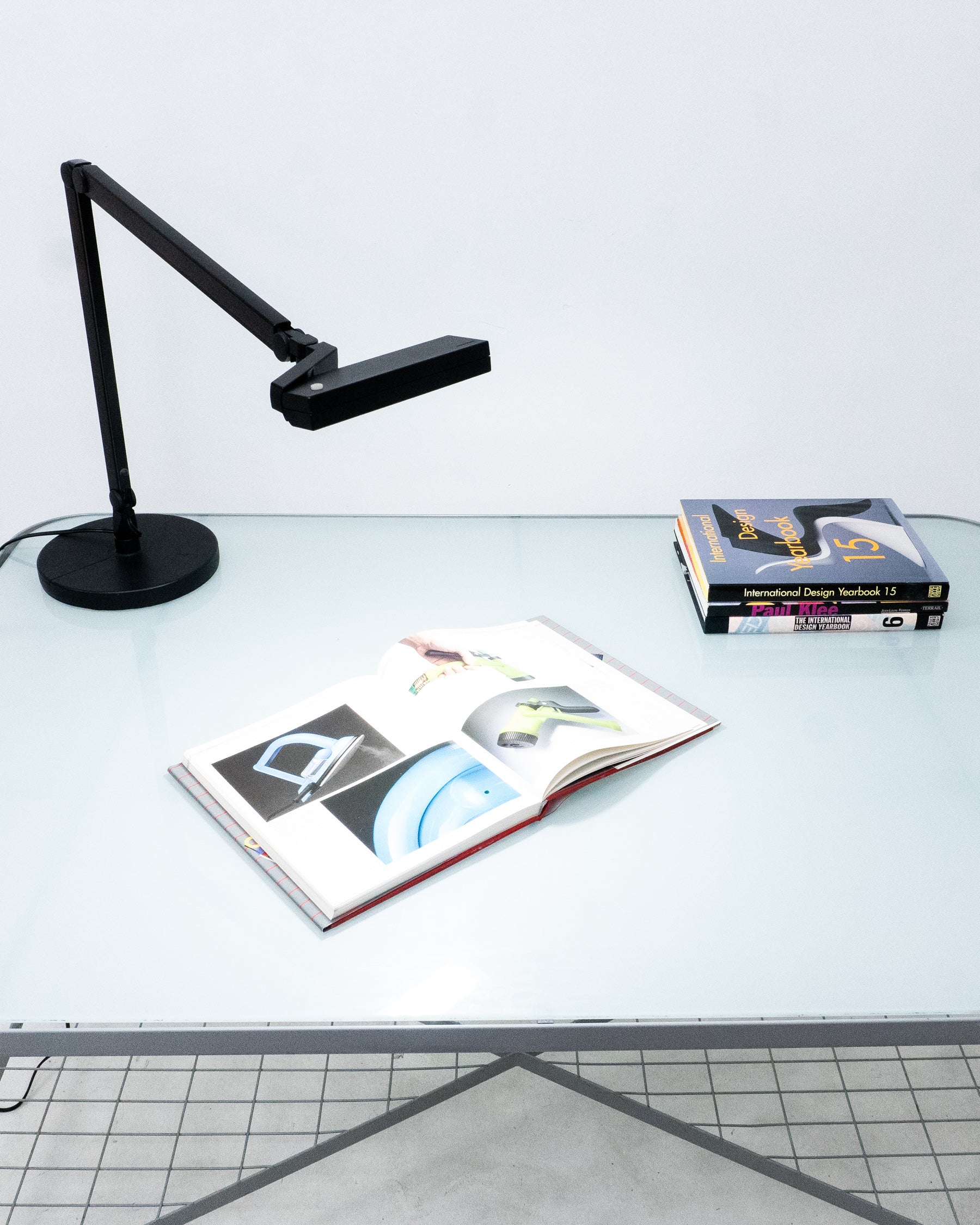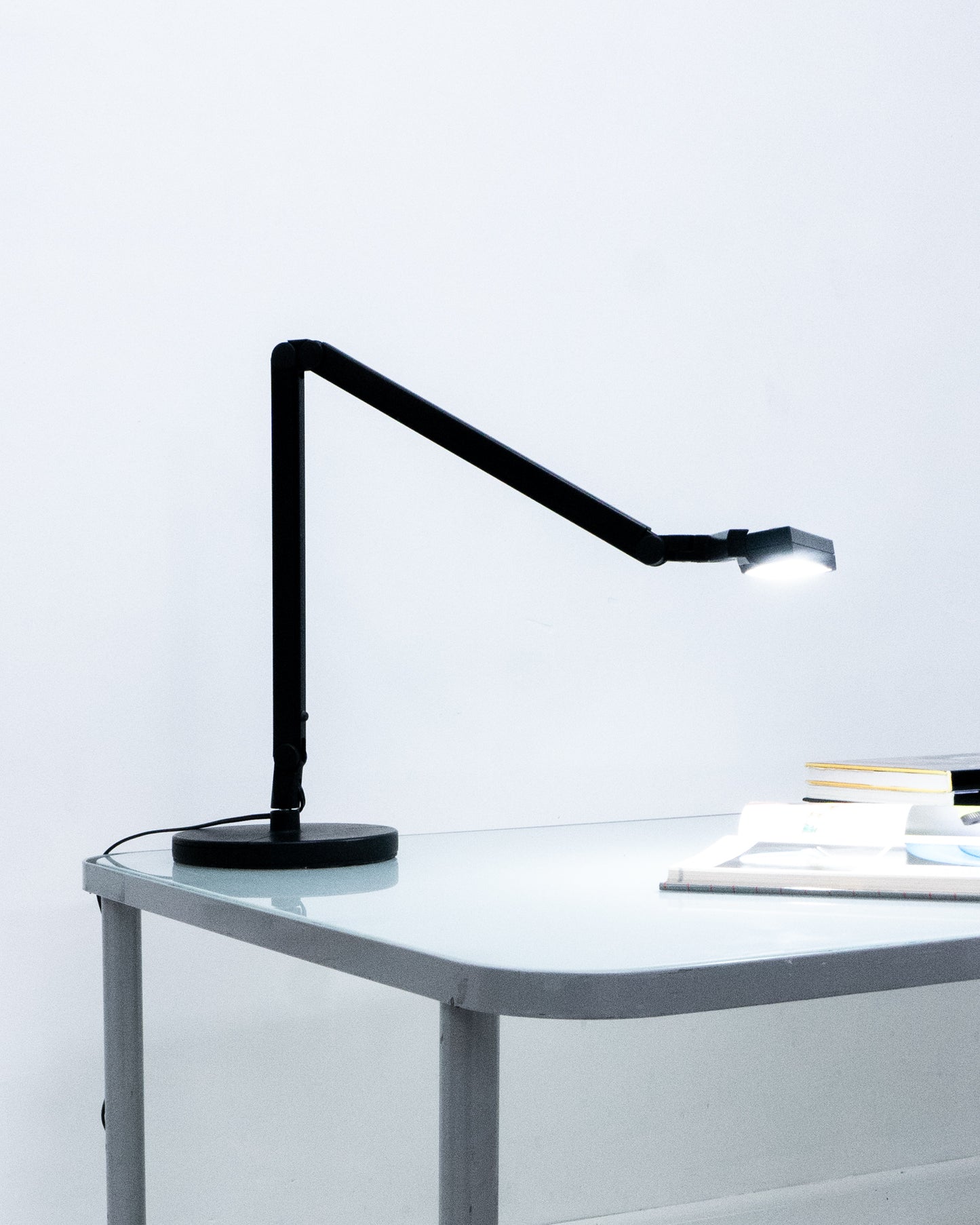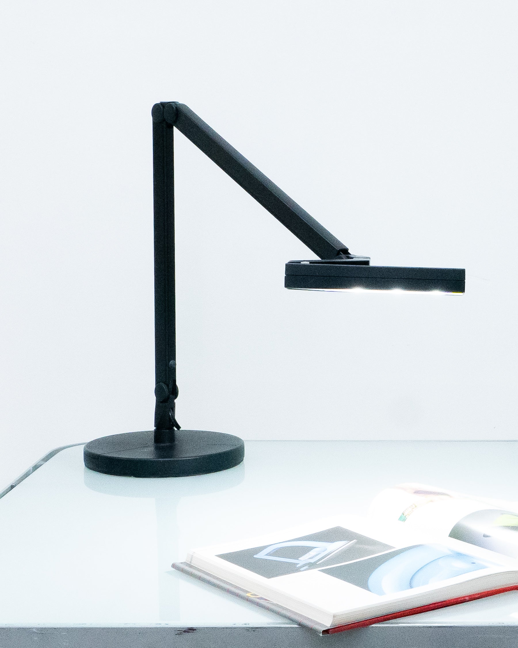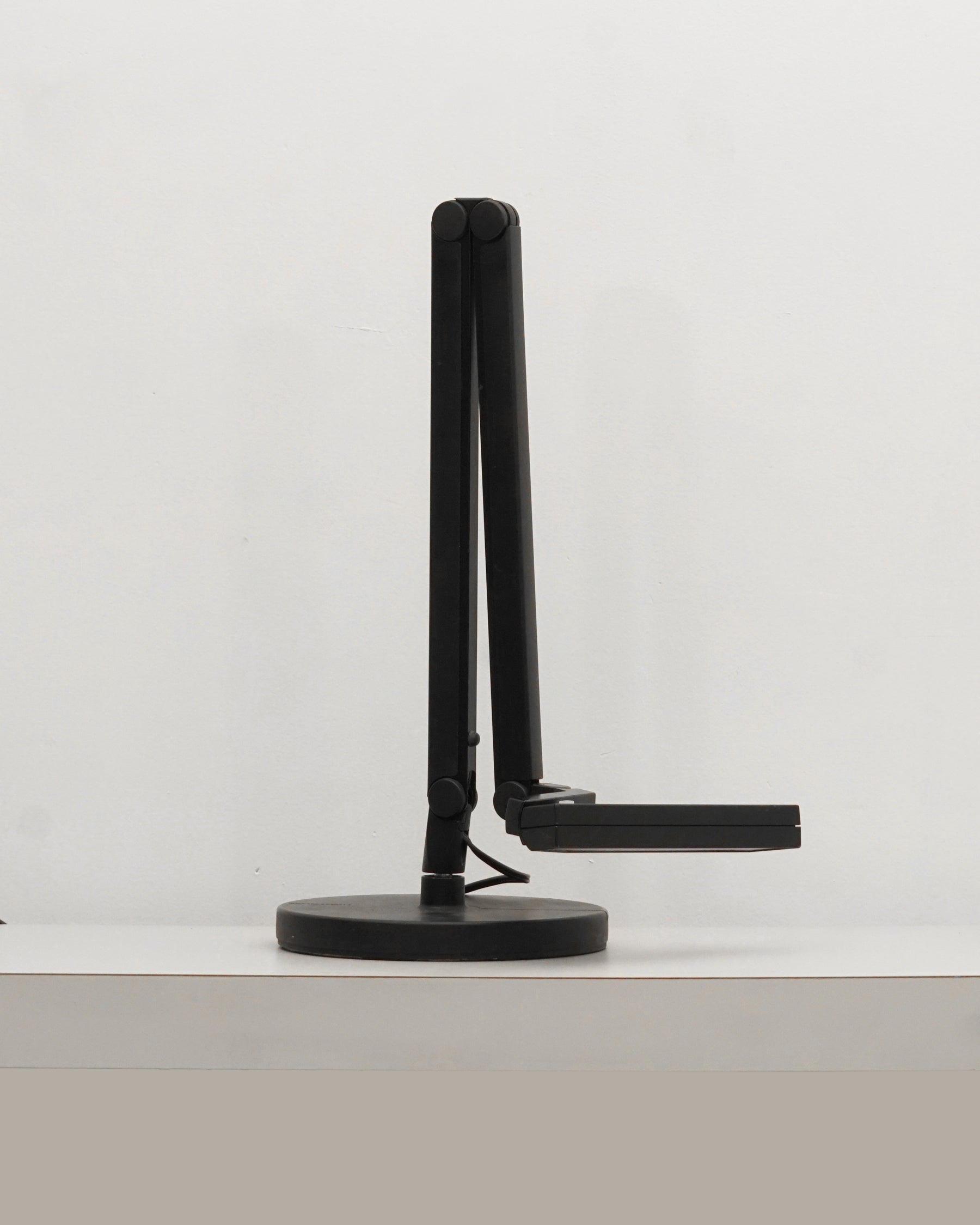 1980s black Lightolier desk lamp. Extremely heavy base. Tension arm makes the lamp adjustable to many configurations.