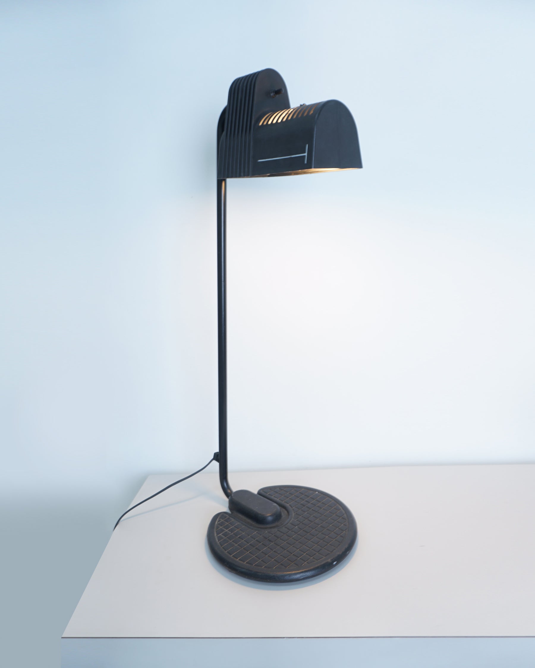 1980s black metal and plastic table lamp by Belux. Made in Spain. Very heavy metal base and swivel fixture. In good condition with some wear to plastic.