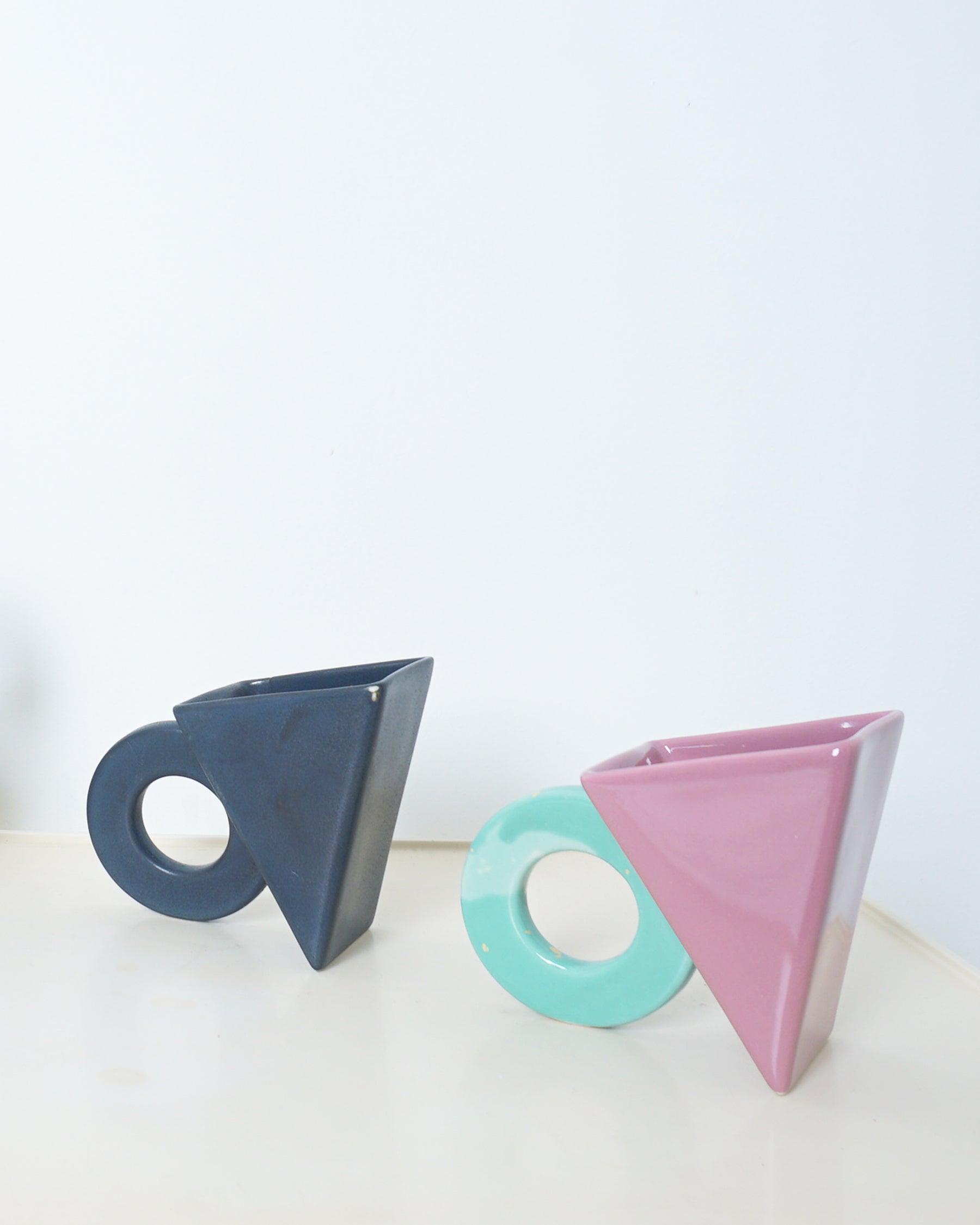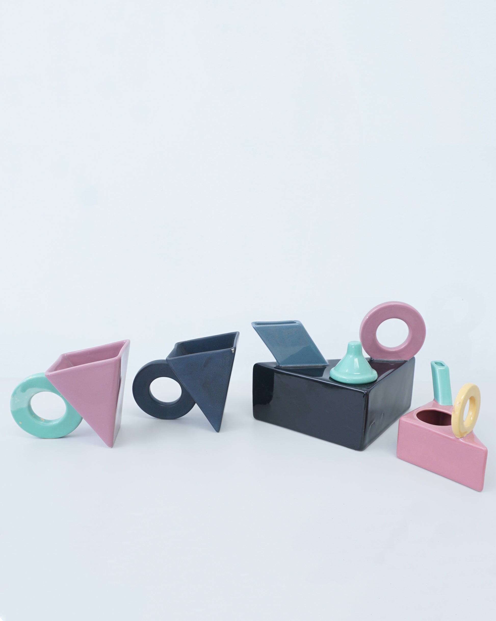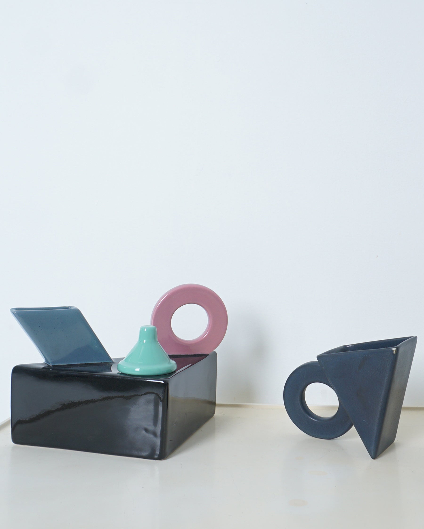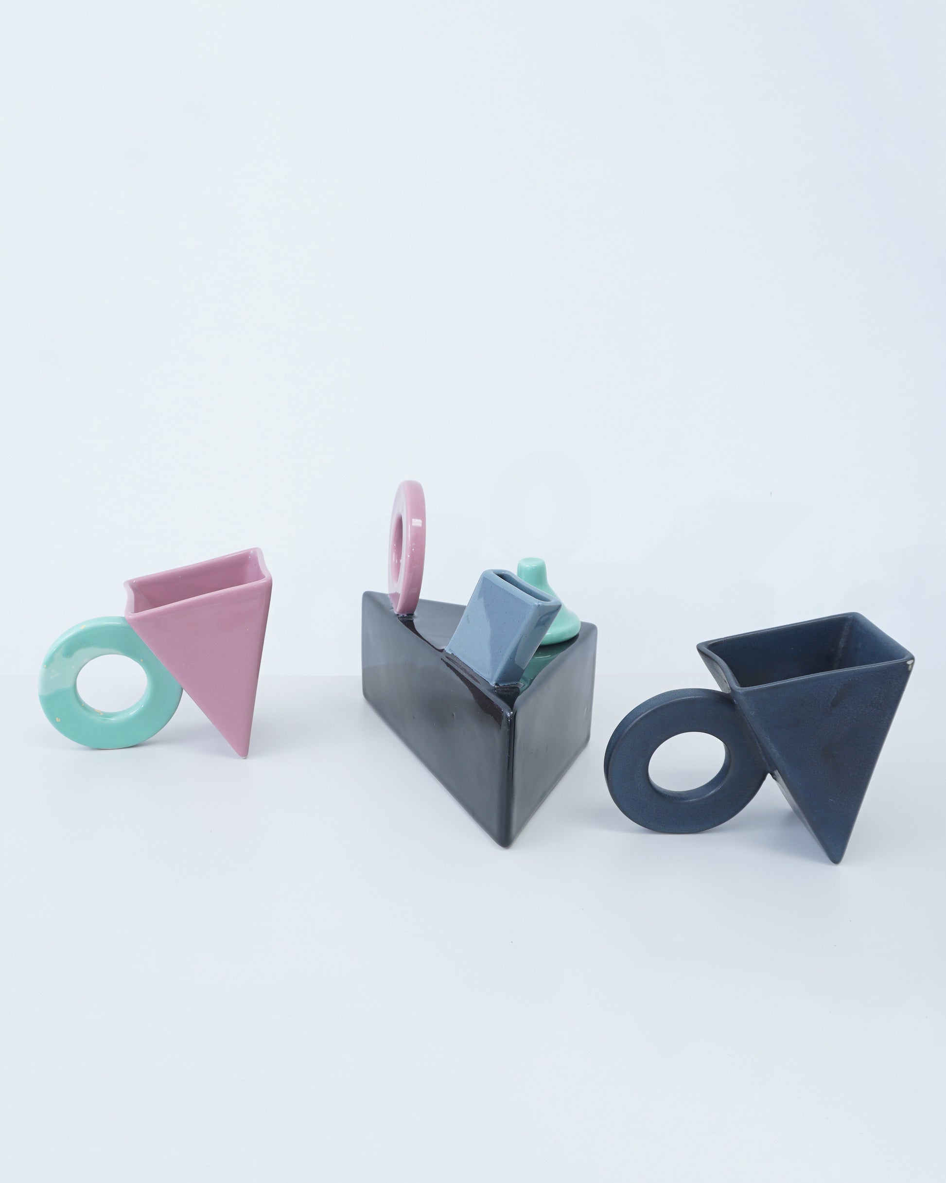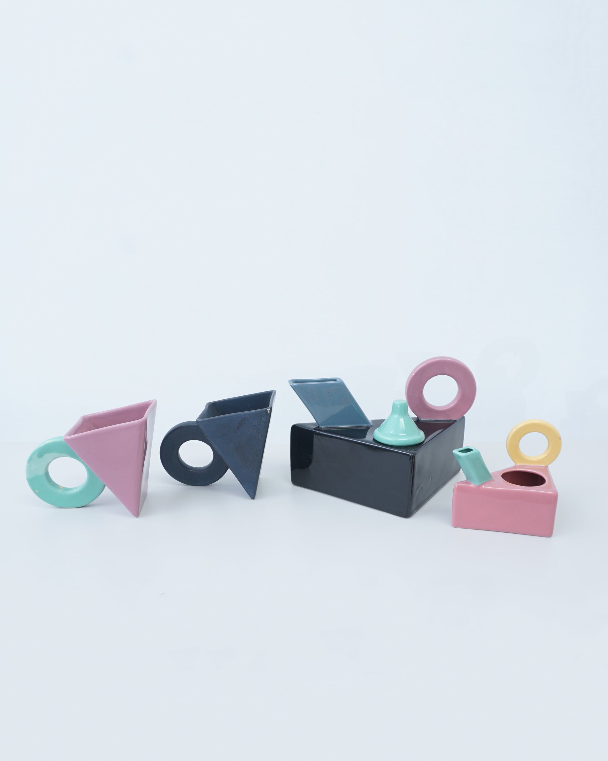 1980s rare collection of teapot, creamer, and two mugs from the pottery line, Feltman Langer. Named the Clubb '88 tea service, the service is made up of color-blocked cups, a creamer, a covered sugar bowl, and a teapot, which were offered in several combinations of color-ways. The set clearly takes its inspiration from the Memphis Movement of the 1980s. Often marked with an affixed removable foil label, these were removed on the set.