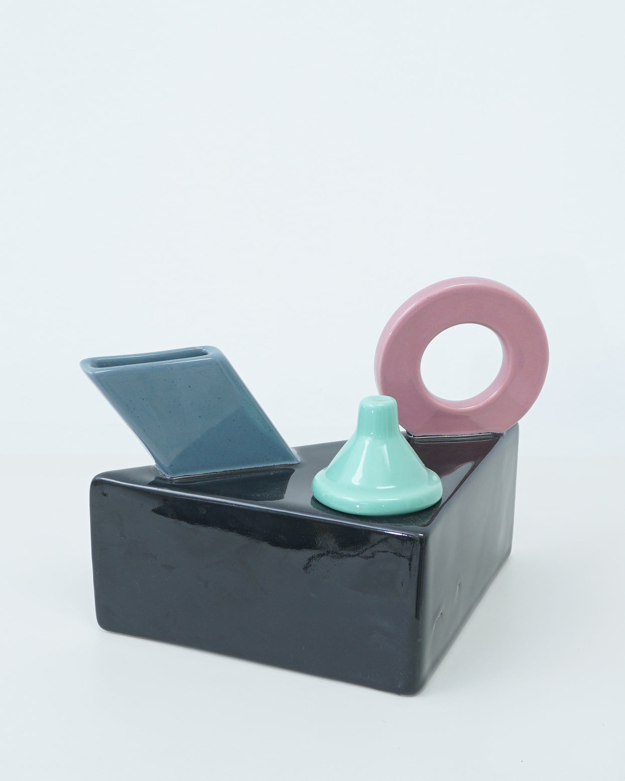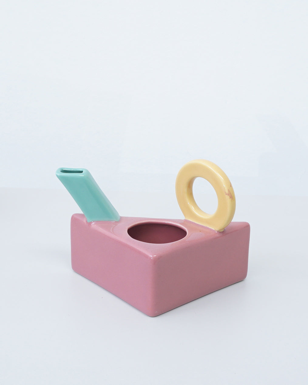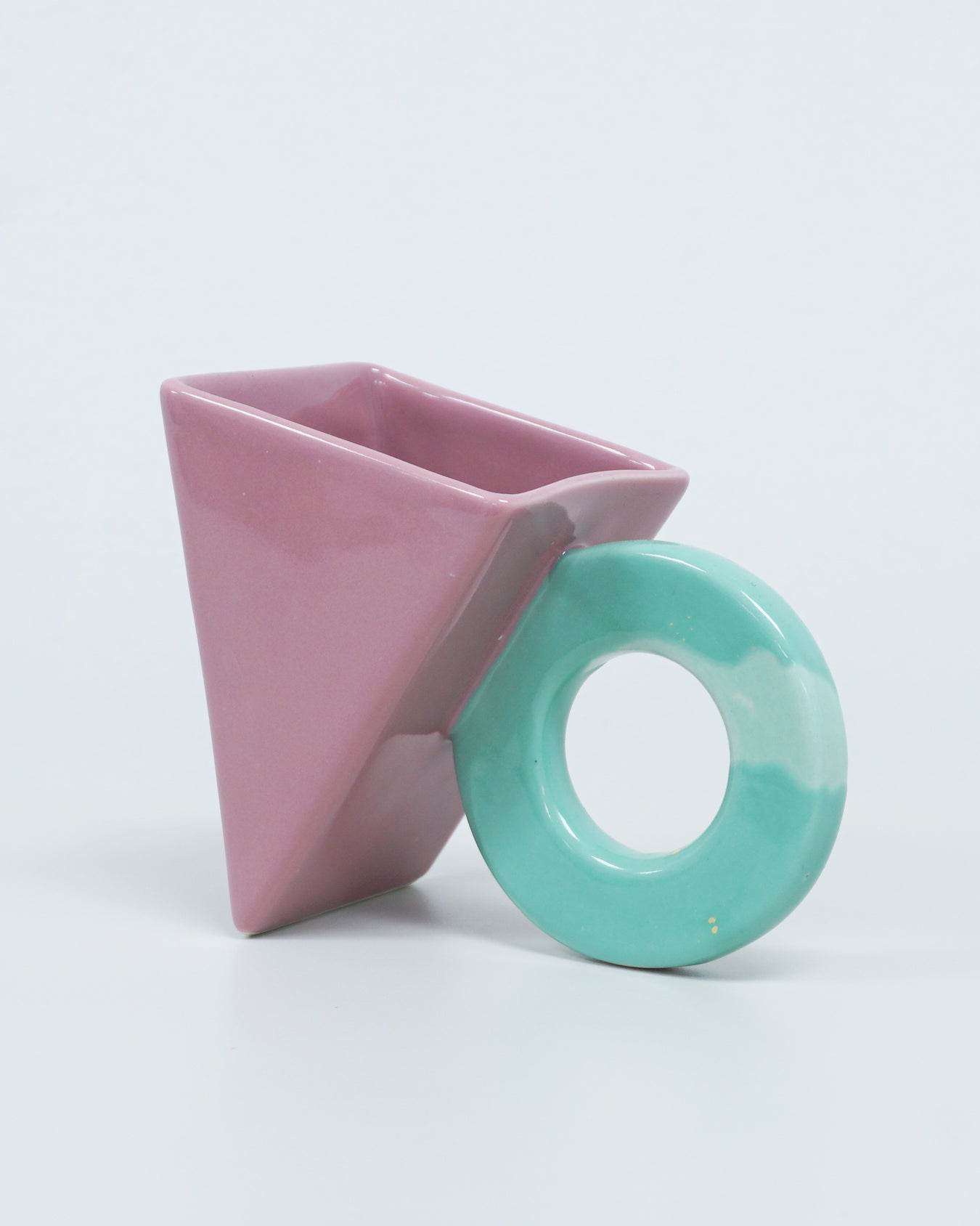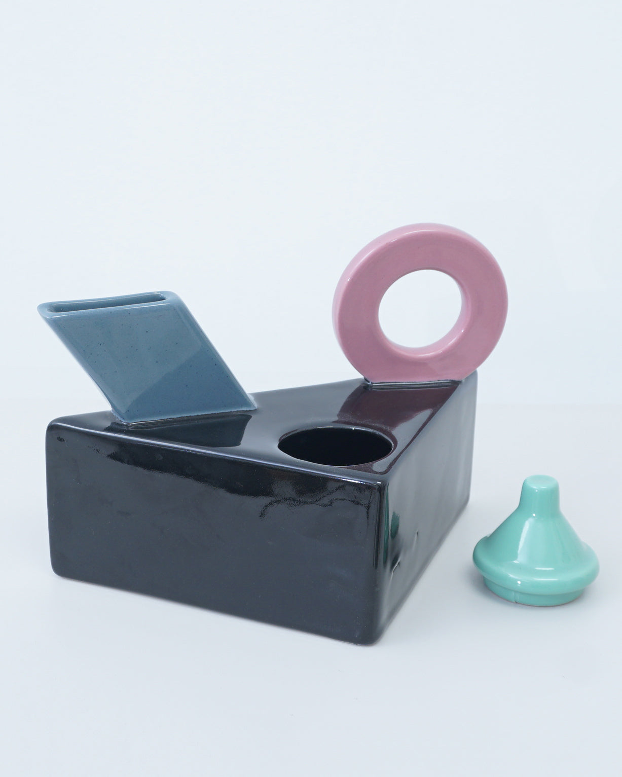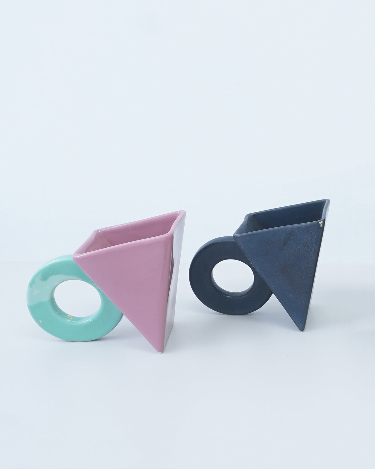 1980s rare collection of teapot, creamer, and two mugs from the pottery line, Feltman Langer. Named the Clubb '88 tea service, the service is made up of color-blocked cups, a creamer, a covered sugar bowl, and a teapot, which were offered in several combinations of color-ways. The set clearly takes its inspiration from the Memphis Movement of the 1980s. Often marked with an affixed removable foil label, these were removed on the set.