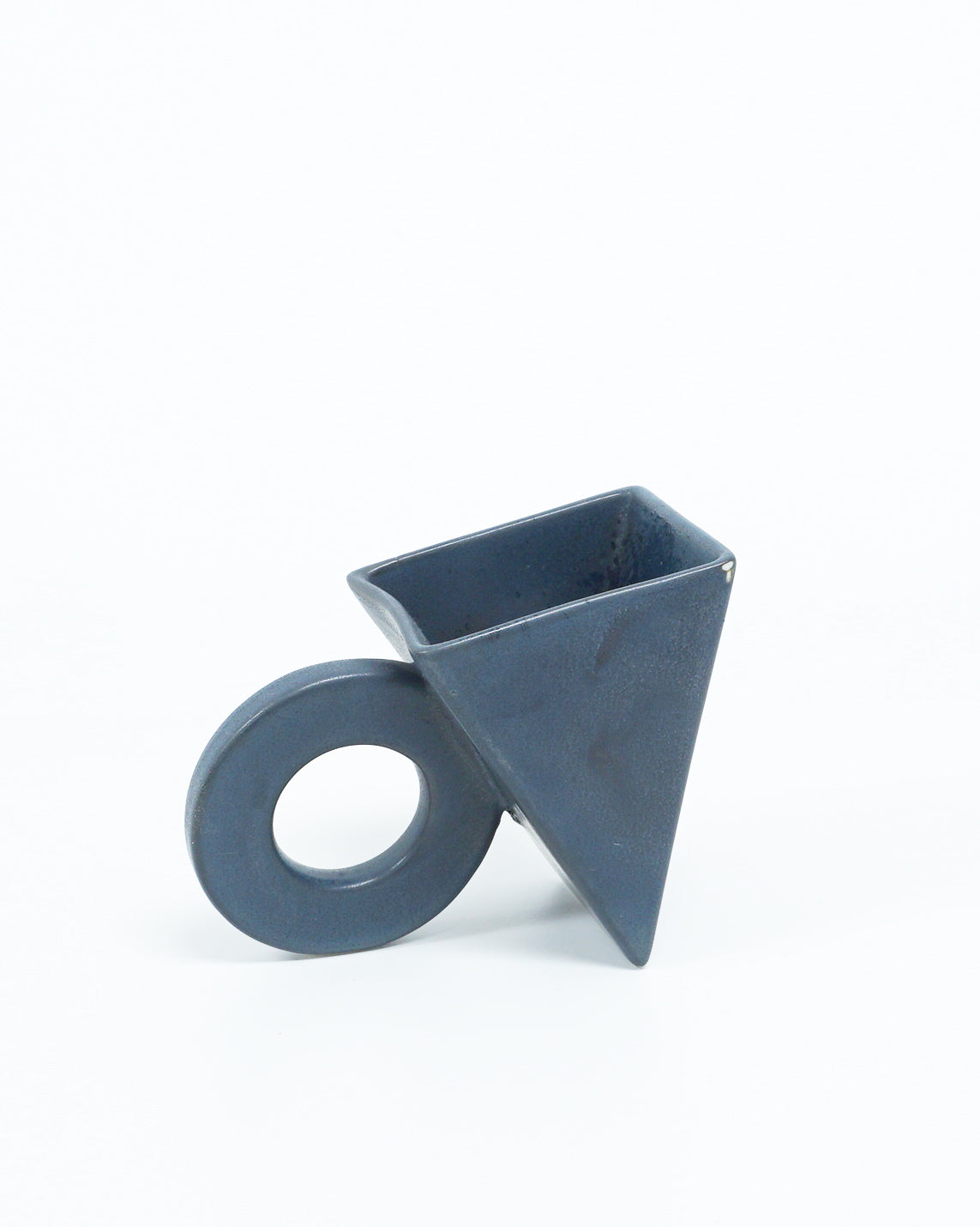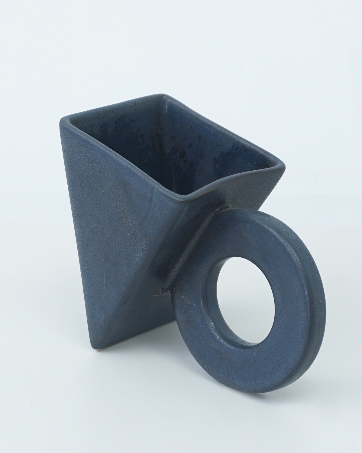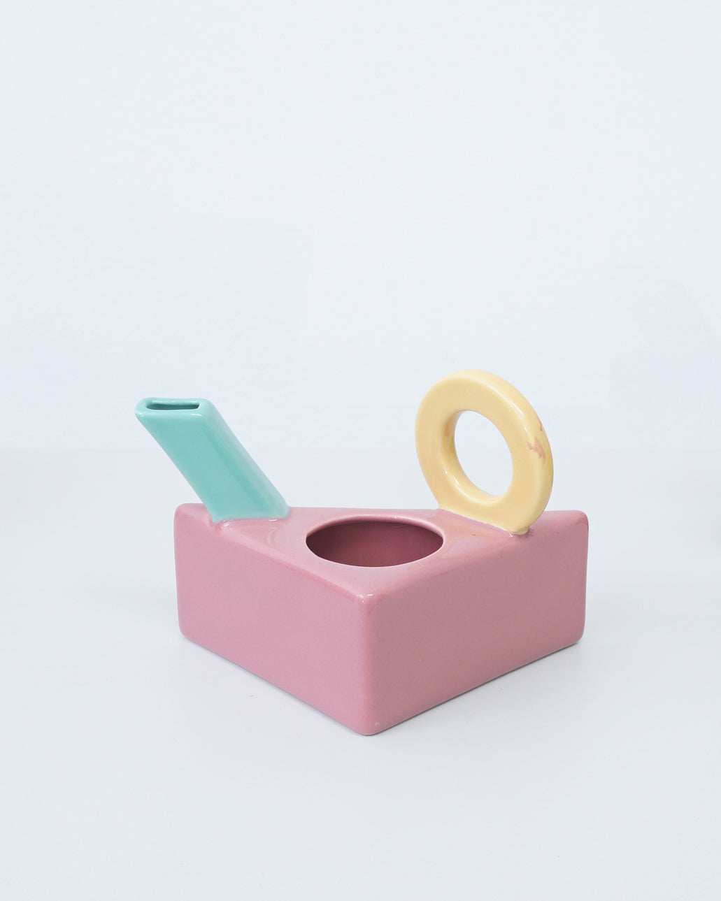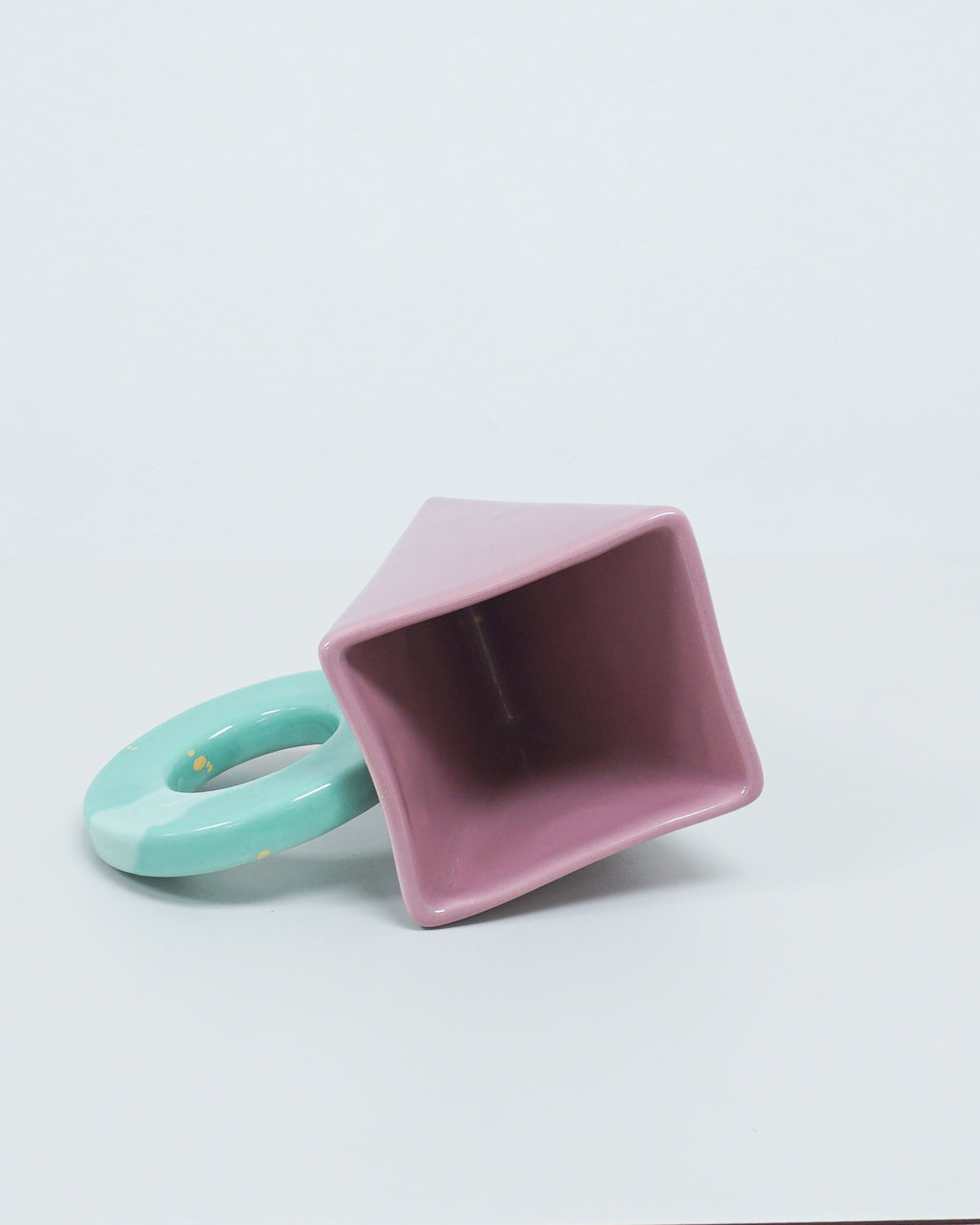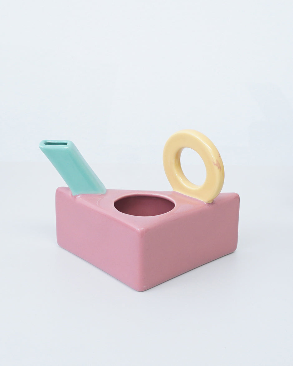 1980s rare collection of teapot, creamer, and two mugs from the pottery line, Feltman Langer. Named the Clubb '88 tea service, the service is made up of color-blocked cups, a creamer, a covered sugar bowl, and a teapot, which were offered in several combinations of color-ways. The set clearly takes its inspiration from the Memphis Movement of the 1980s. Often marked with an affixed removable foil label, these were removed on the set.