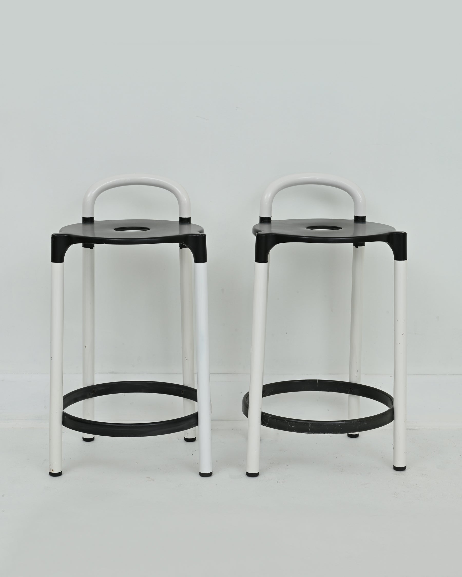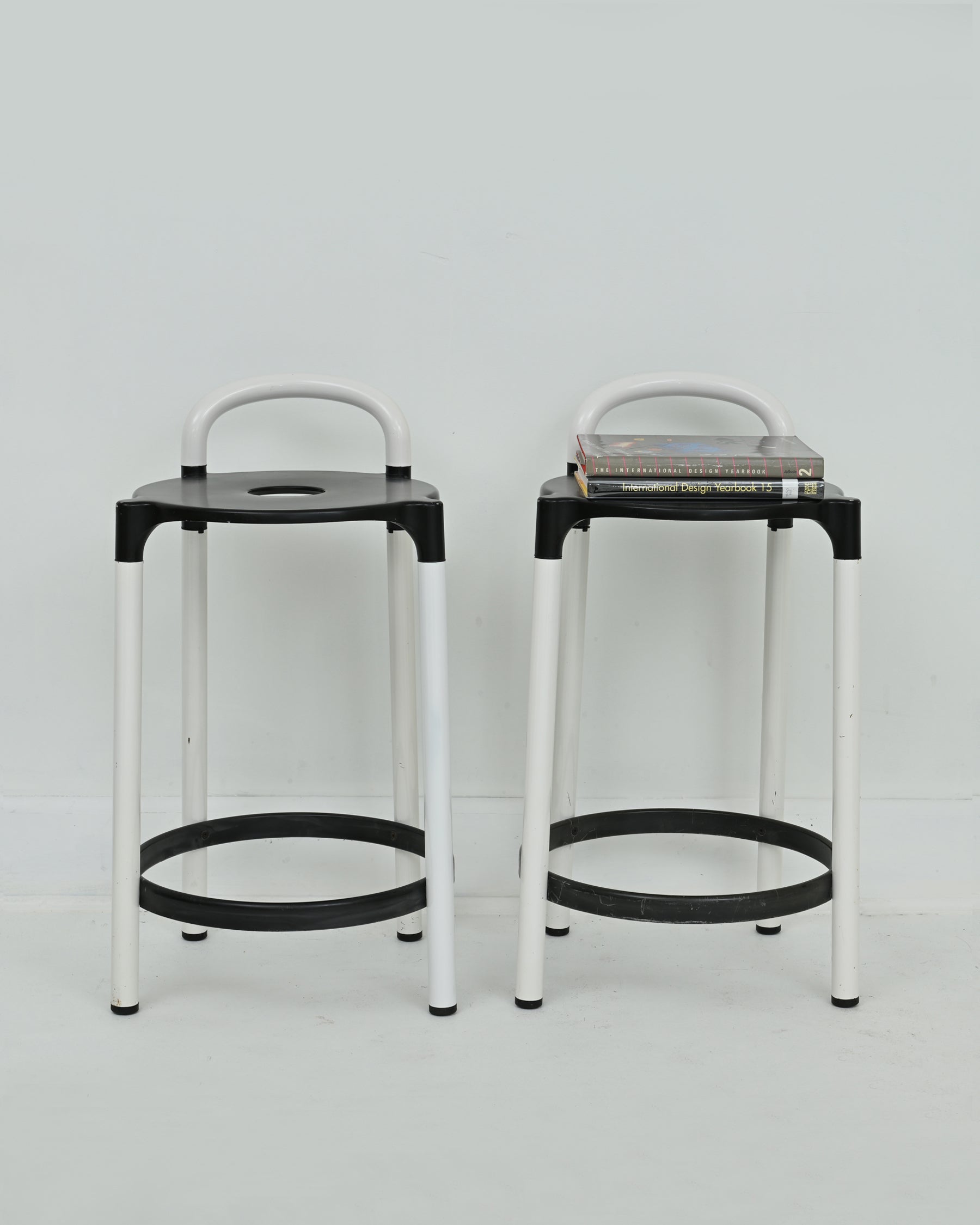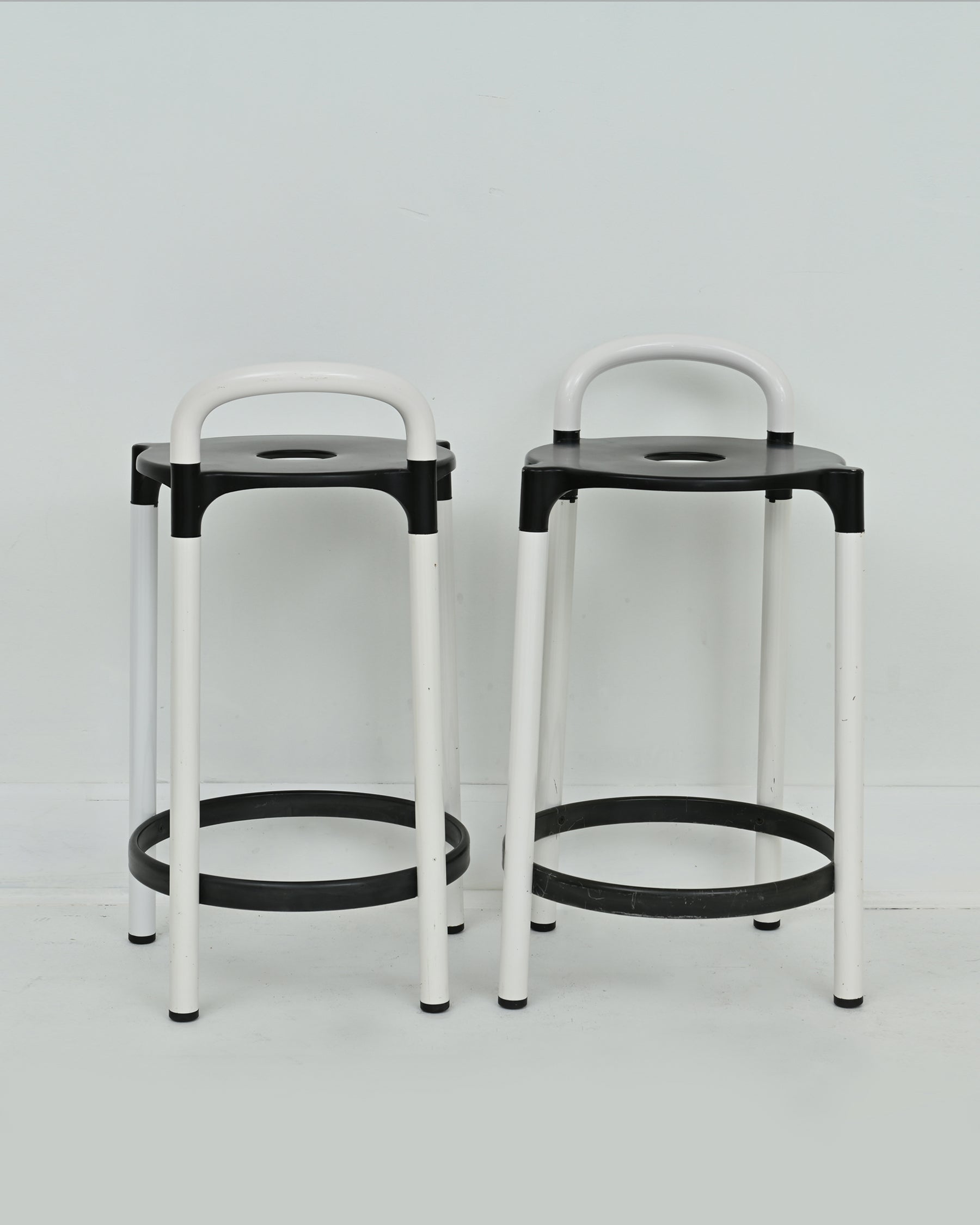 1980s pair of postmodern stools by Anna Casatelli Ferrieri for Kartell. Made in Italy. Black and white colorway. In good vintage condition with some signs of wear and varying shades of white paint due to age. Price is reduced for this reason.