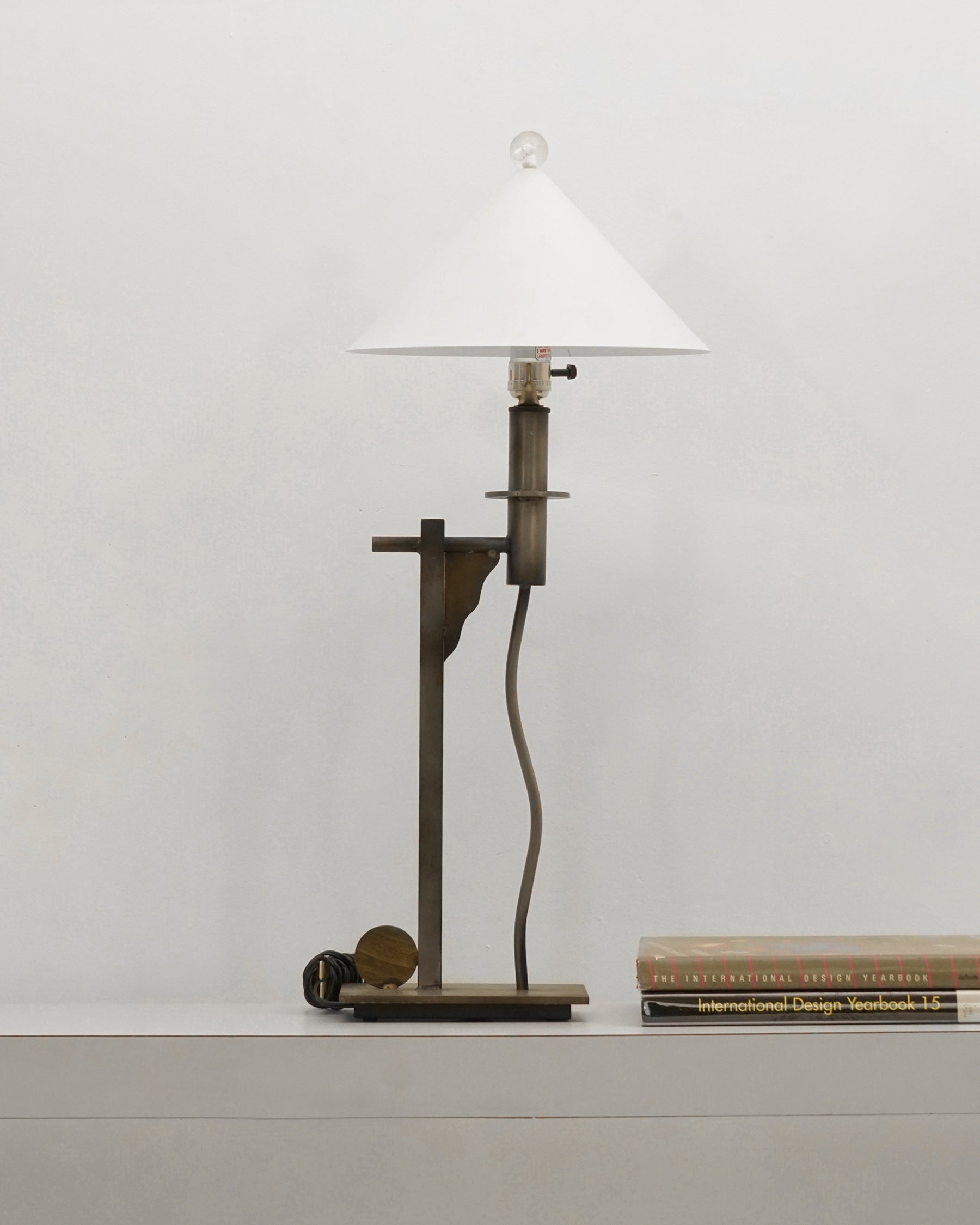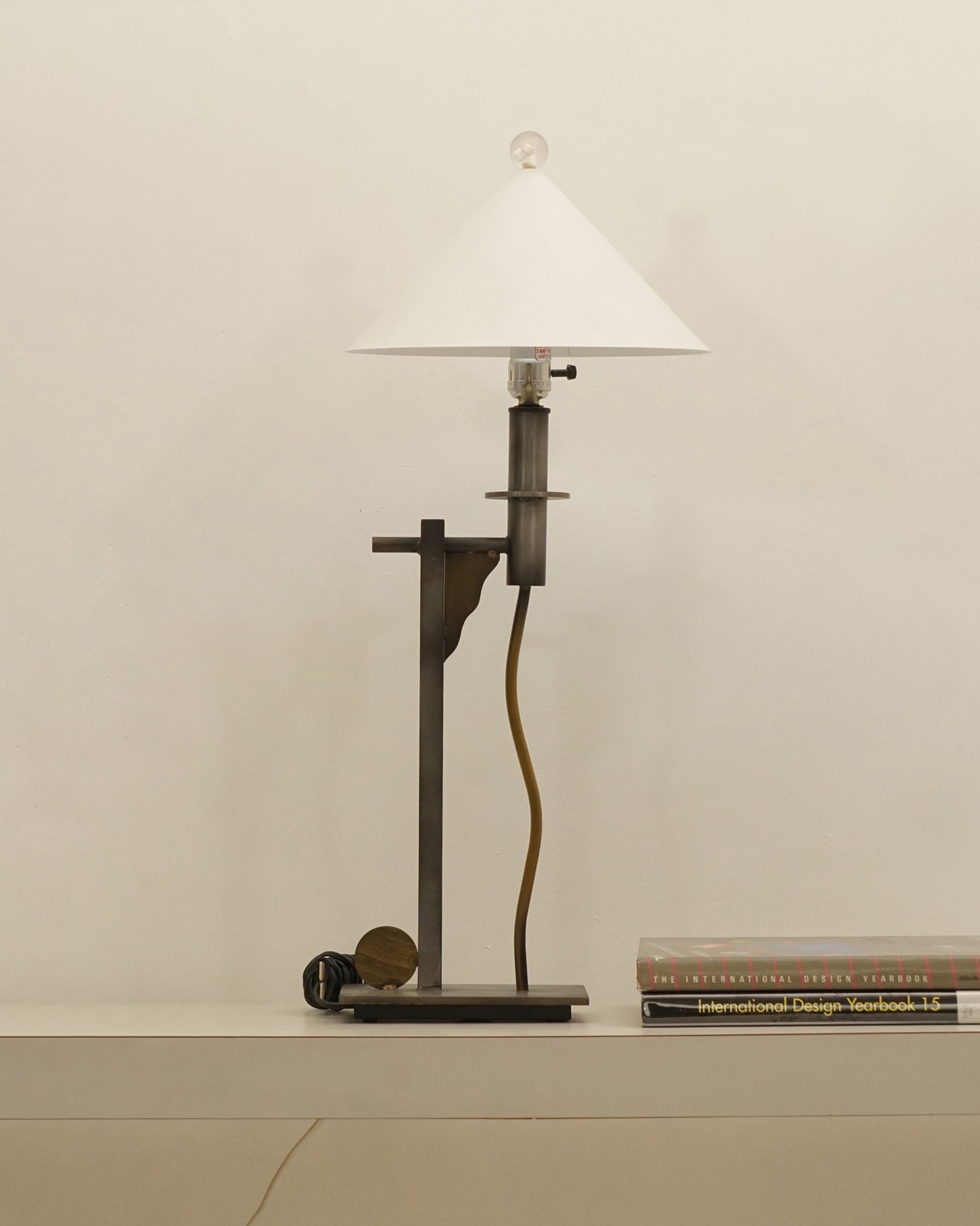 1980s Postmodern, Memphis lamp by Robert Sonneman for Geroge Kovacs. Metal conde shade base with contrasting gunmetal and brass shapes and finishes. Acrylic finial. Shade a replacement and not an original. In excellent and works well. Overall wear is consistent with age and use. Signed with the original label to underside.