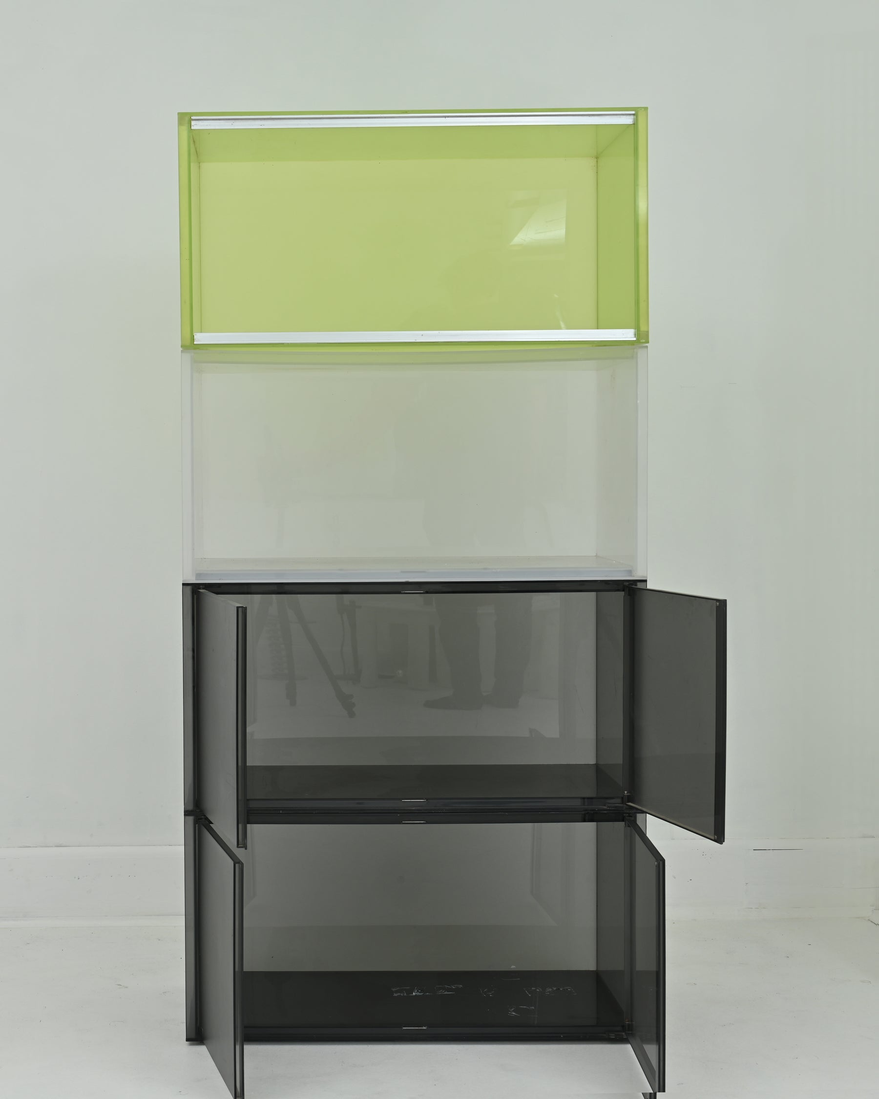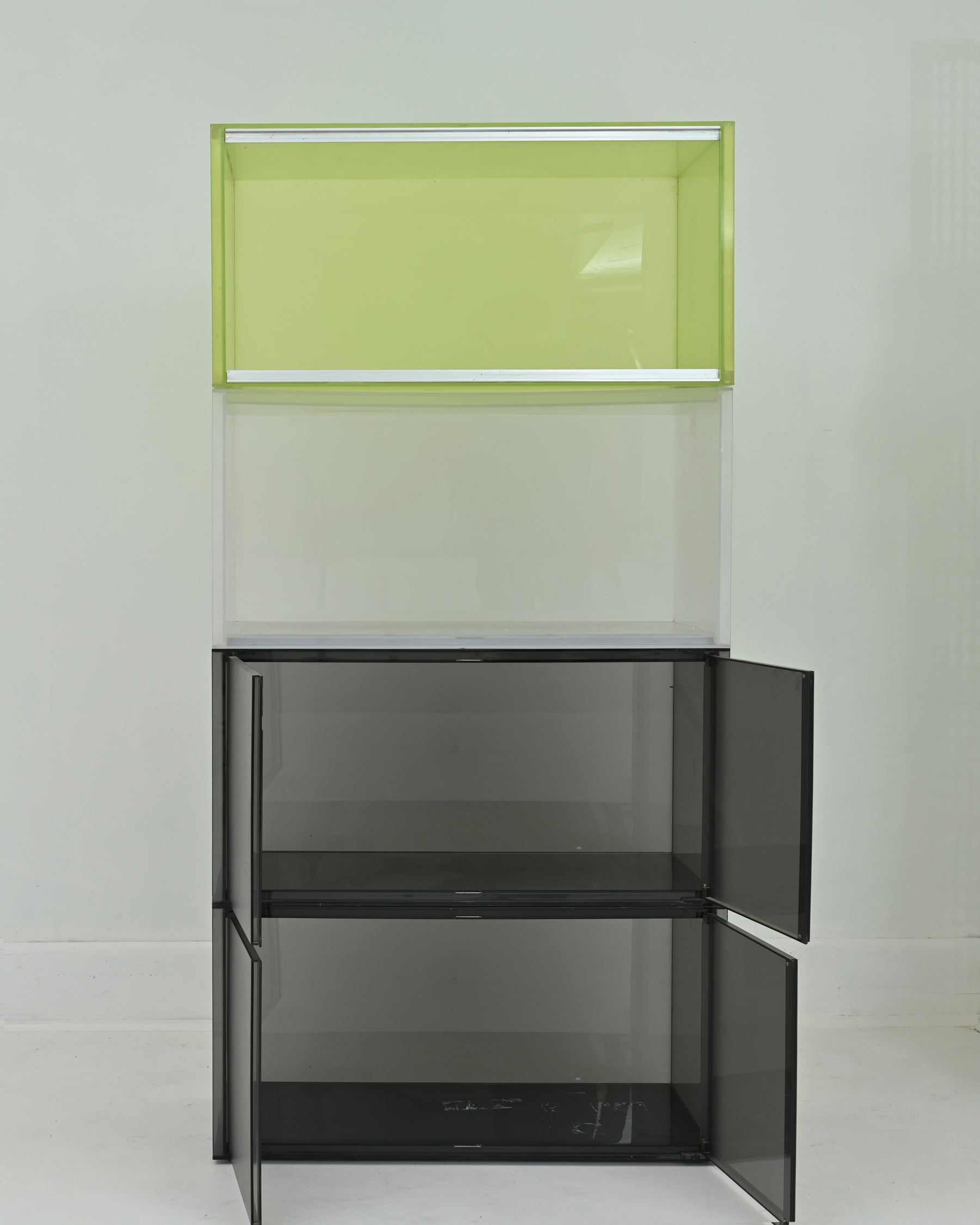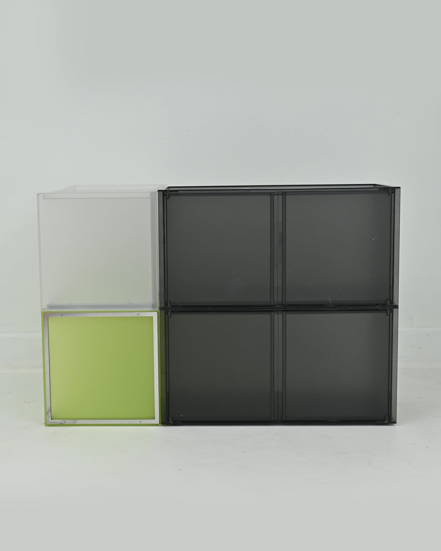 1990s Piero Lissoni’s innovative solution for organizing. Made in Italy. The core element of the One is a container of parallel pipes made of PMMA. Two of the base elements are fitted with doors. The modular pieces can stand alone as a small container, or be attached side-by-side with other elements for a longer console. Metal feet, as well as wheels included.