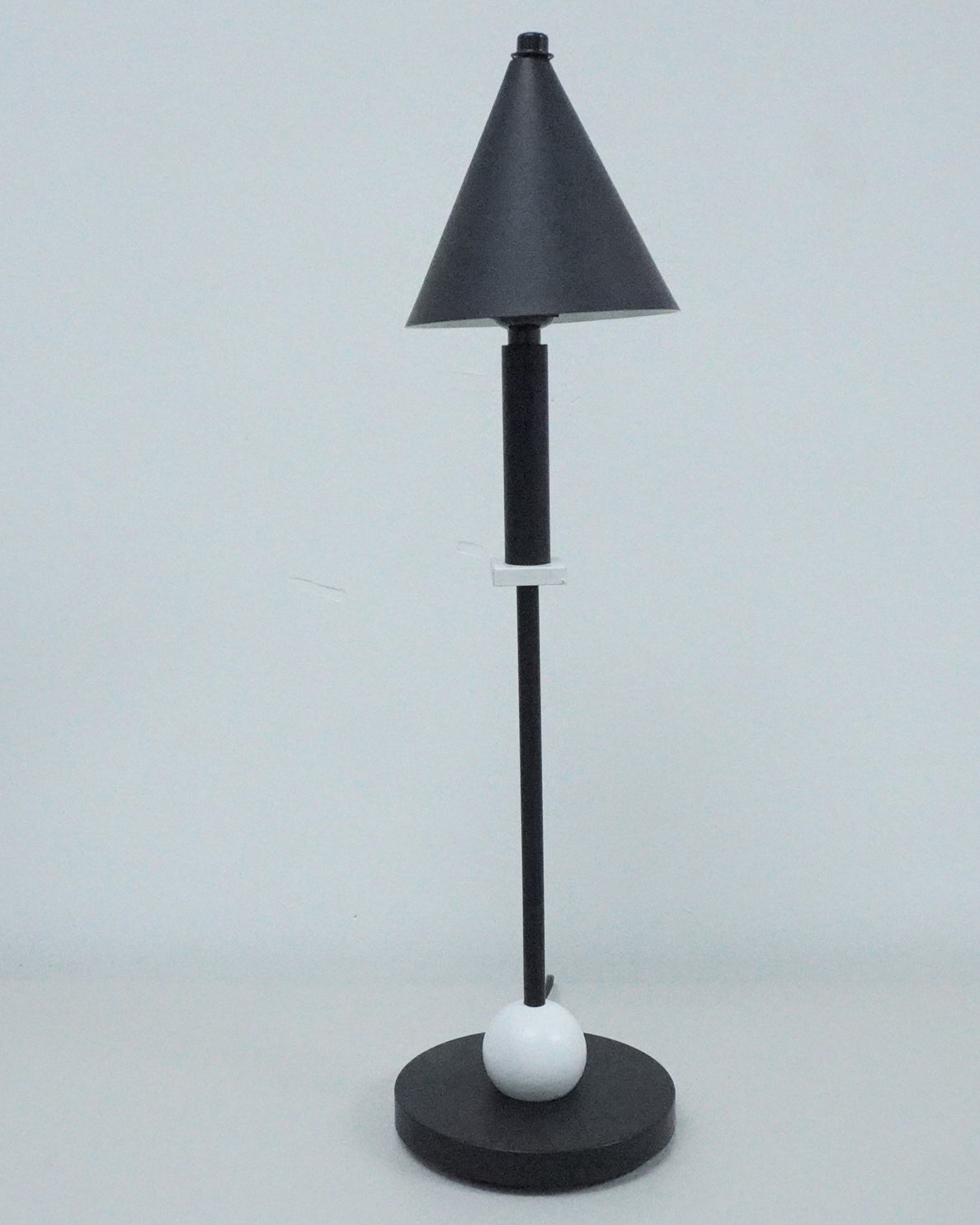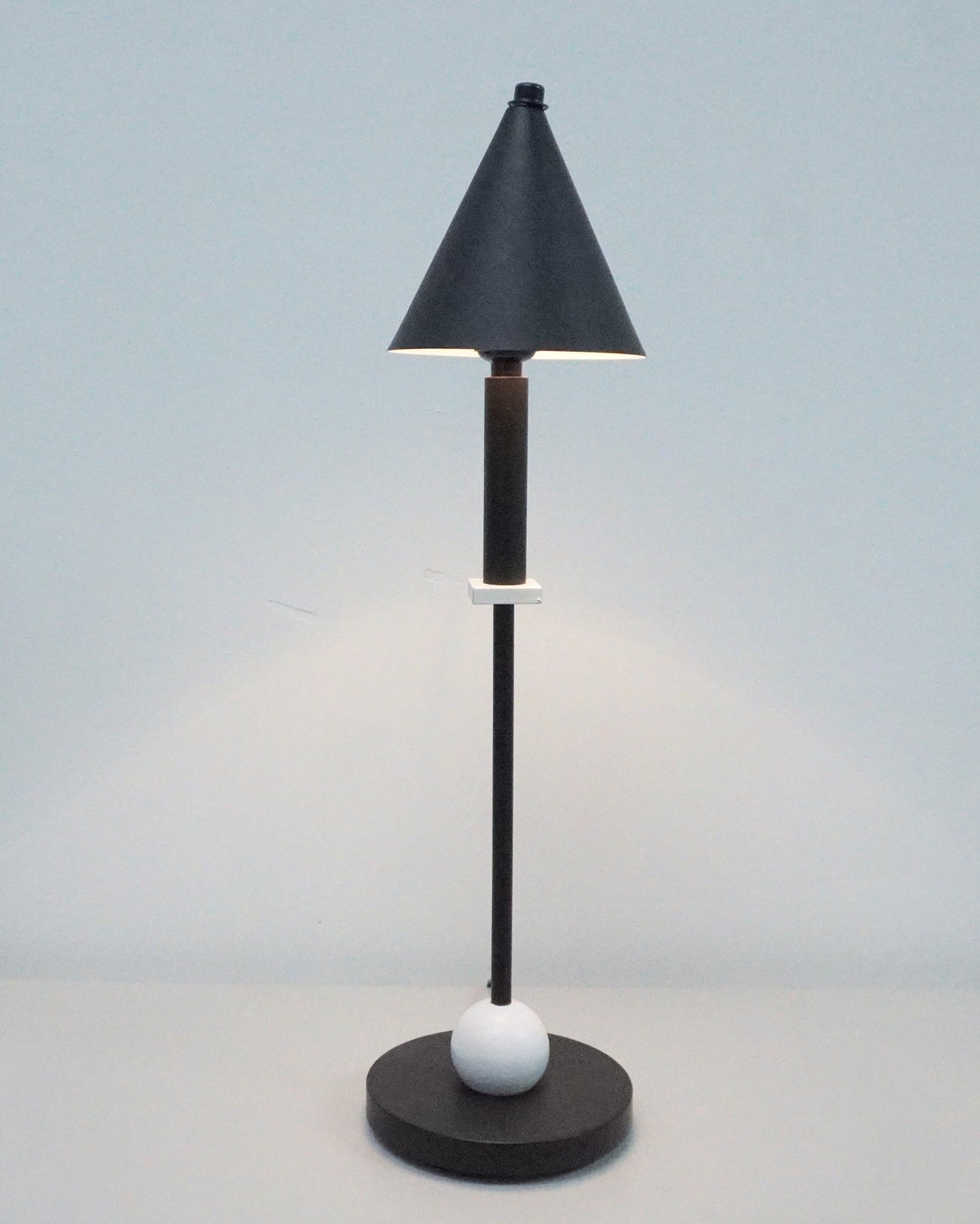 Beautiful postmodern lamp designed in the style of Robert Sonneman for George Kovacs. Metal conical black shade and base with contrasting shapes and finishes.