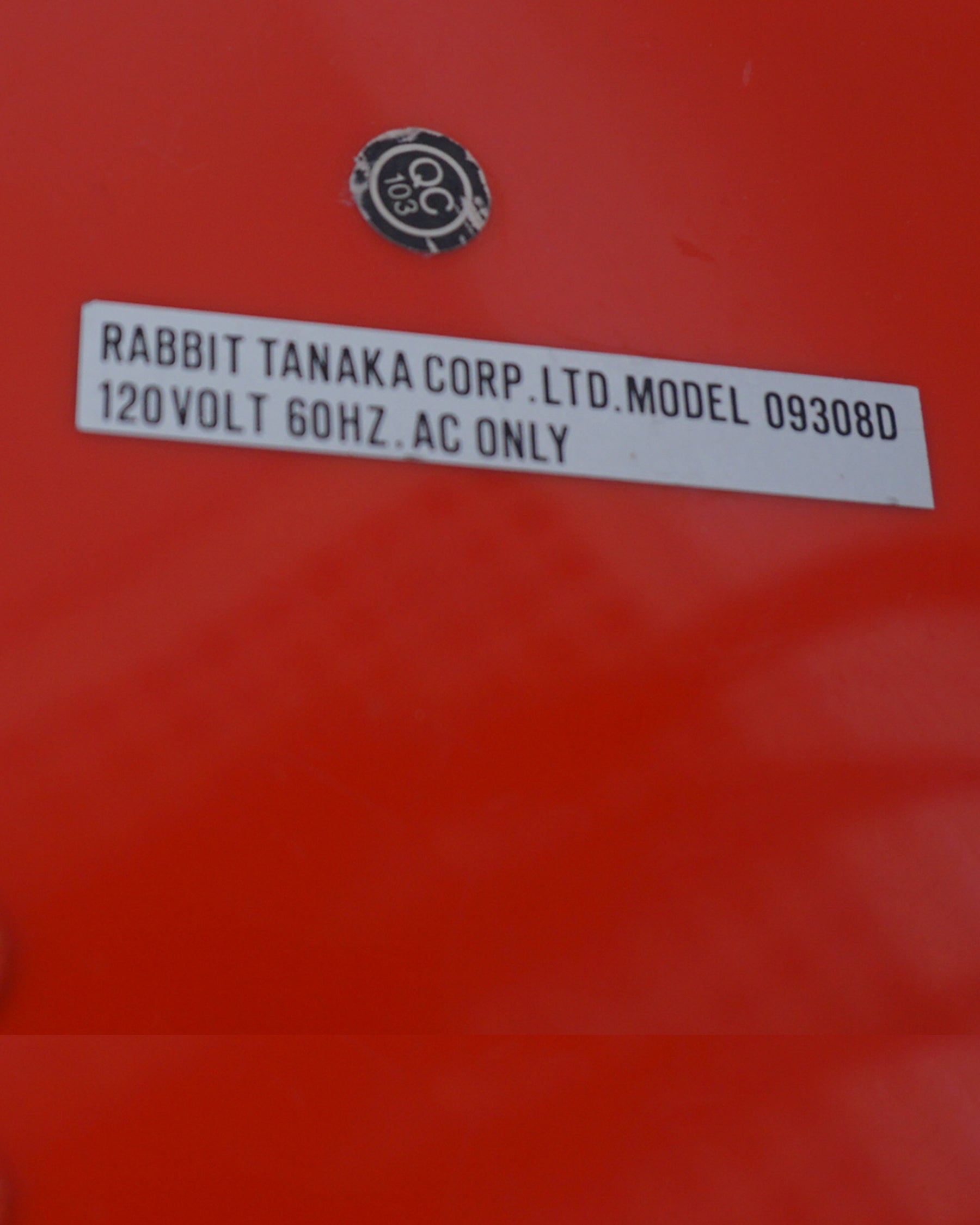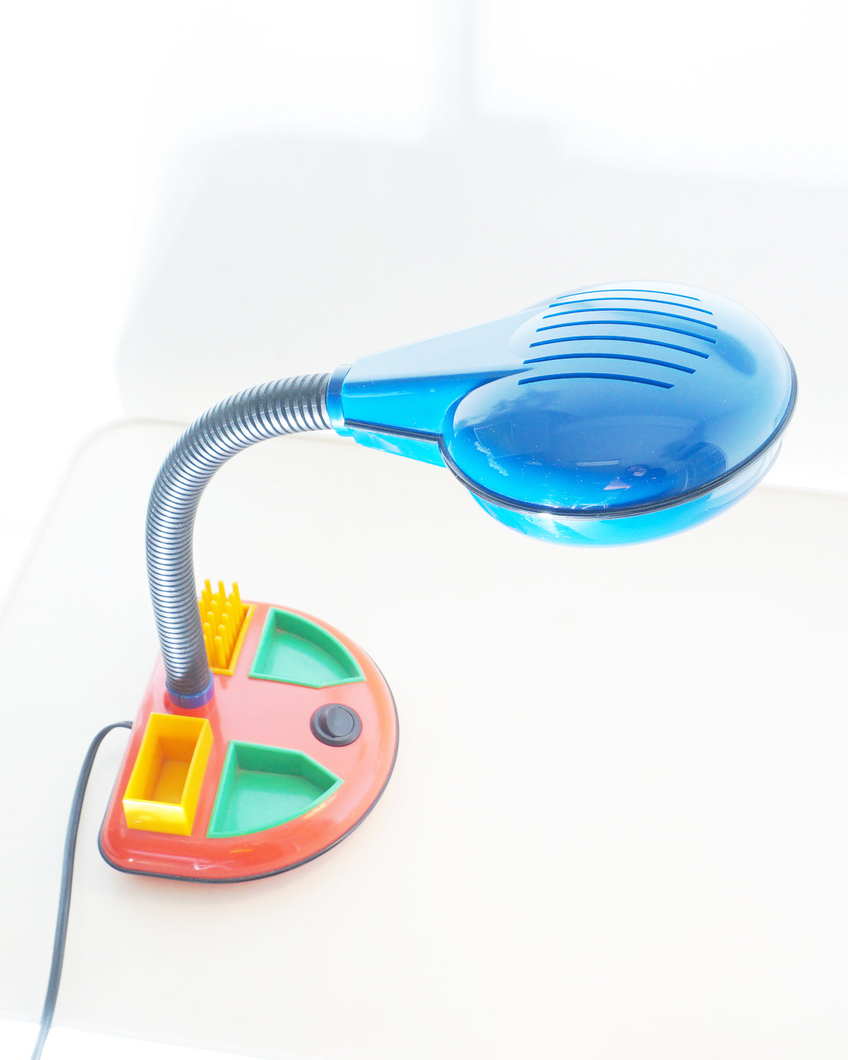 1980s plastic cult favorite, the Rabbit table lamp by Kyoji Tanaka. Features an adjustable goose neck (plastic coil) and organizer base. Great blue, red, yellow, and green colorway. Some small scuffs throughout. Lamp has been fit with a new, appropriate bulb that will last for about two years with average use.